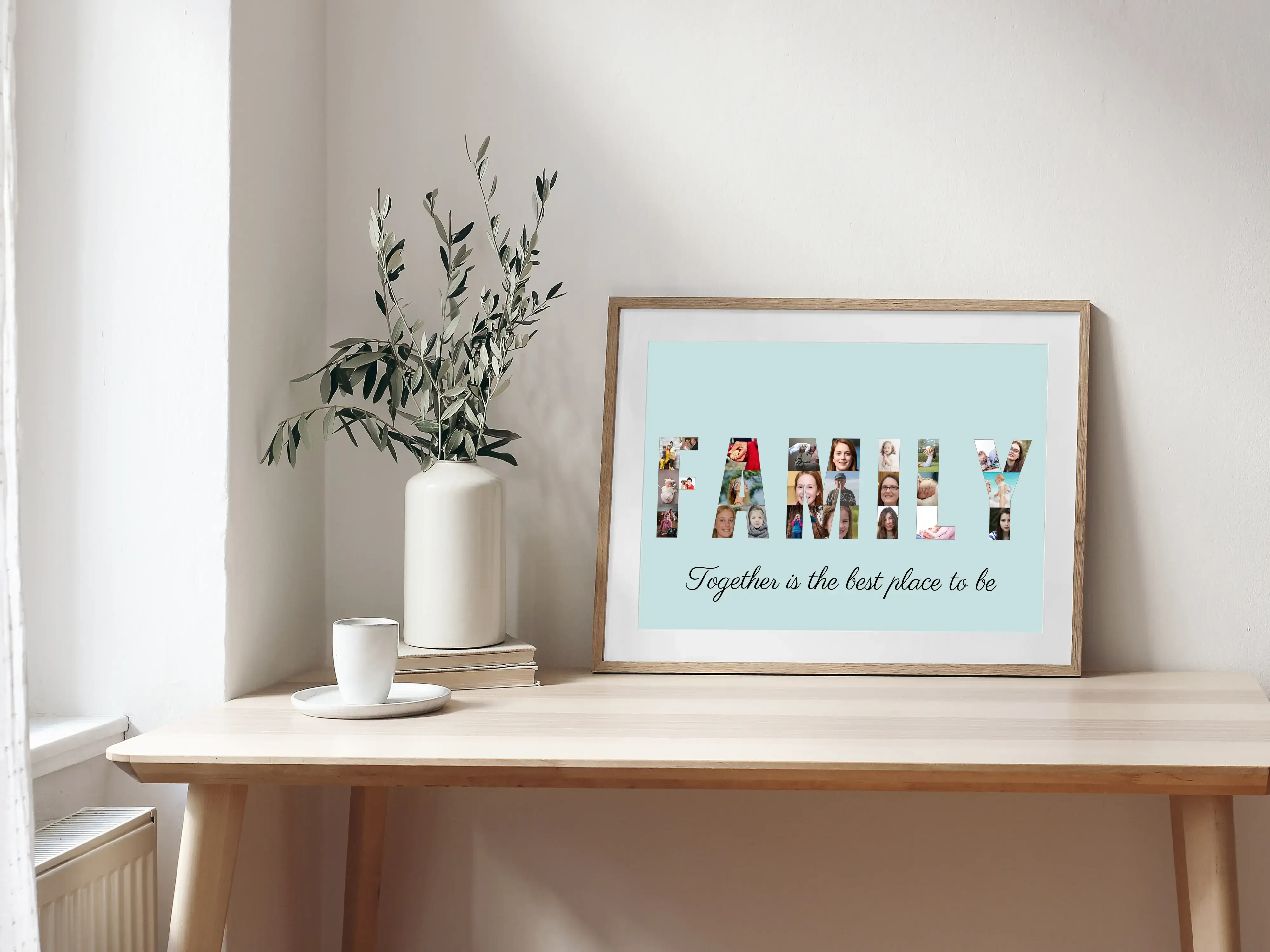 Create your own stunning personalized photo collage featuring the word 'FAMILY' crafted from individual photos. This design showcases cherished moments with a modern turquoise background and the caption "Together is the most beautiful place to be" underneath. Tailored for families wanting to preserve precious memories stylishly, it makes an ideal gift for parents, grandparents, or any family member. You can customize both the photos and text to suit your taste.