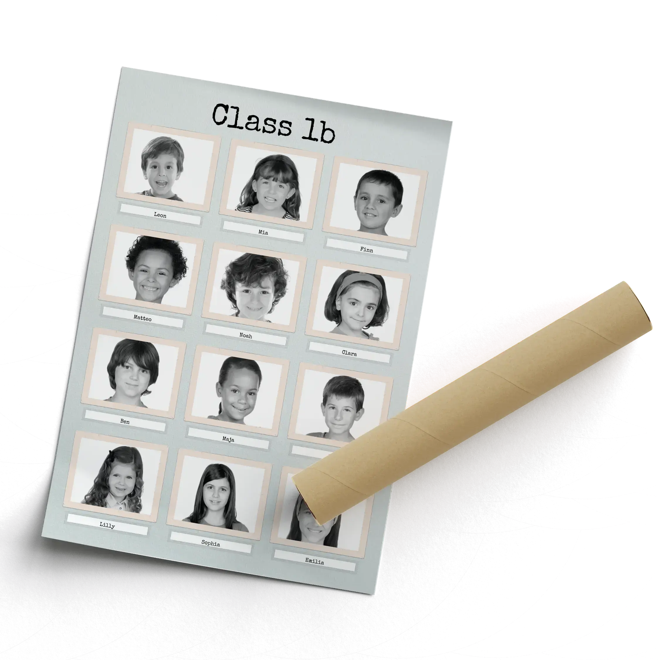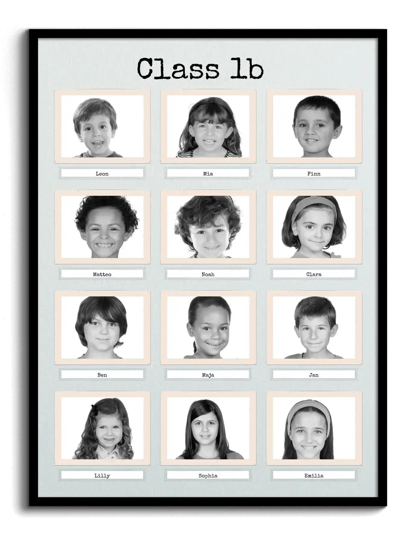 Create your perfect personalized photo collage now! Imagine having a timeless collage of twelve children from a school class or kindergarten group, elegantly captured in a retro black-and-white style. Each photo can be captioned with the children's names, while additional text like "Class 1B" can adorn the top and bottom. This makes an unforgettable gift for teachers or daycare staff, a lovely showcase in classrooms, or a cherished keepsake for parents. All photos, names, texts, colors, and layouts are yours to customize.