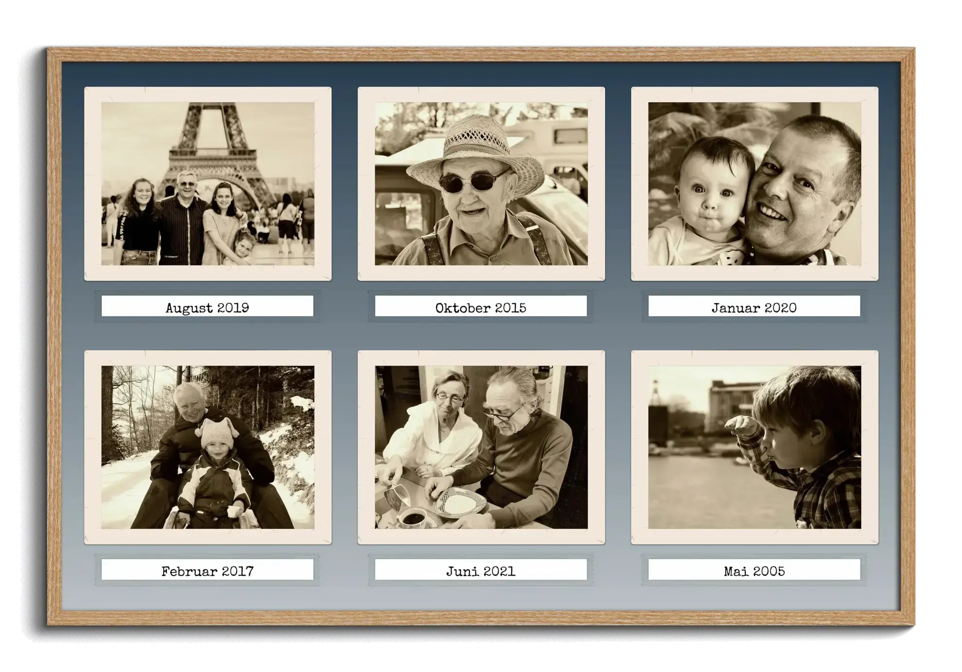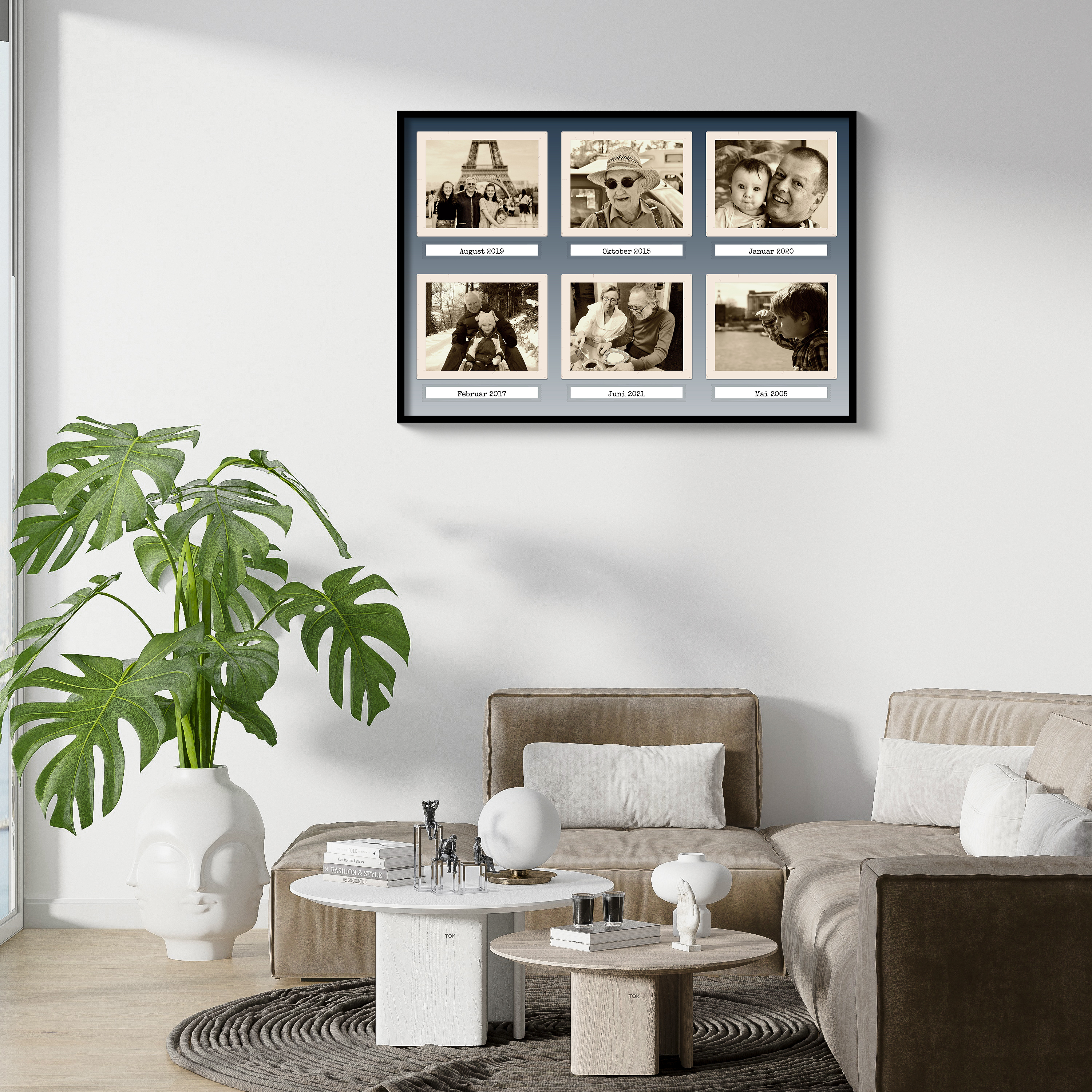 Create a personalized photo collage masterpiece today! Our stunning retro and vintage-style poster is designed to showcase your cherished memories with a unique touch. Featuring six Polaroid-inspired photos that you can individually caption, this collage is perfect for presenting special moments in a stylish way. Customize it with your favorite pictures and texts to make it truly yours.