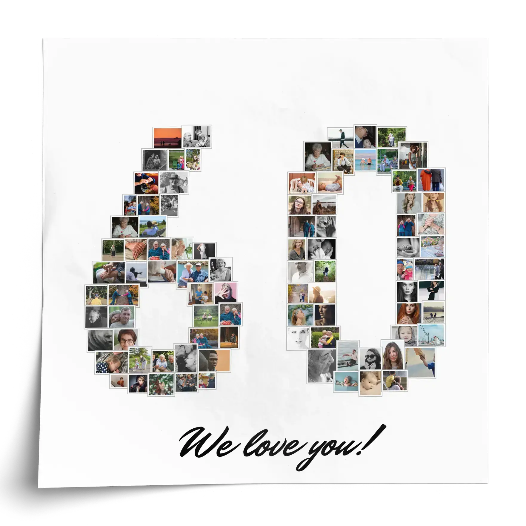 Create your own stunning photo collage today! Our customizable collage featuring the number '60' made up of your treasured photos is perfect for celebrating a milestone like a 60th birthday or retirement. Choose from 1-100 images depending on your selected template to craft a thoughtful, personalized gift.