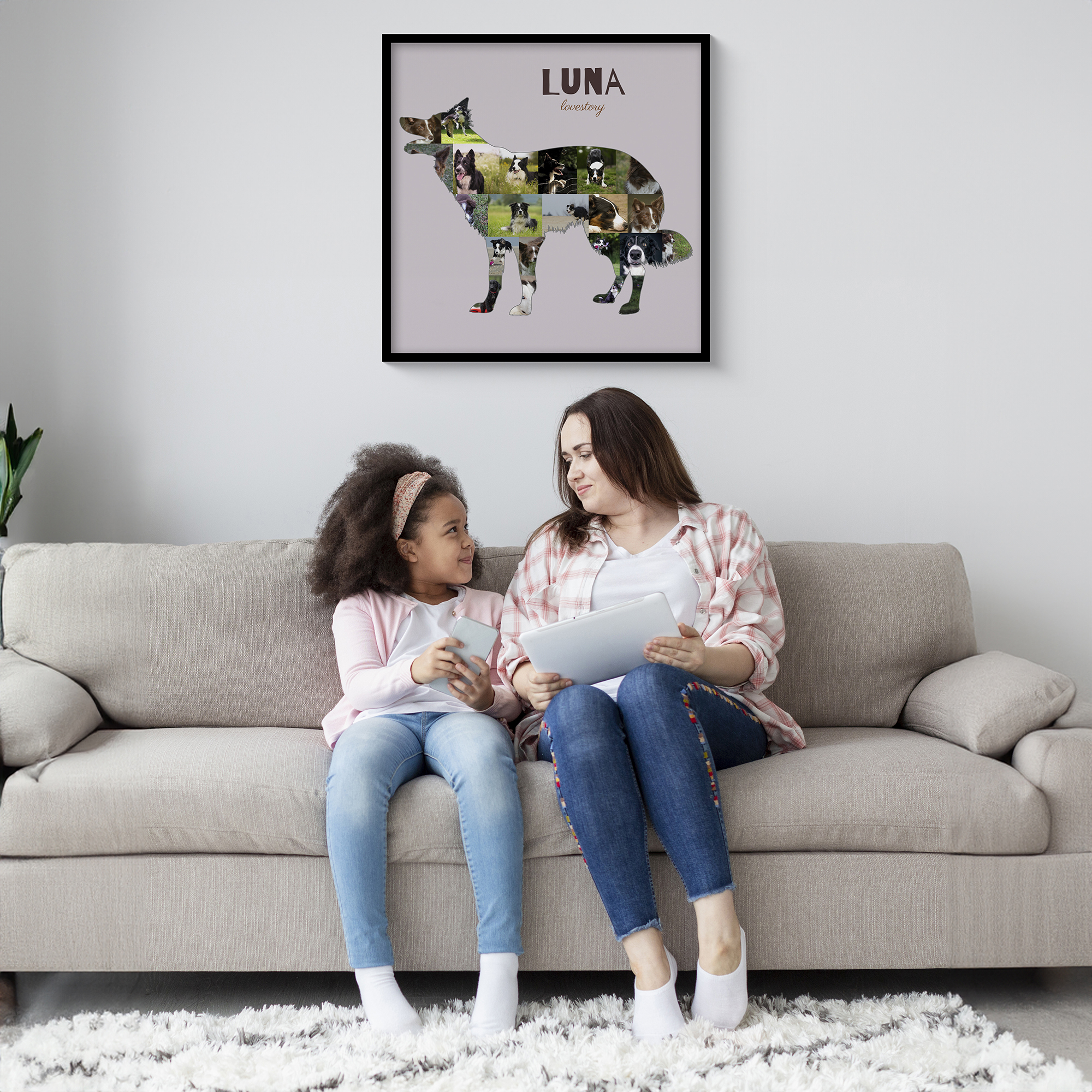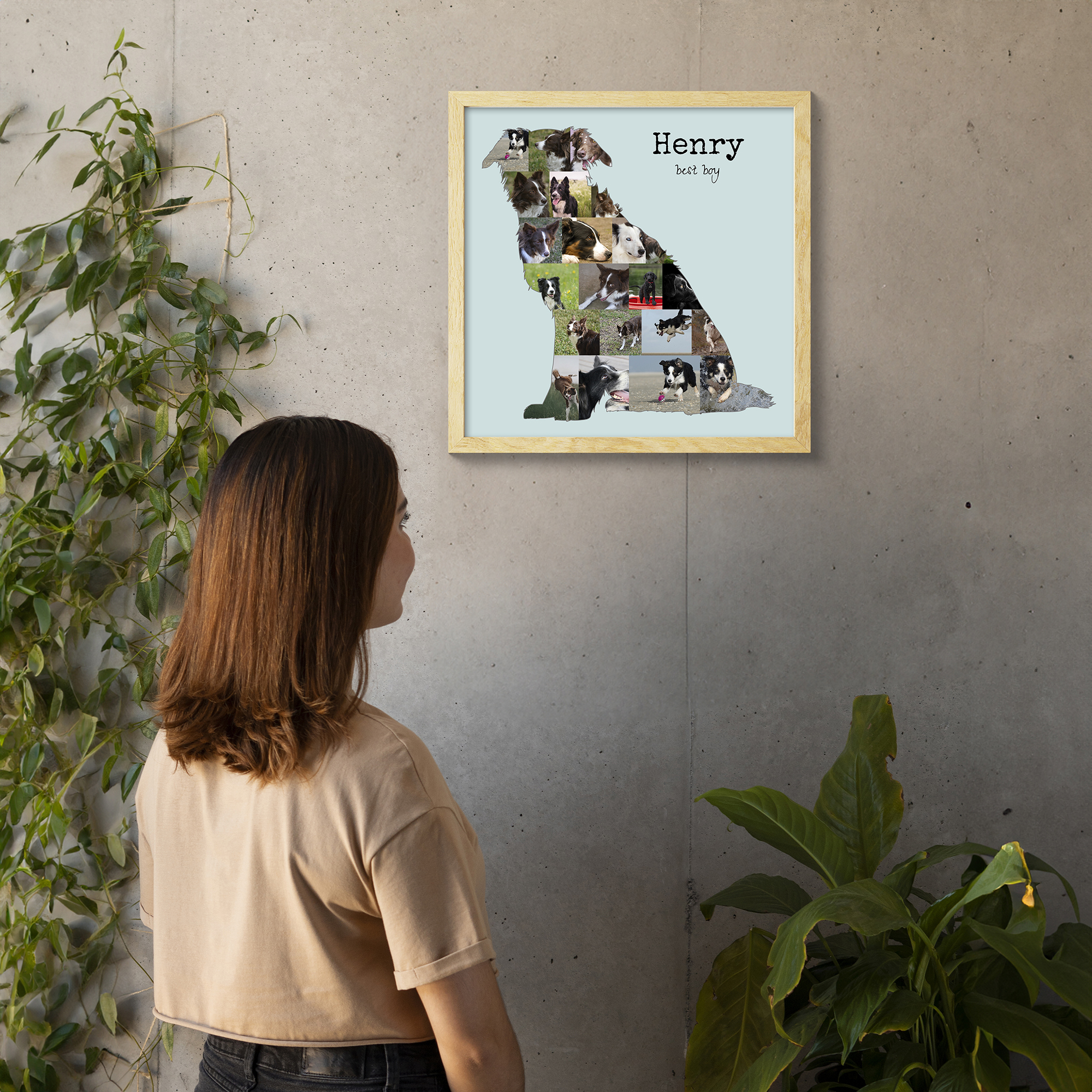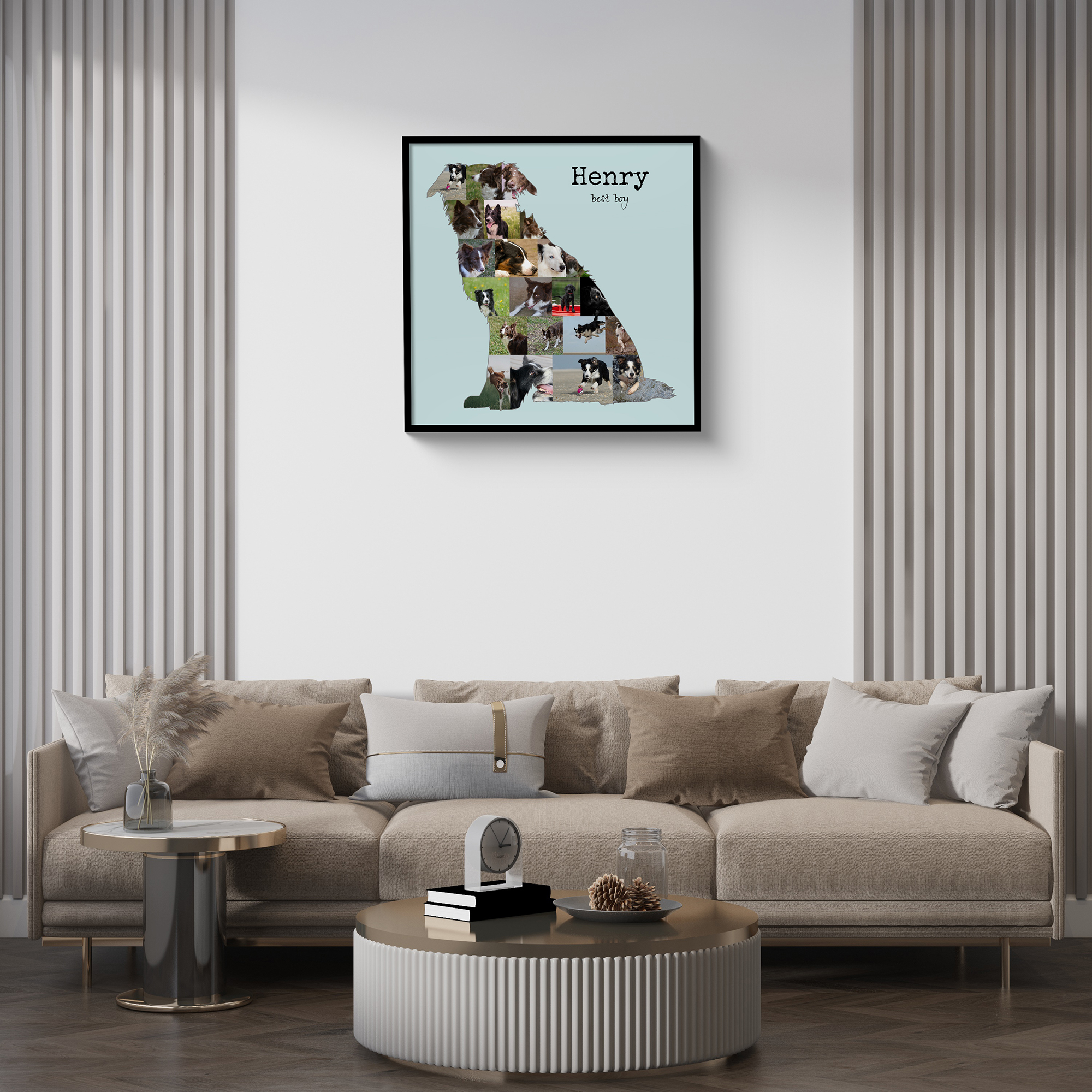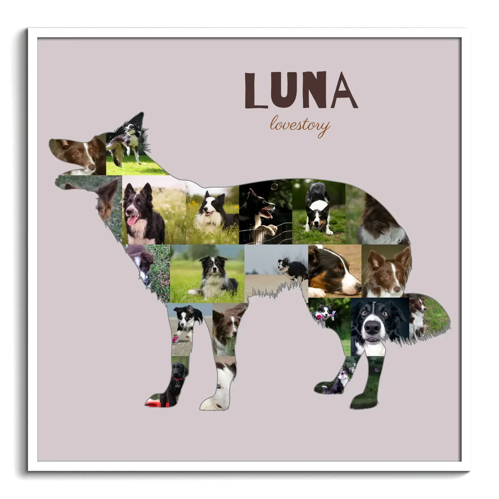 Create a one-of-a-kind keepsake with our customizable photo collage featuring the beloved Border Collie silhouette. This collage is designed specifically for dog owners who want to capture the unique personality of their four-legged friend. Fill the playful silhouette with 15-20 of your own cherished photos and add a personal touch with custom text like "lovestory" or "best boy". Whether you're decorating your home or gifting someone with a special memory, this collage is perfect for celebrating the joy and love a Border Collie brings.