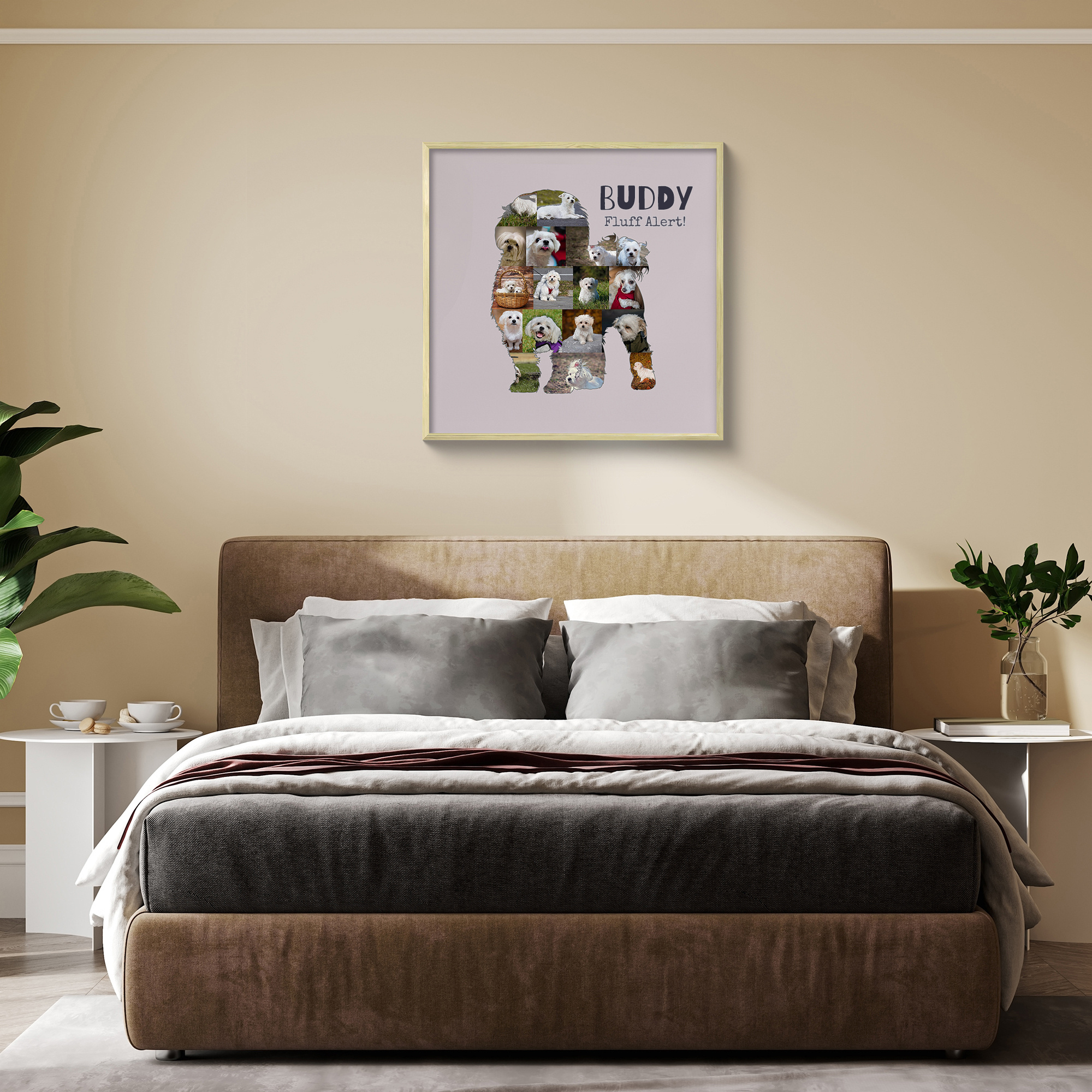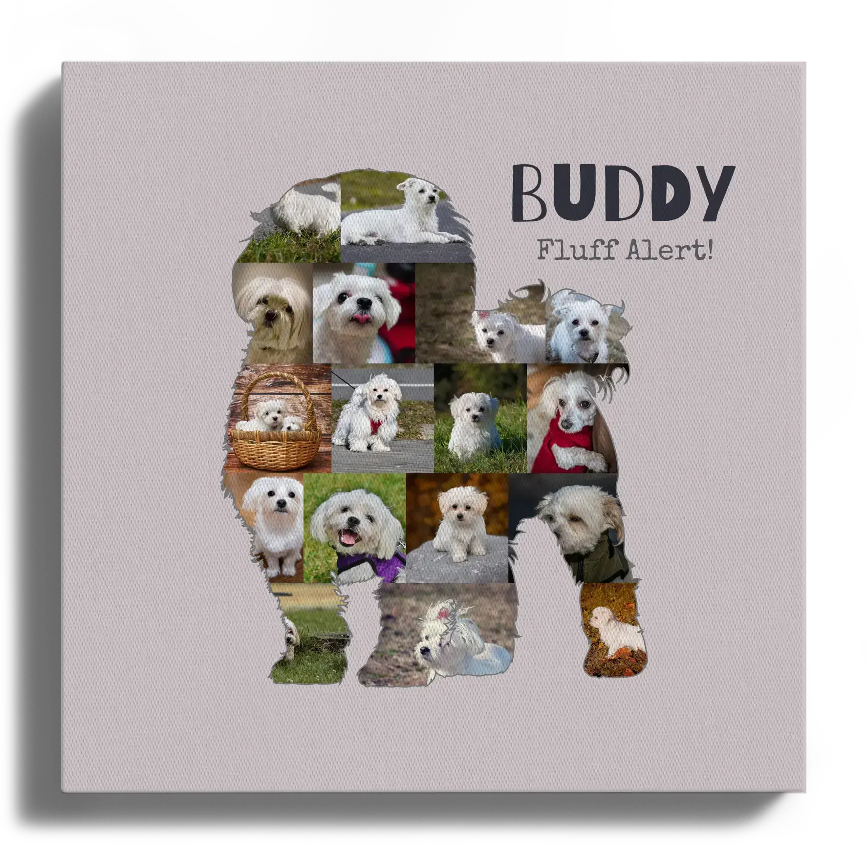 Create a personalized masterpiece with our unique dog silhouette photo collage, designed exclusively for Maltese lovers. This creative product allows you to fill the silhouette of a sitting or standing Maltese with 15-20 of your own cherished photos. Add a personal touch with custom text, such as "Fluff Alert" or "Cotton Candy with Eyes." It's the perfect decorative piece for your home or a thoughtful gift for friends and family. Tailor your collage with customized photos, silhouette choices, colors, and text to capture the essence of your furry friend.