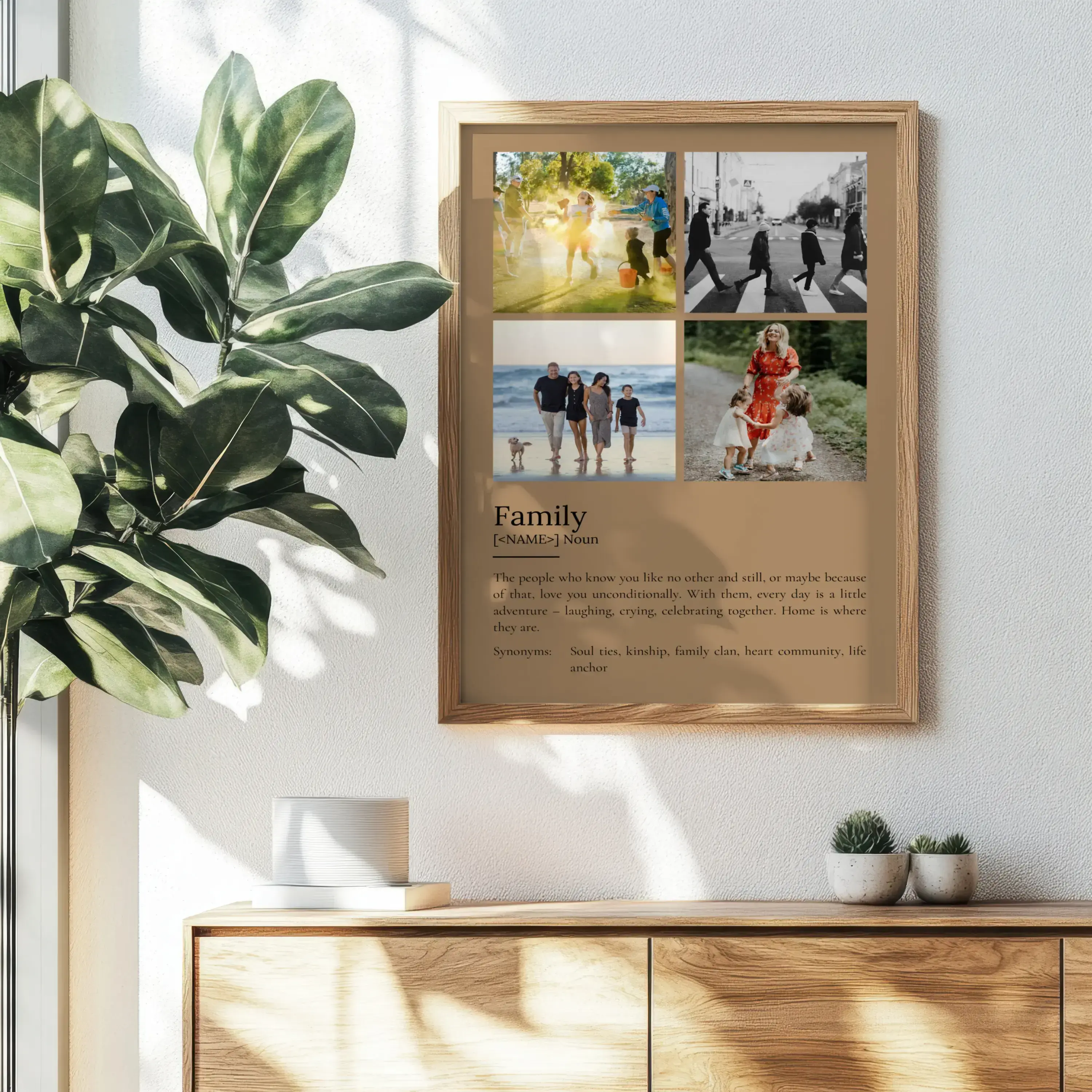 Create a unique family tribute with our customizable Photo Collage Poster, especially designed to encapsulate the essence of family. With the option to include up to 9 of your cherished photos, this personalized gift features a heartwarming definition of family that you can tailor to fit your sentiment and style. Imagine capturing those bonds that truly make a family what it is, in your own words, colors, and photos.