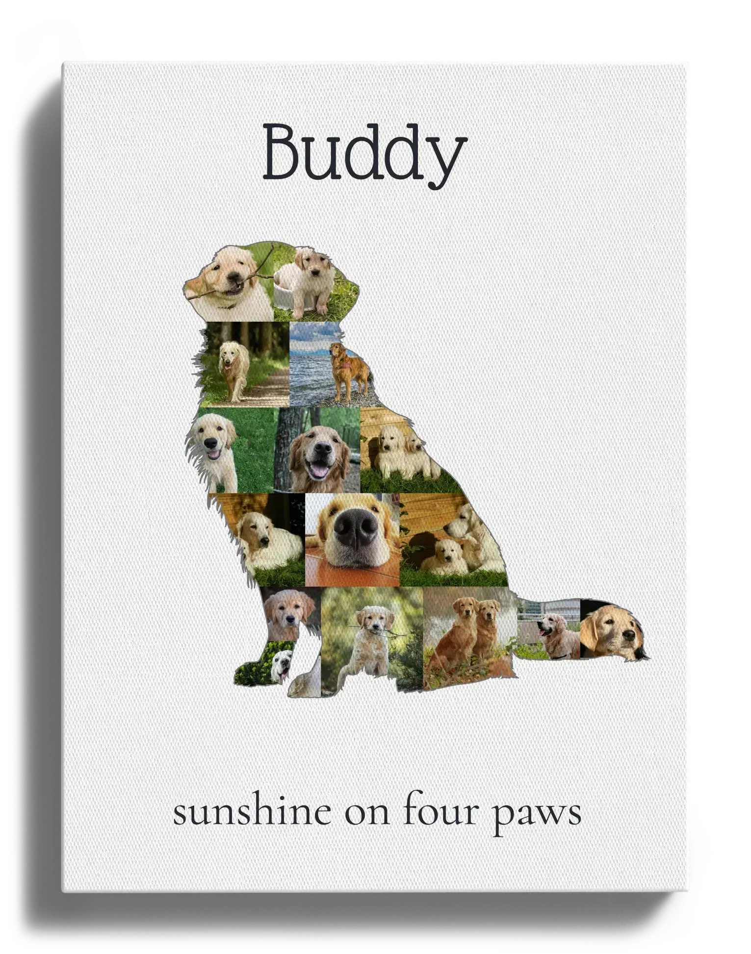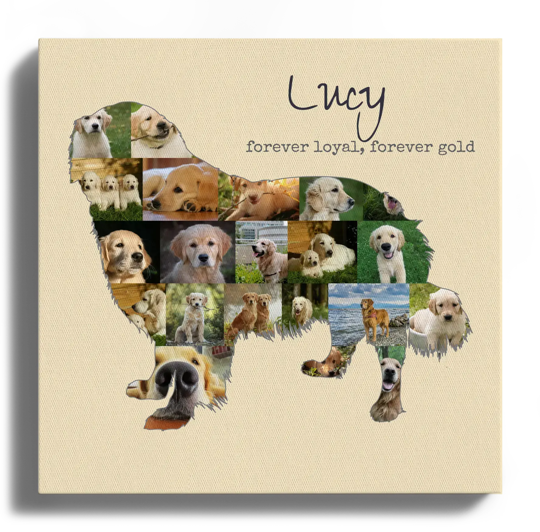Create a cherished keepsake with our personalized Golden Retriever photo collage. Celebrate your furry friend with a silhouette design, filled with 15-20 of your favorite photos. Personalize it further with a heartfelt text like "forever loyal, forever gold" or "sunshine on four paws." This collage makes a wonderful decorative piece for your home or a thoughtful gift for fellow dog lovers. Customize the photos, silhouette, colors, and text to make it truly unique.