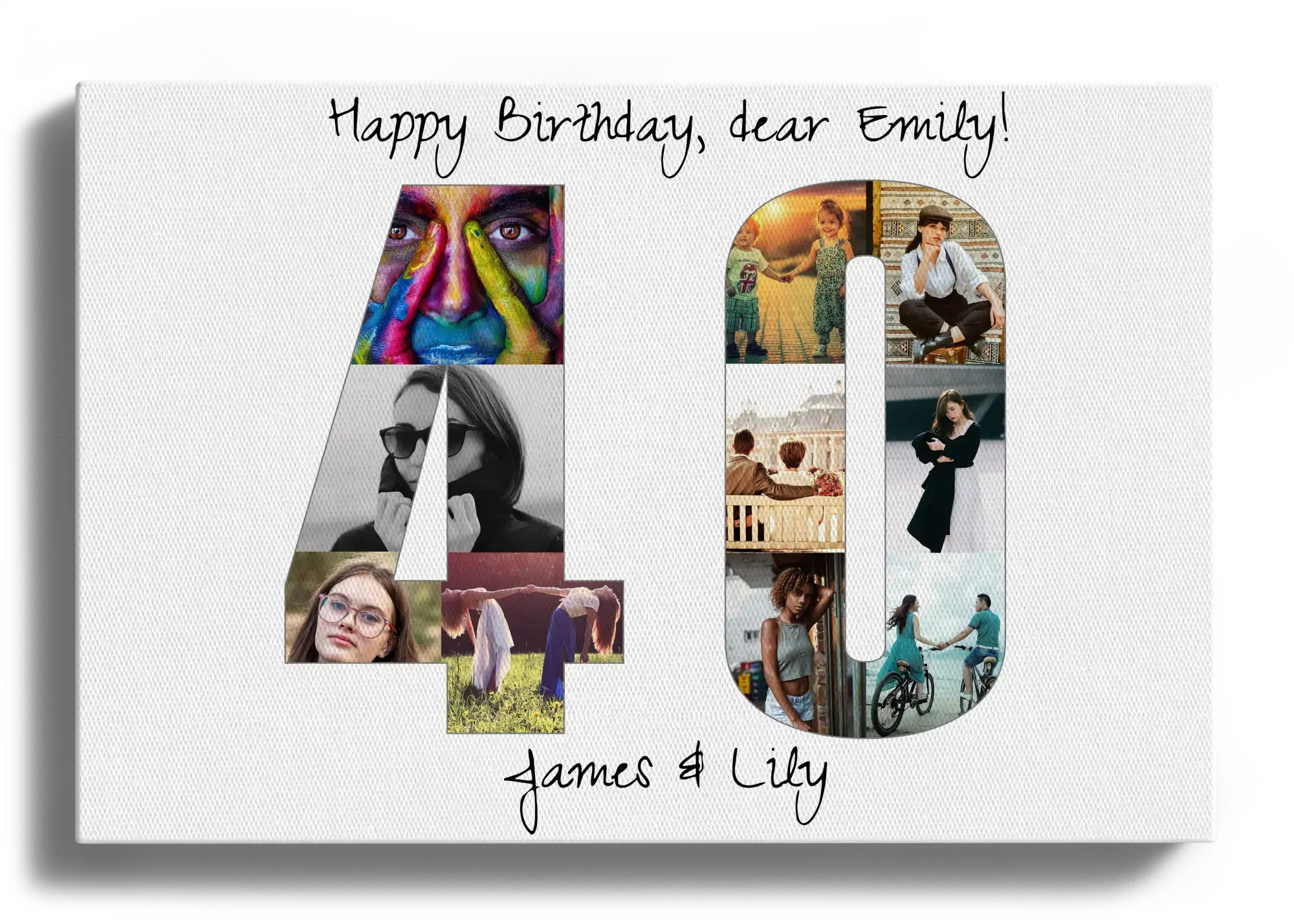 Create a stunning personalized photo collage that captures your cherished memories beautifully. This example features the number '40' crafted from numerous photos, making it an ideal gift for a 40th birthday, a company’s 40th anniversary, or a milestone wedding anniversary. Depending on your chosen template and number, you can use between 1 and 100 images to craft this unique commemorative piece. Order it as a poster, framed art, canvas, acrylic print, Alu-Dibond, or download.