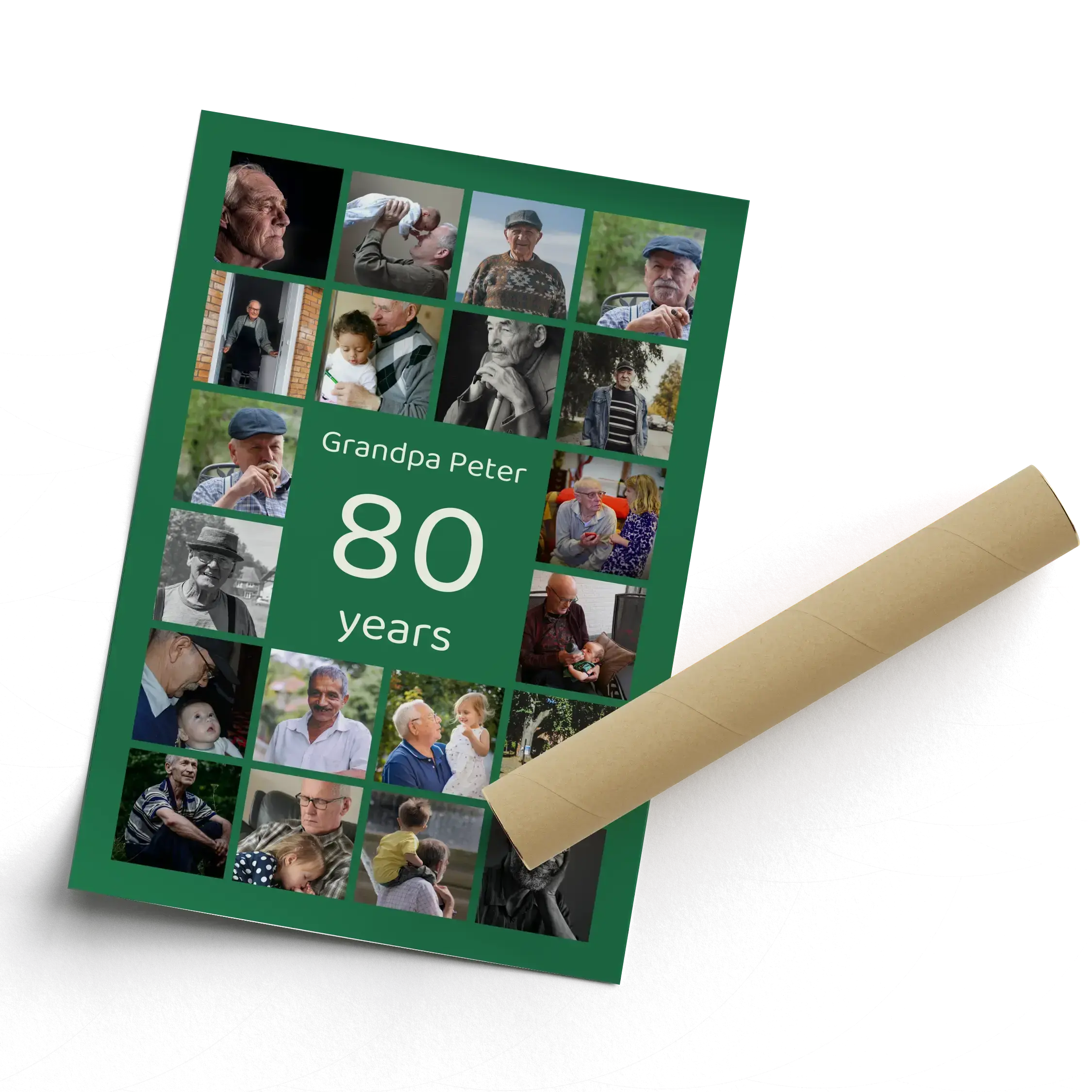 Create yours now. Mark 80 years with a Jubilee Number Collage: a big 80 in the center, a name above, a personal greeting below, framed by 20–80 photos in a clean grid. Customize number, name, message, image count, background, colors, and orientation. Perfect for an 80th birthday, 80 years married, or an 80-year company jubilee.