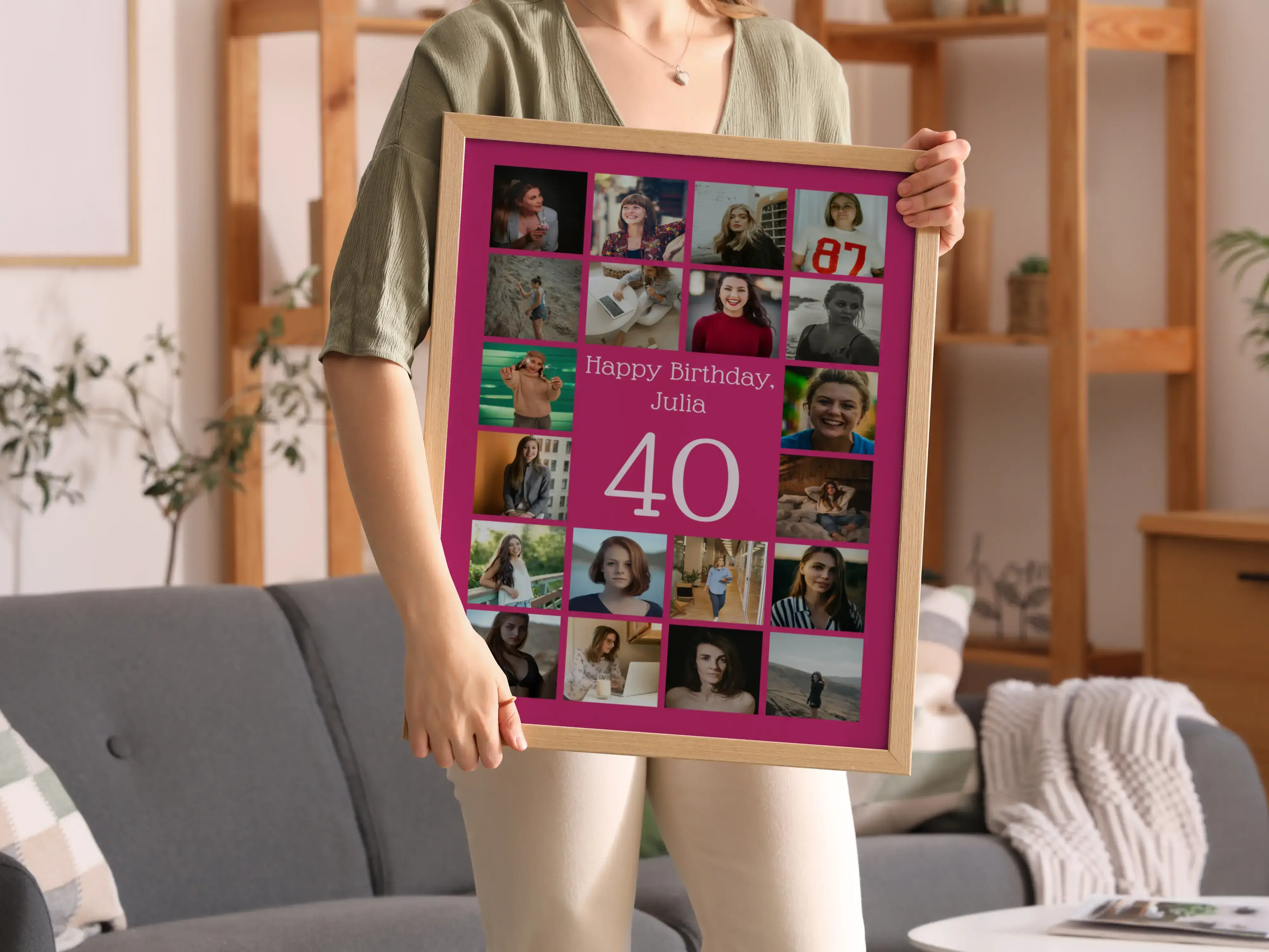 Perfect for a 40th birthday, a ruby wedding anniversary, 40 years of friendship, a 40-year work jubilee, or a company milestone. Turn highlights from four decades into a single piece that tells the story. Need a different number? Switch to 18, 21, 30, 50, or any year or age in seconds.