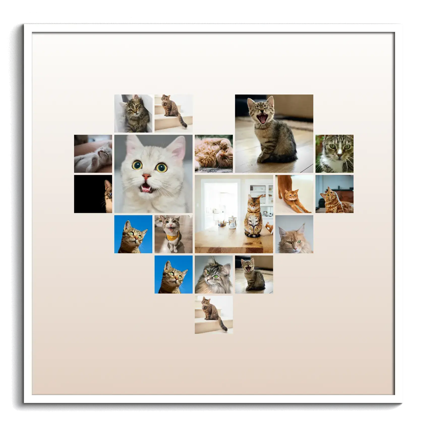 Create your custom heart collage now. Turn your cat photos into a sweet heart-shaped artwork in minutes: pick the Heart template, upload your favorite shots from kitten days to couch naps, add a title like Unser Liebling or the name, tweak colors and spacing, and choose the perfect print size.