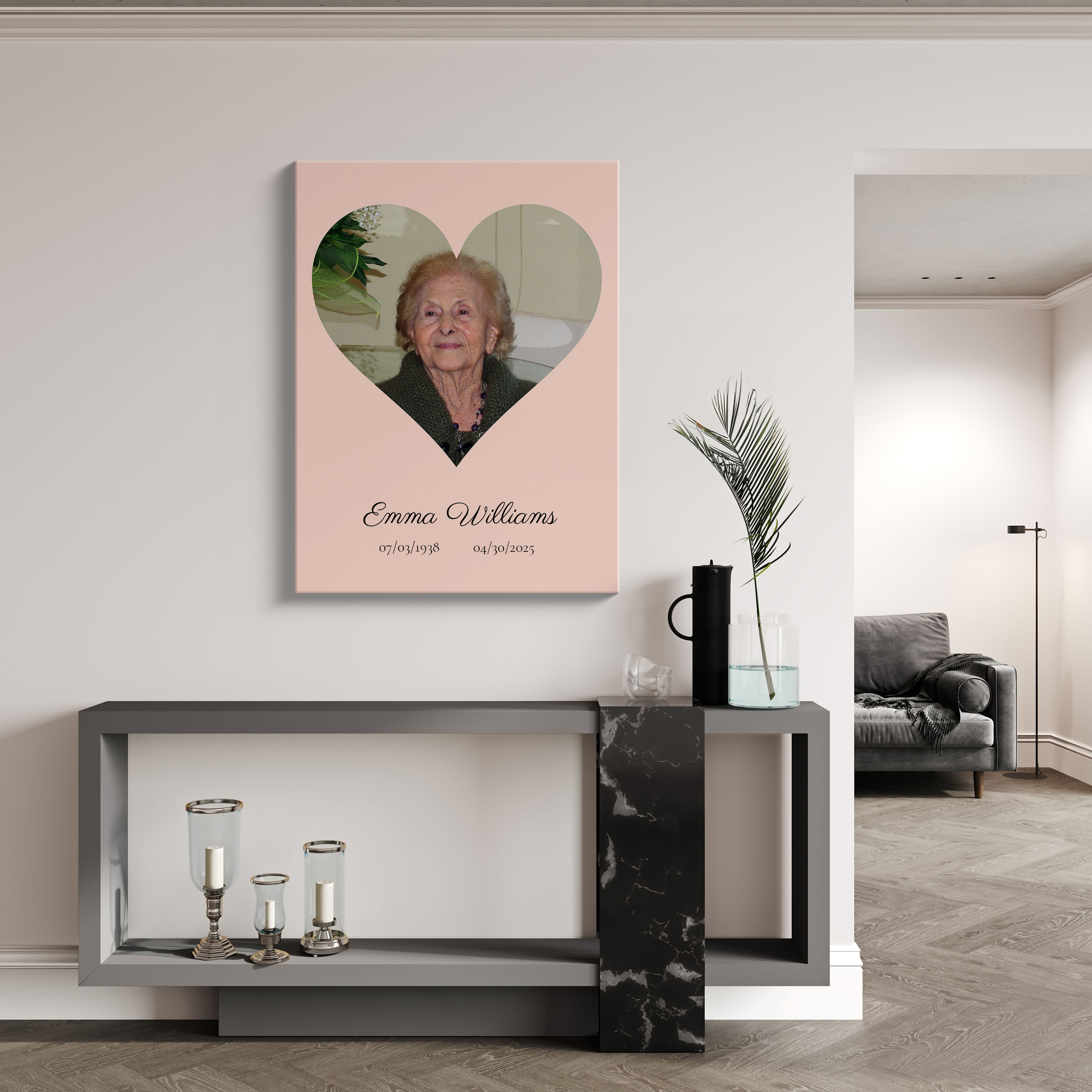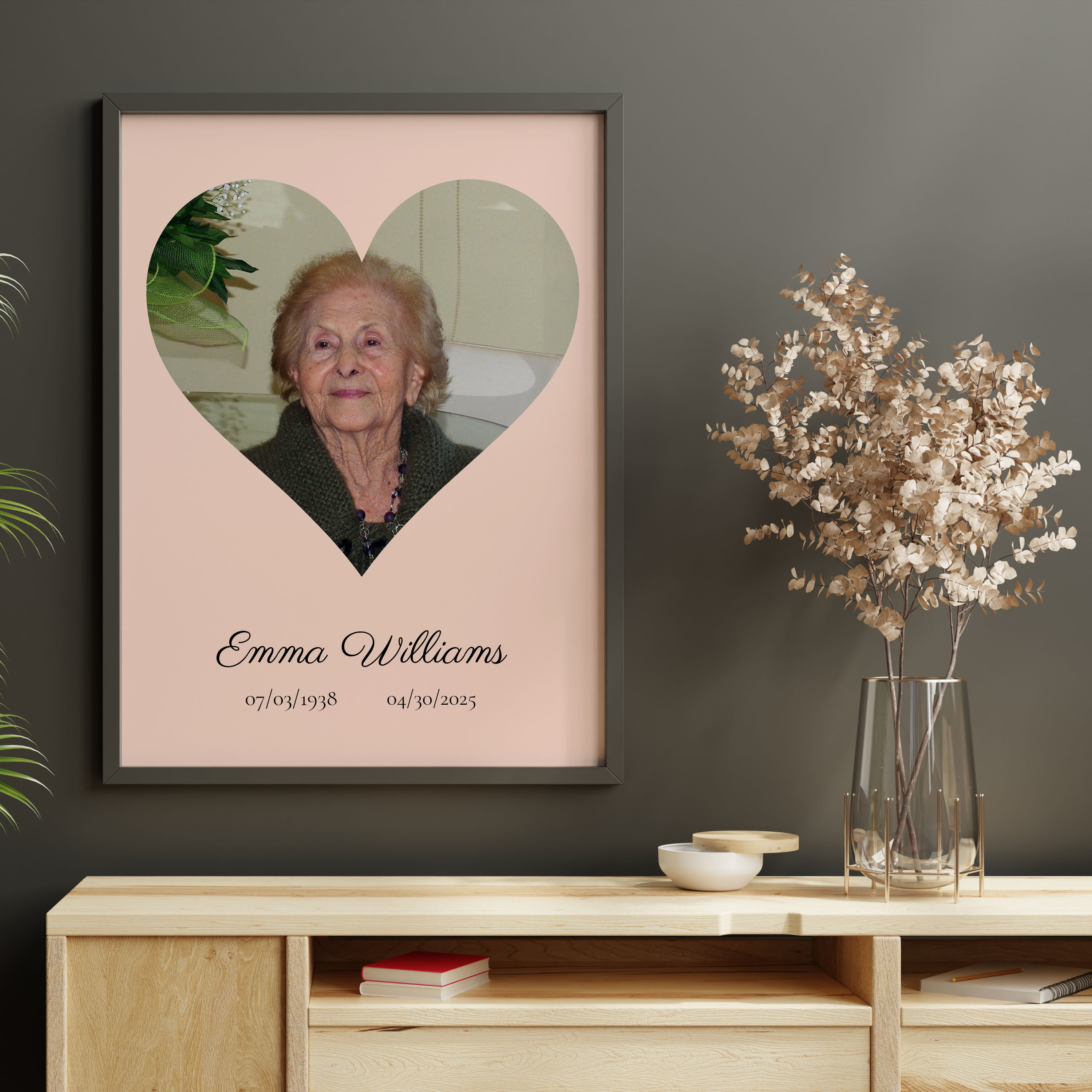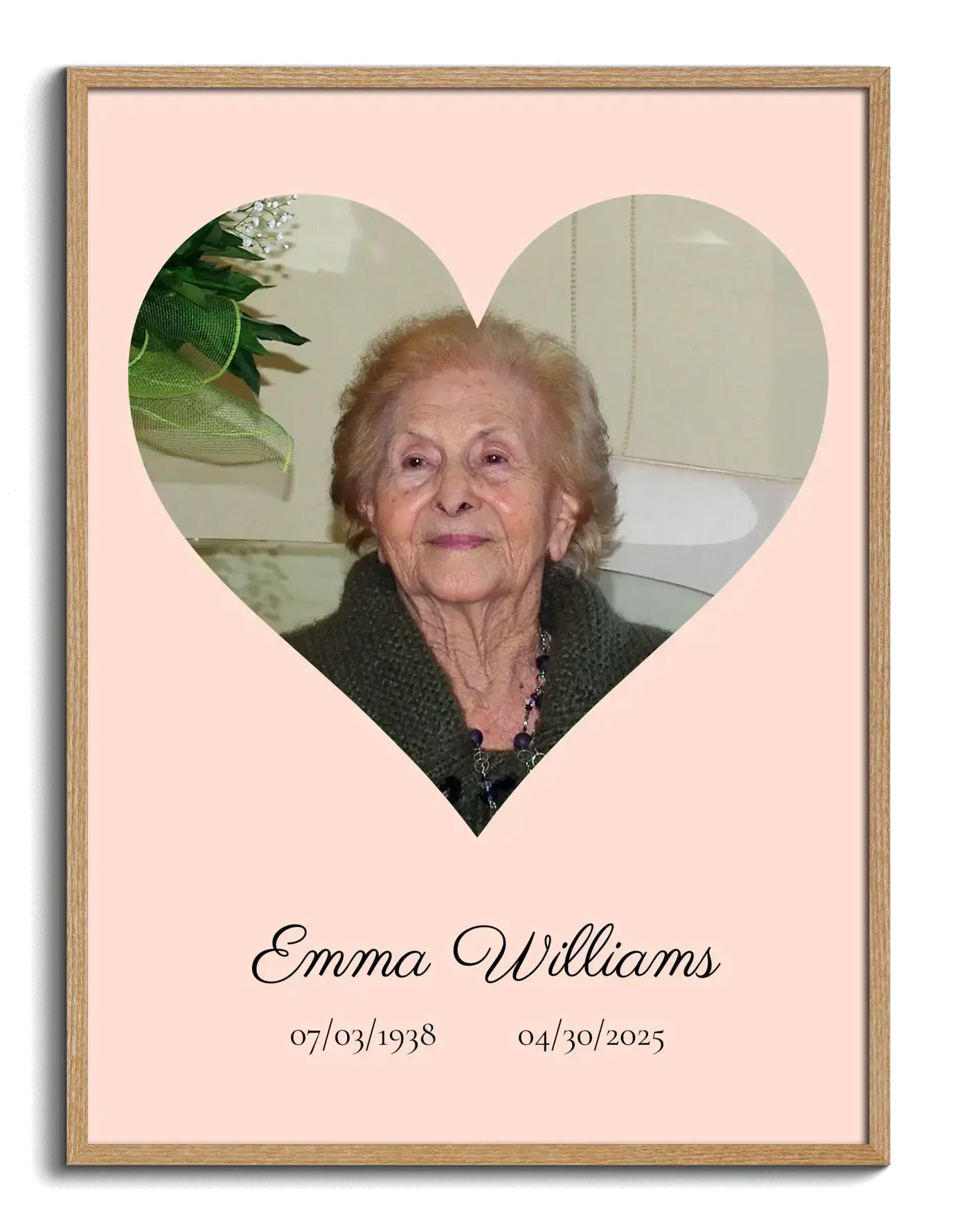 Create a heartfelt tribute to a cherished loved one with our personalized heart-shaped memorial collage. Featuring a portrait of the person in a delicate heart design, it includes their name, birth and passing dates against a soft pink background. Perfect for family and friends, this piece serves as a touching remembrance or decorative element for a memorial service. You have the freedom to customize the photo, names, dates, font, and layout to ensure it reflects your personal sentiment.