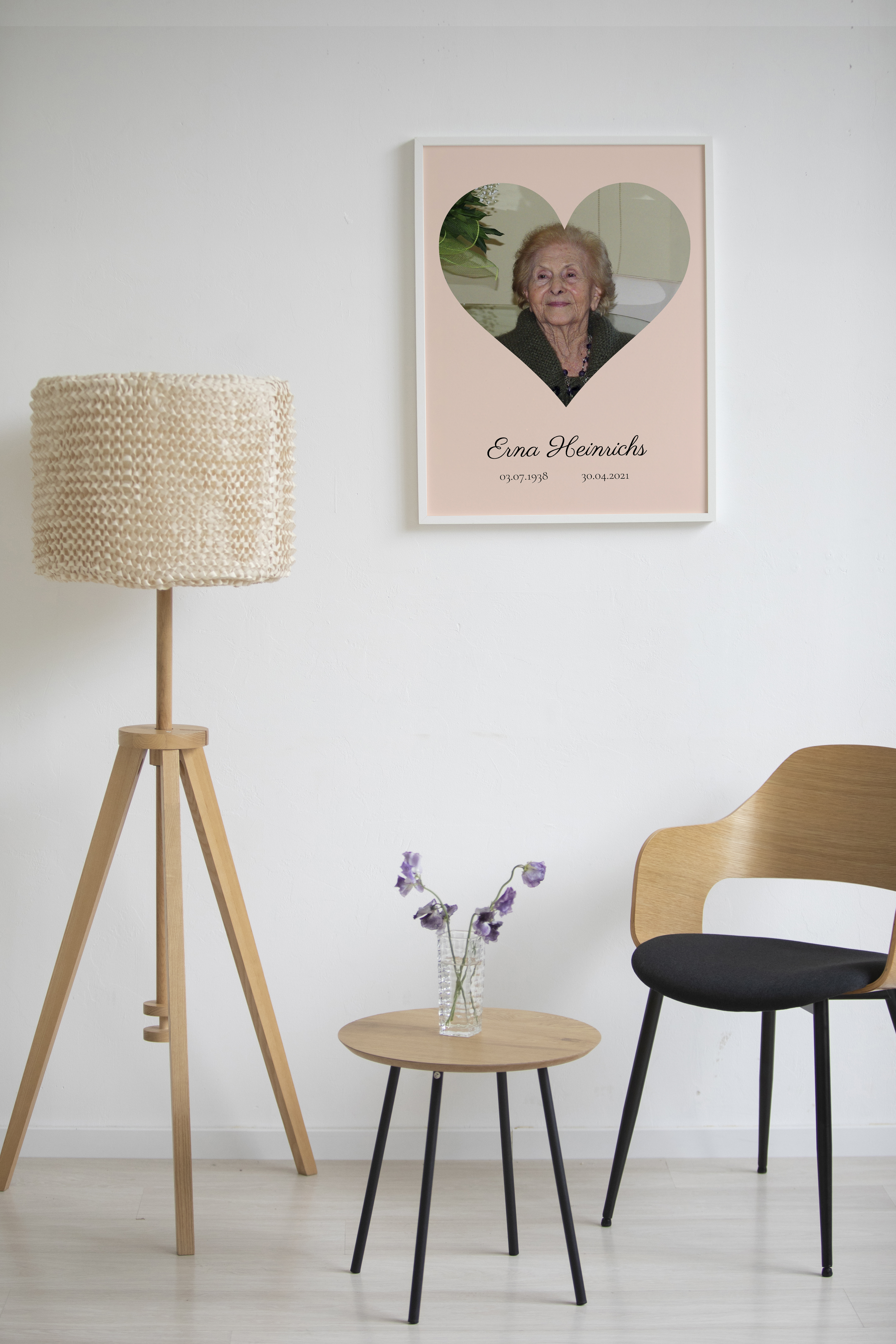 We use premium materials to guarantee that your memorial piece is of the highest quality. Options include seidenmatte posters with UV protection, framed prints in black, white, or natural wood, sturdy canvas, sleek acrylic, durable Alu-Dibond with UV laminate, and lightweight foam boards. For digital options, you can also download a high-resolution JPG right after ordering.