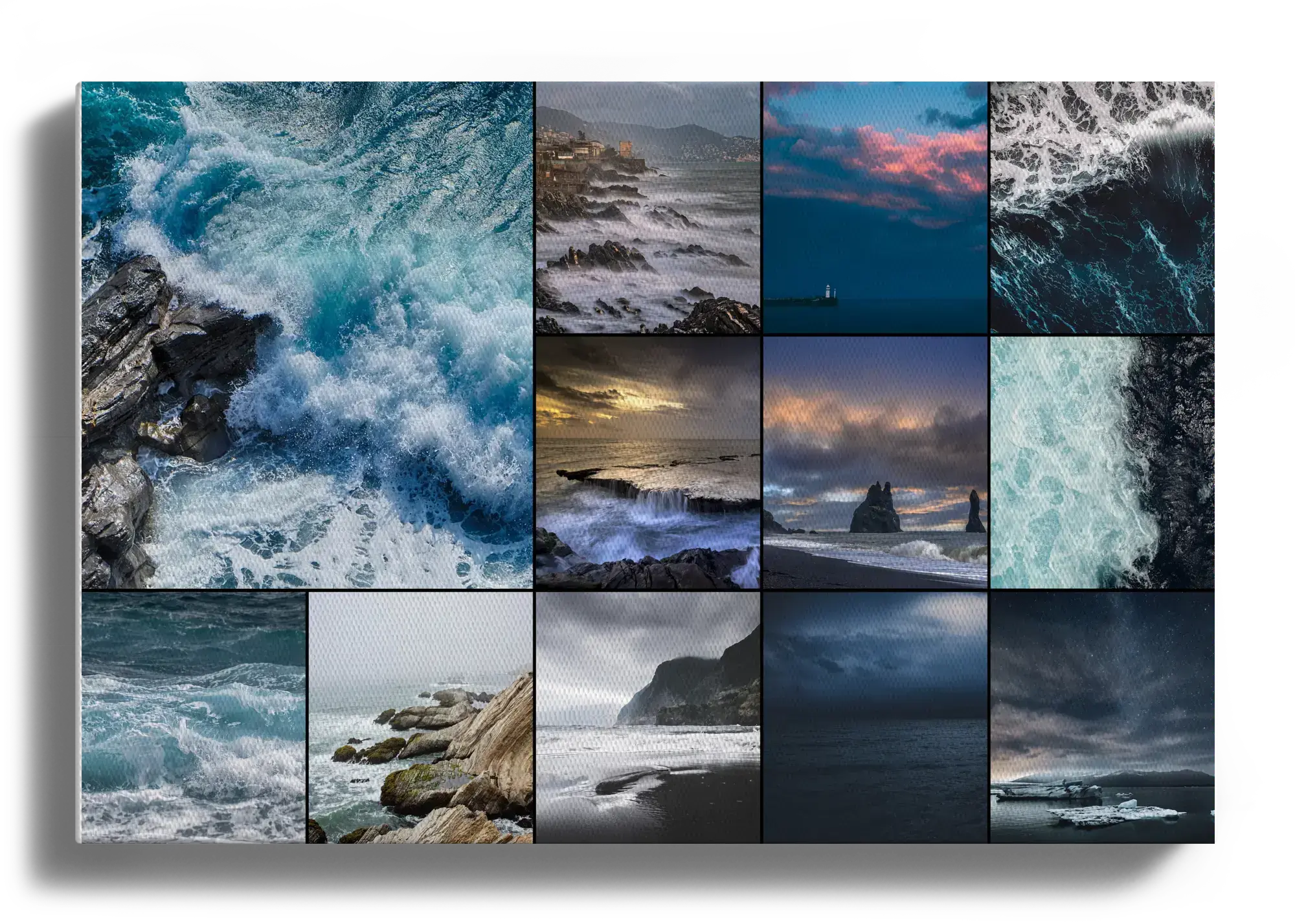 Fog over fields, coasts, forests, and mountains; thunderstorm skies in premium collage prints