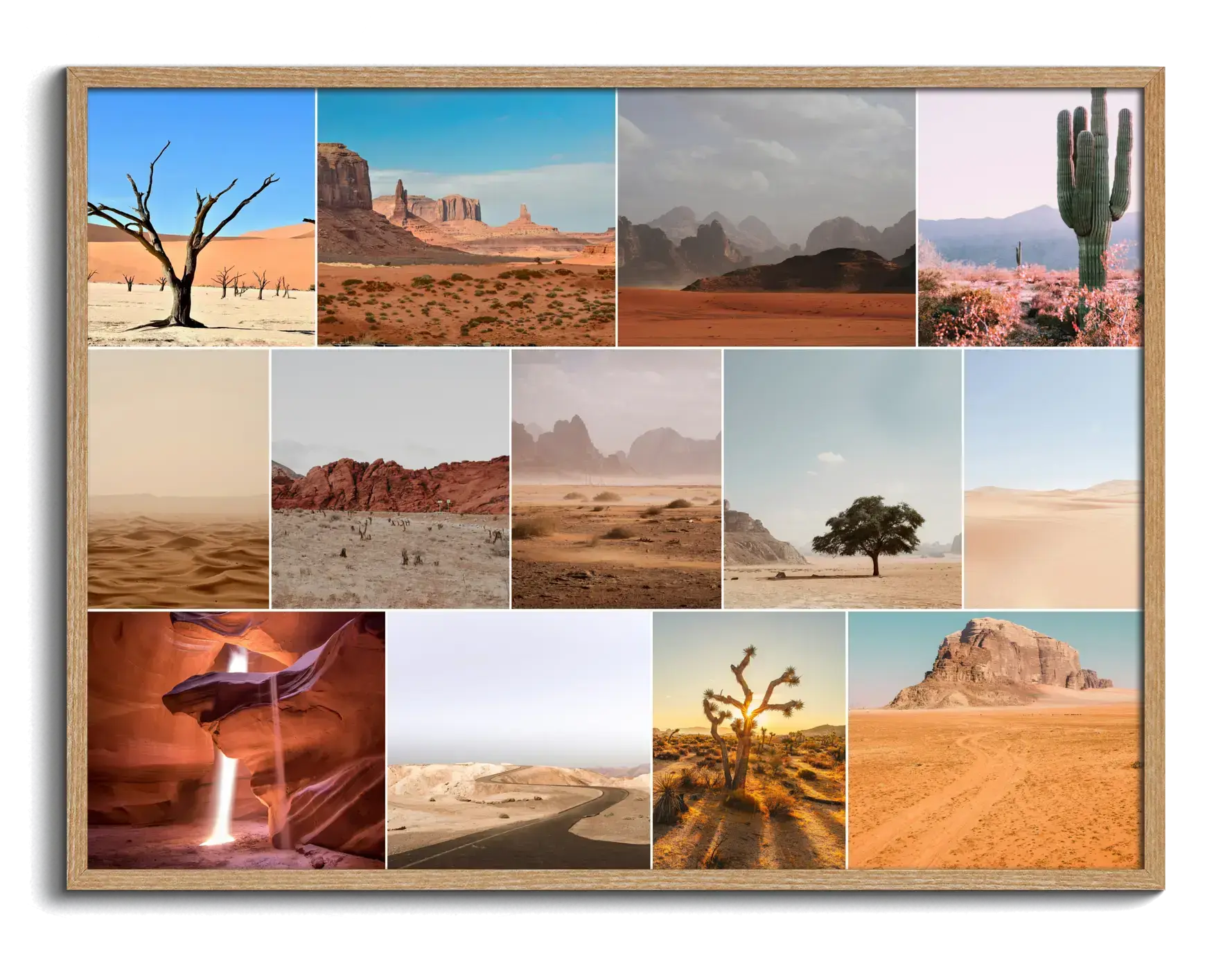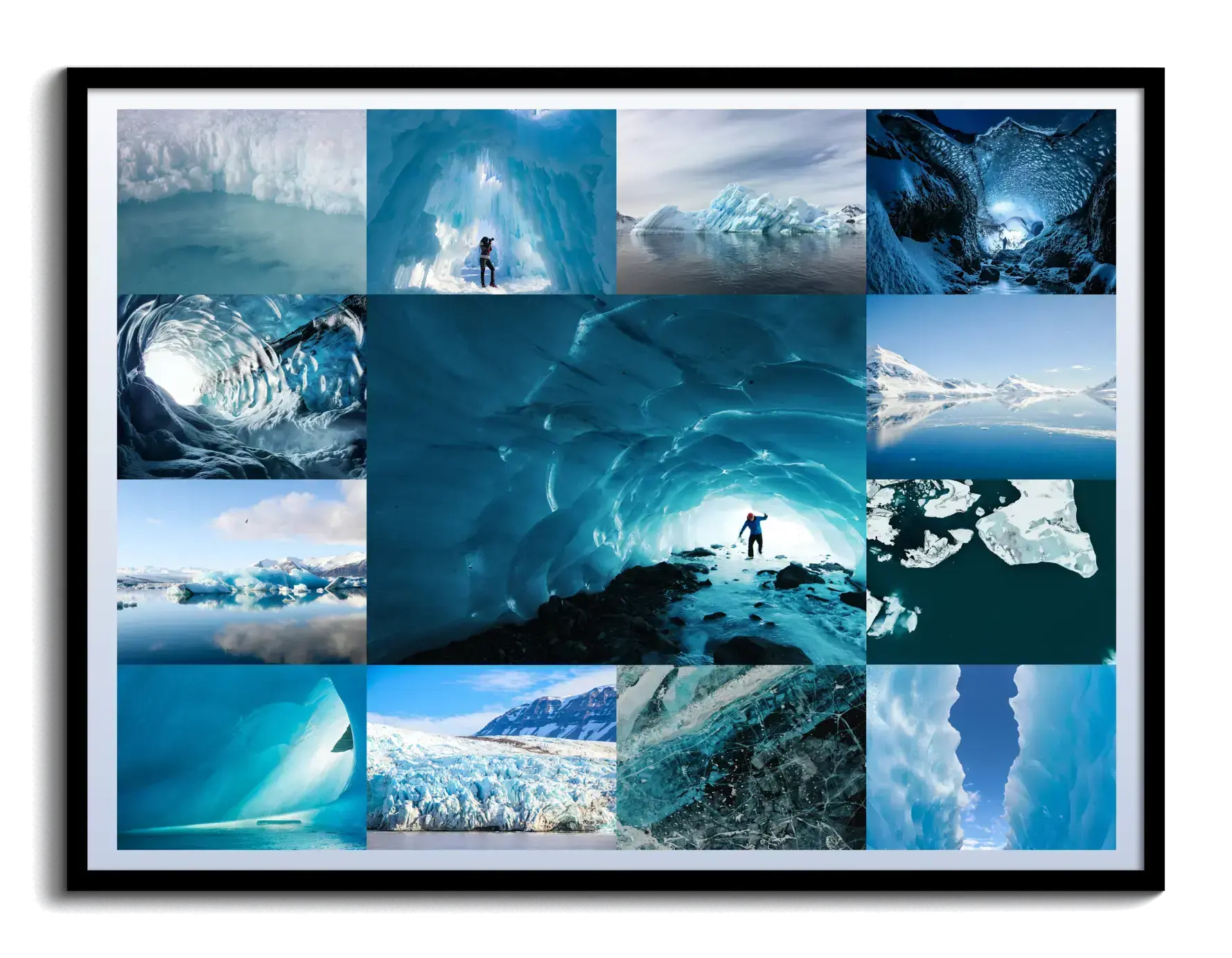 Nature’s extremes—desert dunes, glaciers, ice caves—united in premium collage prints.