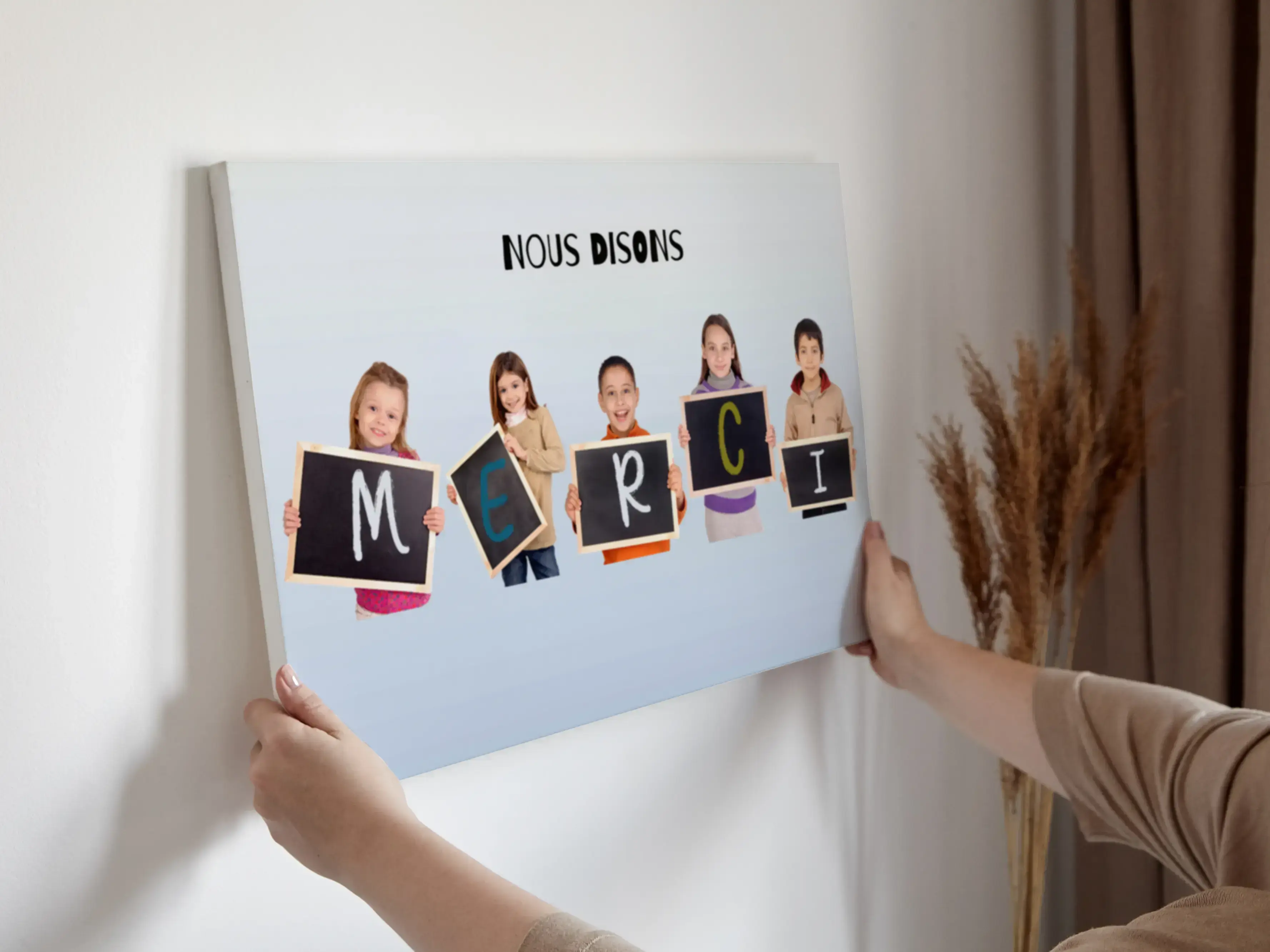 Créez dès maintenant une magnifique pièce personnalisée: imaginez une classe entière de jeunes élèves levant des pancartes qui forment ensemble le mot "DANKE", accompagné du message touchant "Wir sagen Danke". Ce produit est un choix idéal comme cadeau pour un enseignant, pour afficher dans une salle de classe ou comme souvenir pour les parents. Personnalisez facilement les photos, les couleurs, la police, le message et la mise en page selon vos envies.