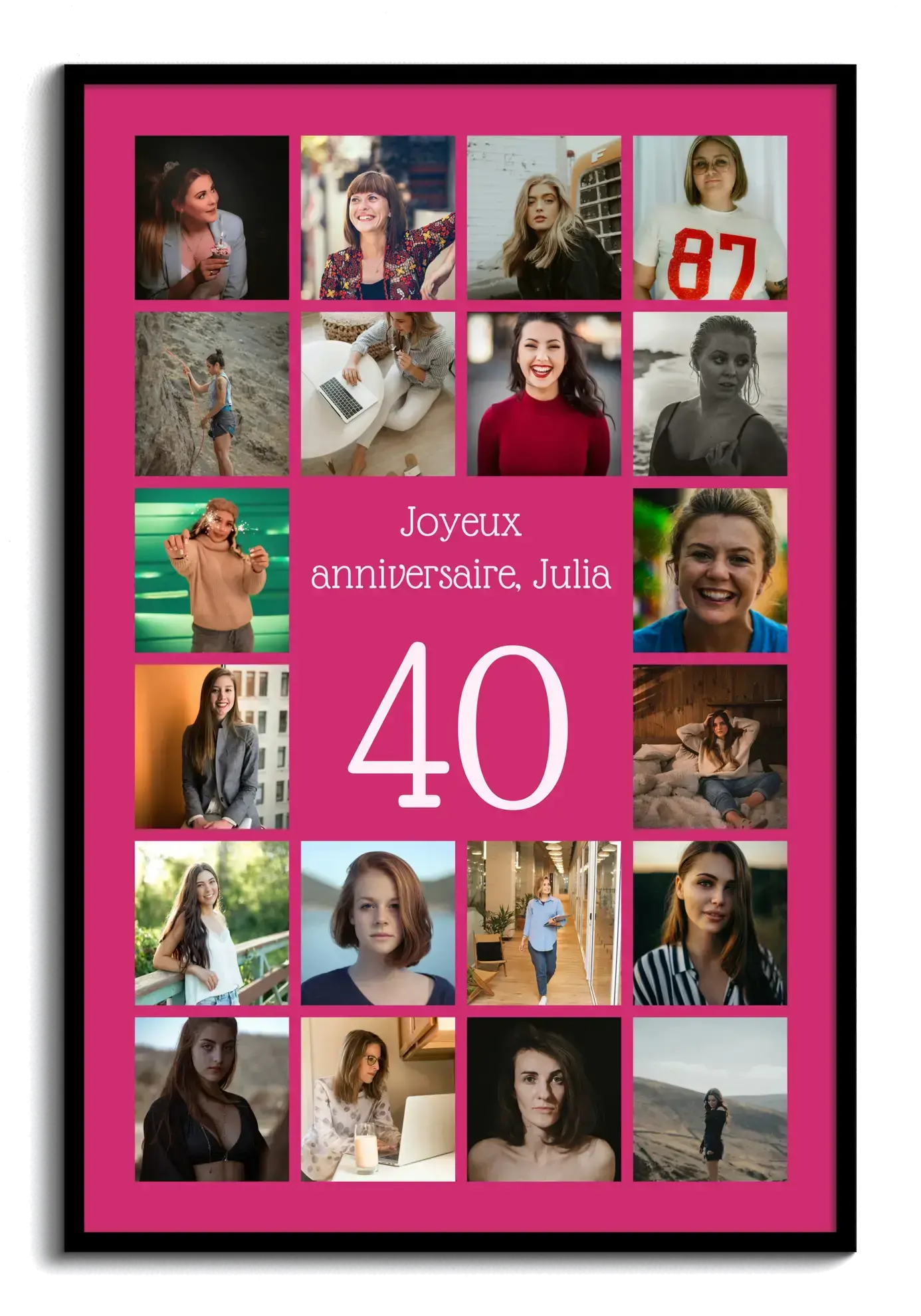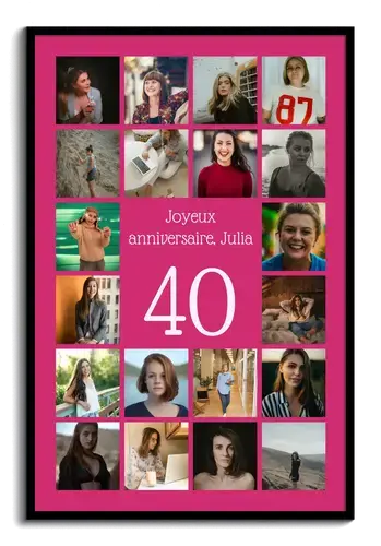 Créez la vôtre maintenant. Cette composition chiffre 40 place une grande 40 au centre, un nom au-dessus et un message en dessous, entourés de 20 à 80 photos en grille. Modifiables: chiffre, nom, texte, nombre d’images, fond, couleurs, format portrait ou paysage. Idéal pour un 40e anniversaire, des noces d’émeraude, un jubilé d’entreprise.