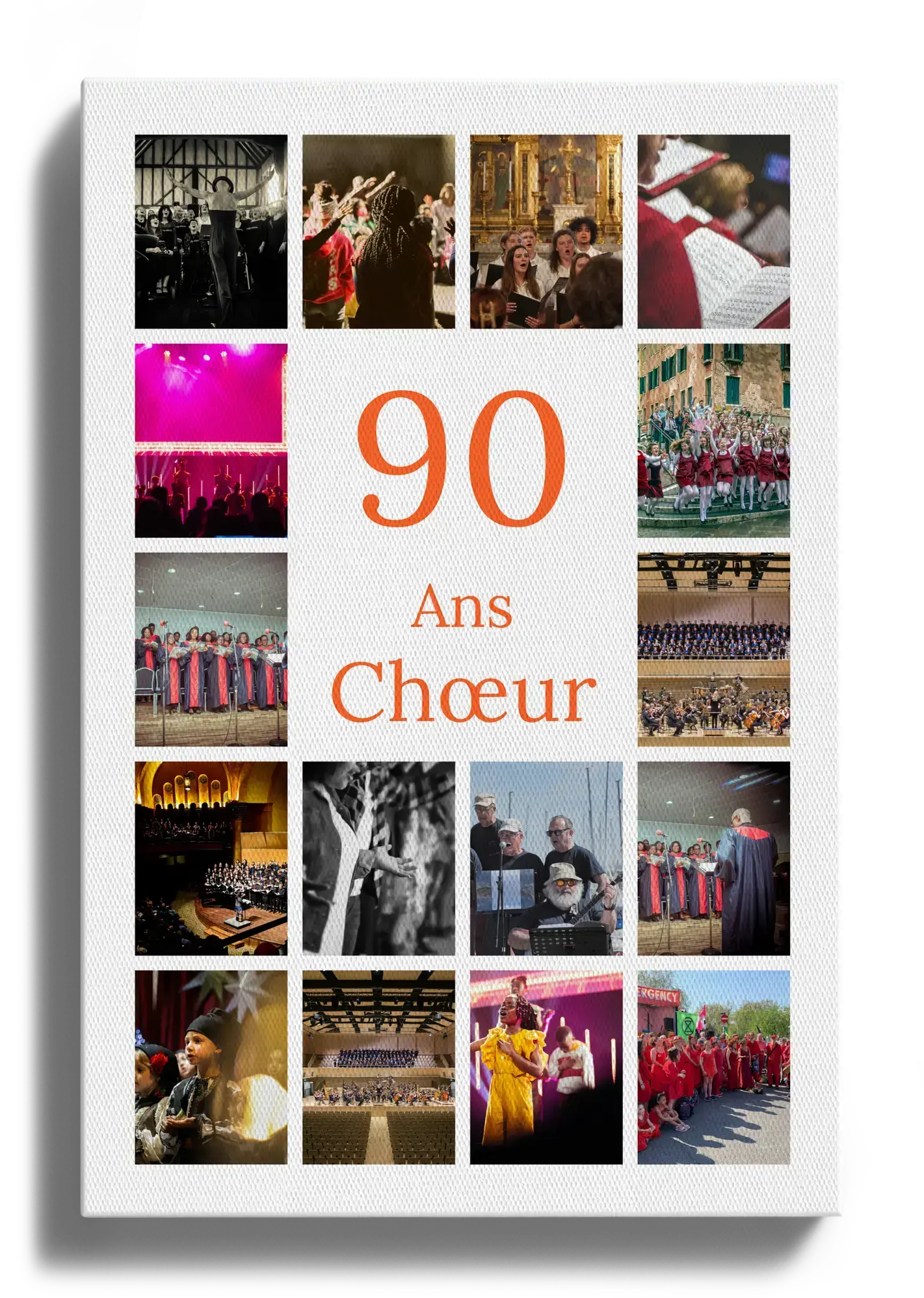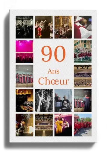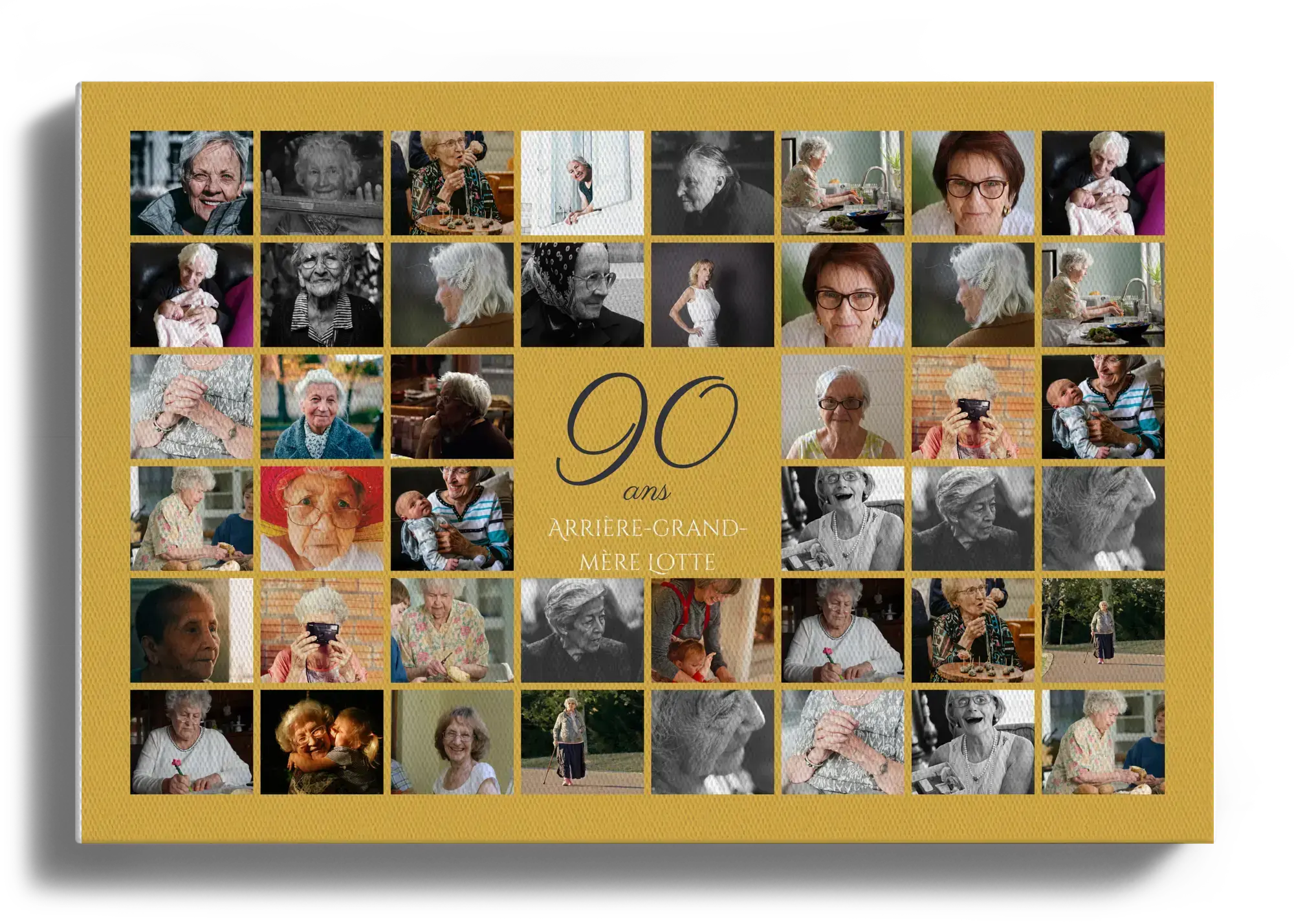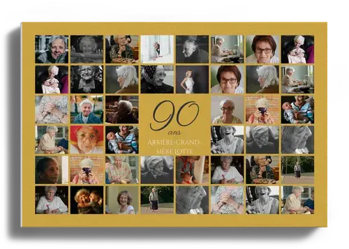 Personnalisez maintenant. Exemple: la composition Jubilé 90 affiche un grand 90 au centre, le prénom au-dessus et un message en dessous, entourés de 20 à 80 photos en grille. Le chiffre, le nom, les mots, la quantité d’images, le fond, les couleurs et l’orientation se règlent en un clic.