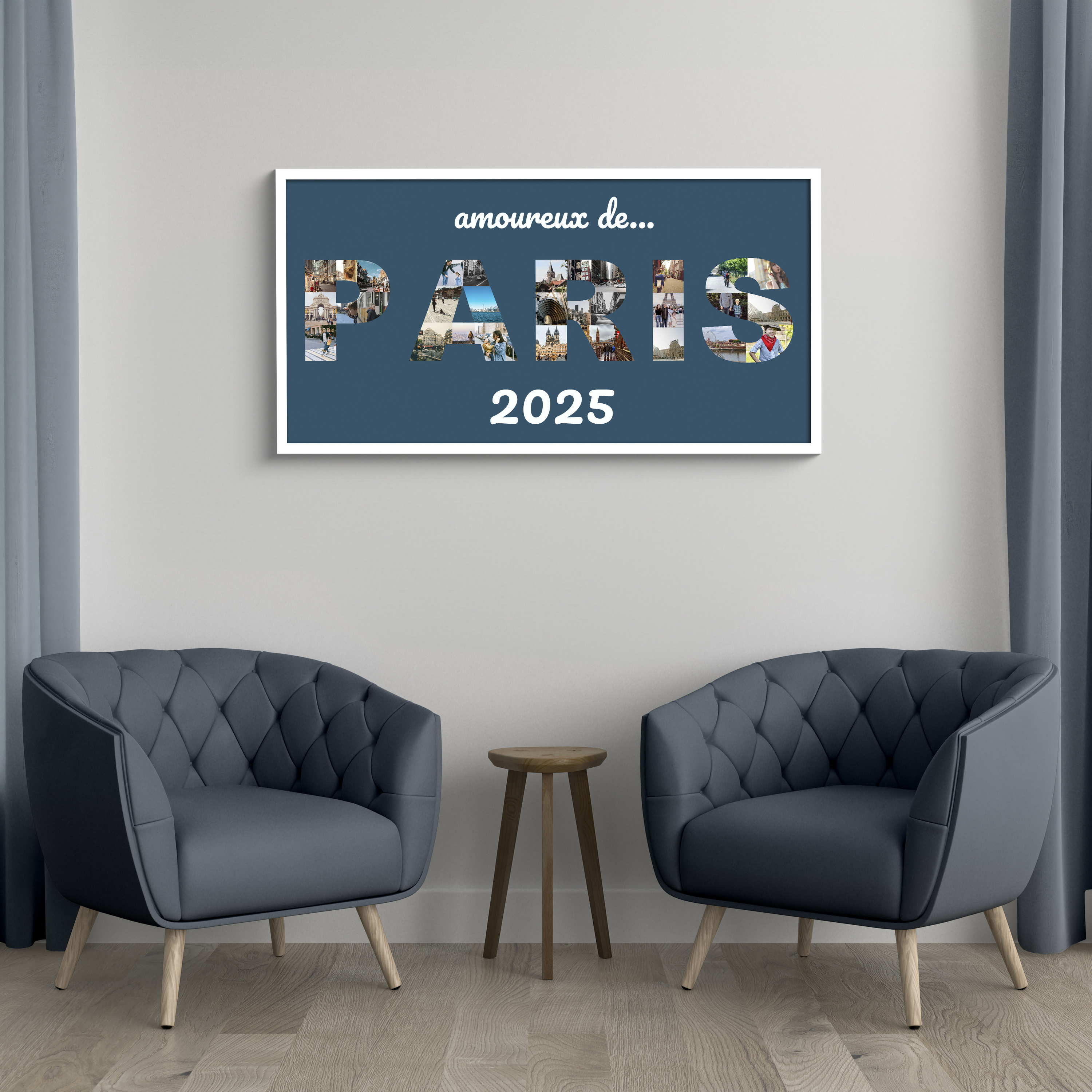Collage typographique PARIS en photos de voyage, toile premium bleu nuit, personnalisable.