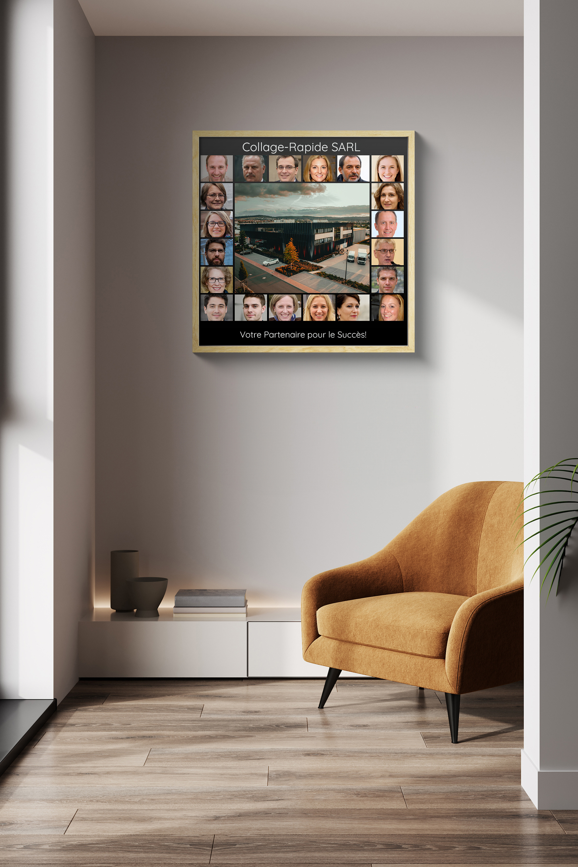Créez dès aujourd'hui votre propre chef-d'œuvre personnalisé en quelques clics. Imaginez une élégante photo-collage carrée sur verre acrylique, parfaite pour votre entreprise. Réunissez les visages de vos collaborateurs autour d'une photo centrale marquante, avec le nom de votre société fièrement arboré au-dessus, et un message inspirant tel que « Votre partenaire pour le succès » en dessous. Idéale pour afficher un esprit d'équipe ou valoriser vos relations professionnelles.