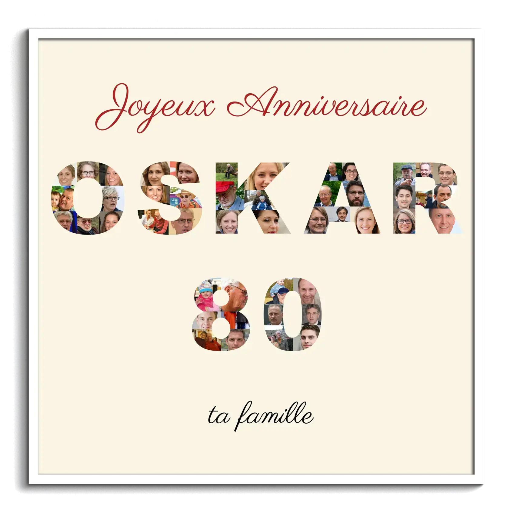 Créez une expérience inoubliable avec notre Fotocollage personnalisée. Imaginez un texte multiligne formé par vos photos, où le nom et le chiffre 80 s'assemblent à partir de multiples petites images. Parfait pour un anniversaire, ce design inclut des phrases comme "Tout l'amour, pour l'anniversaire, ta famille" pour rendre ce moment encore plus spécial.