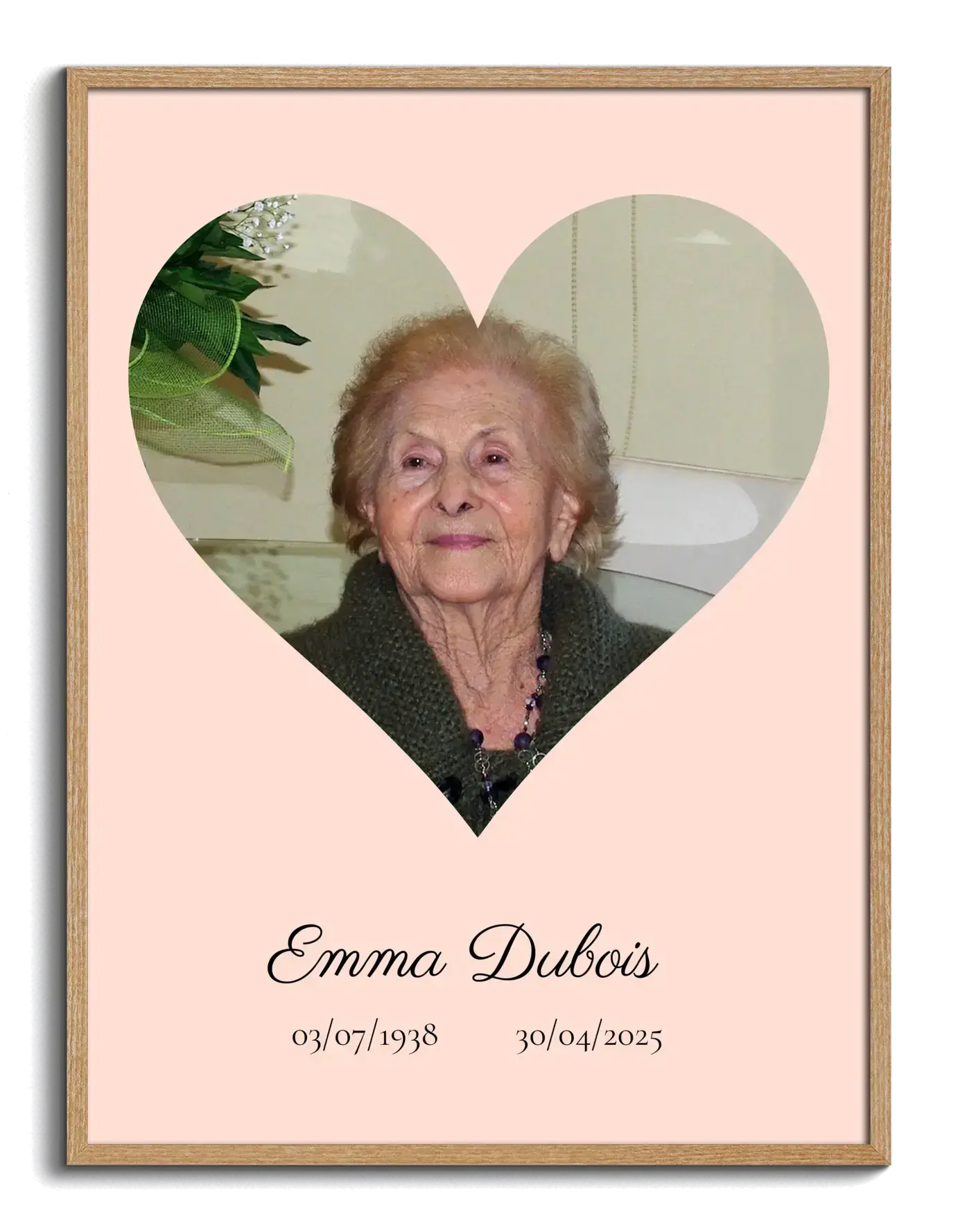 Collage hommage en forme de cœur, personnalisée avec photo, nom et dates sur fond rose.