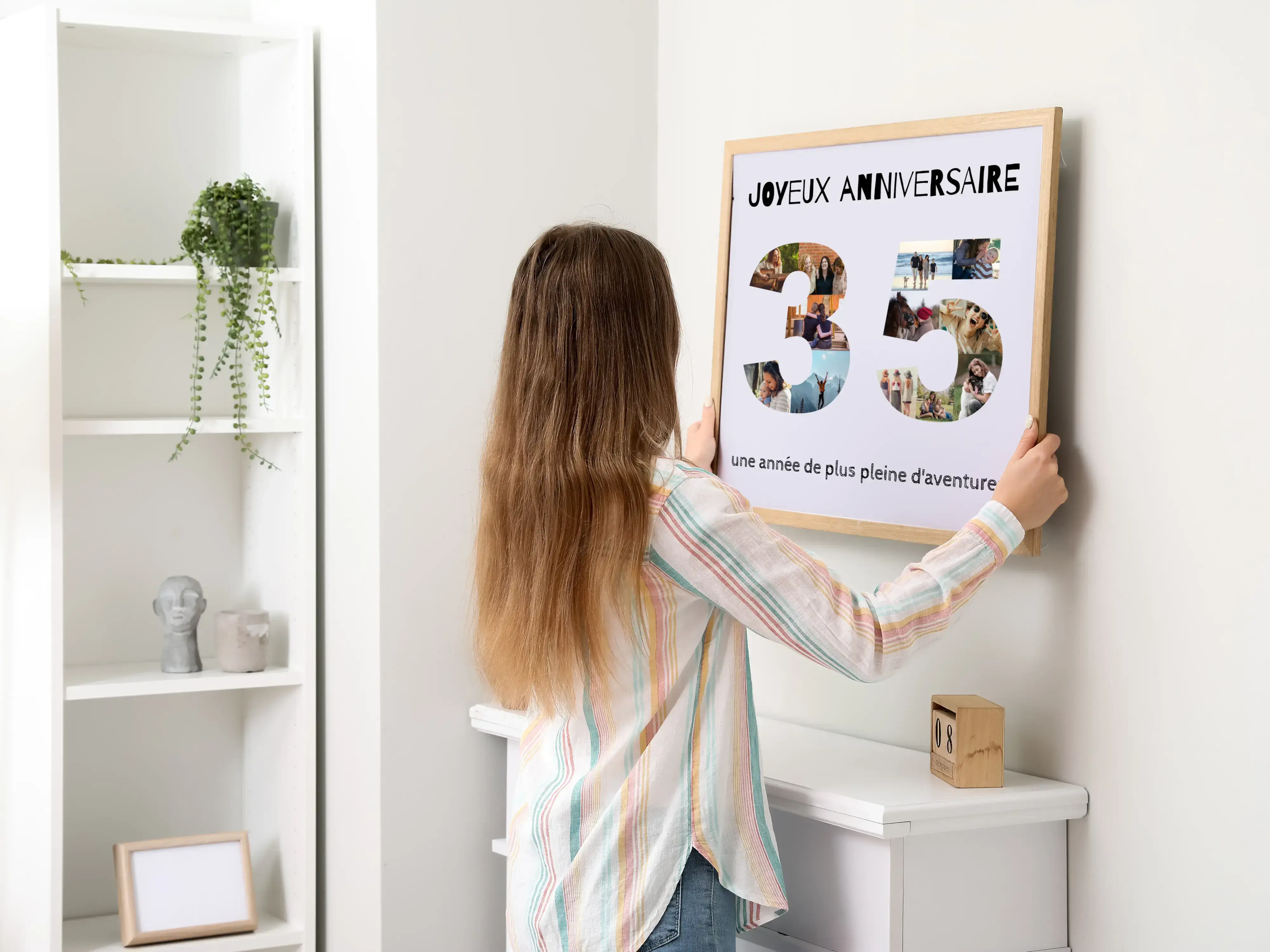 Découvrez la magie de vos souvenirs en créant votre propre collage photo personnalisé. Imaginons une belle composition en forme de chiffre 35, remplie de 12 photos qui symbolisent un anniversaire mémorable, agrémentée par les mots "Happy Birthday" et "un autre an d'aventure!" Un cadeau unique pour célébrer un moment spécial.
