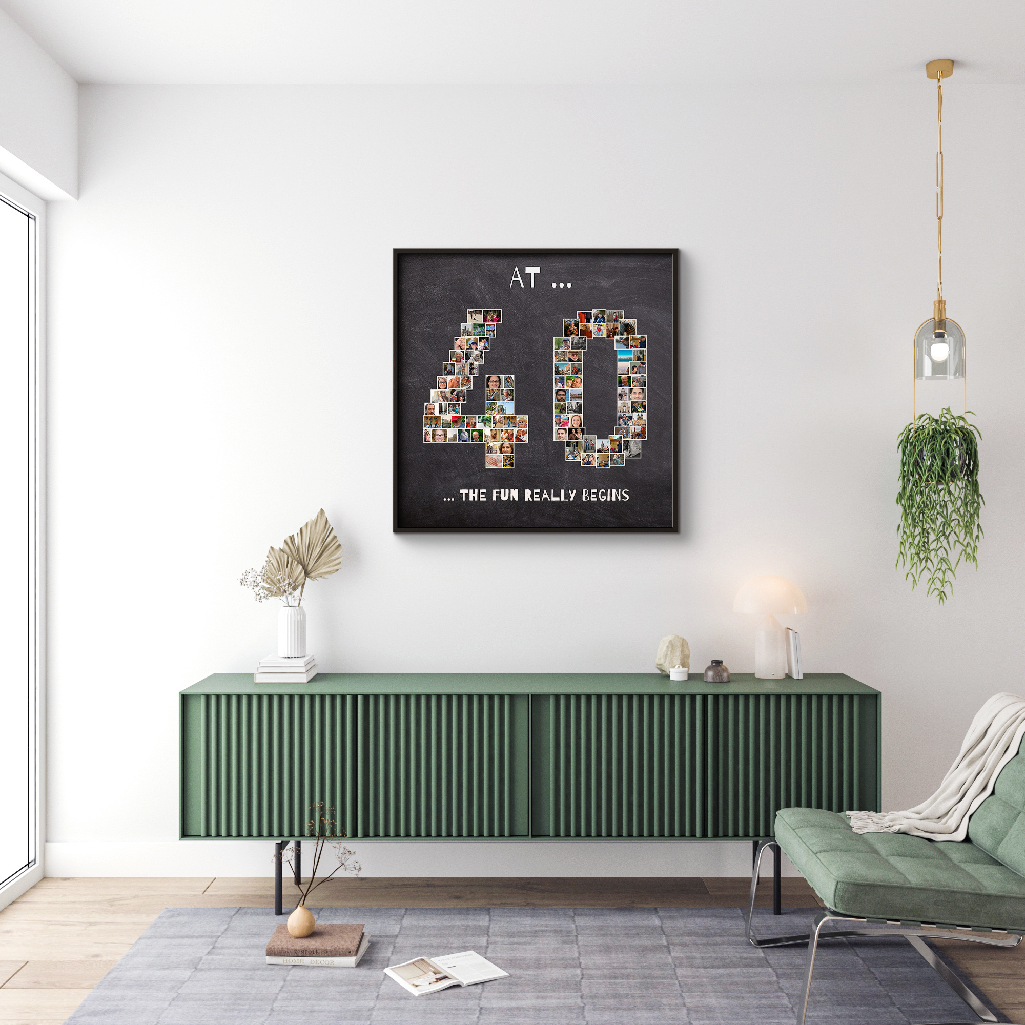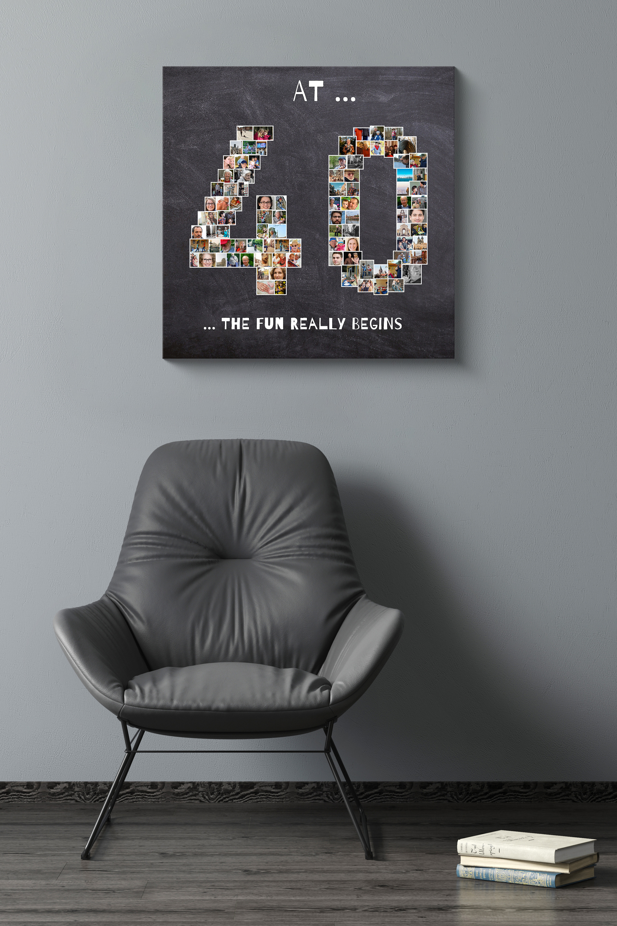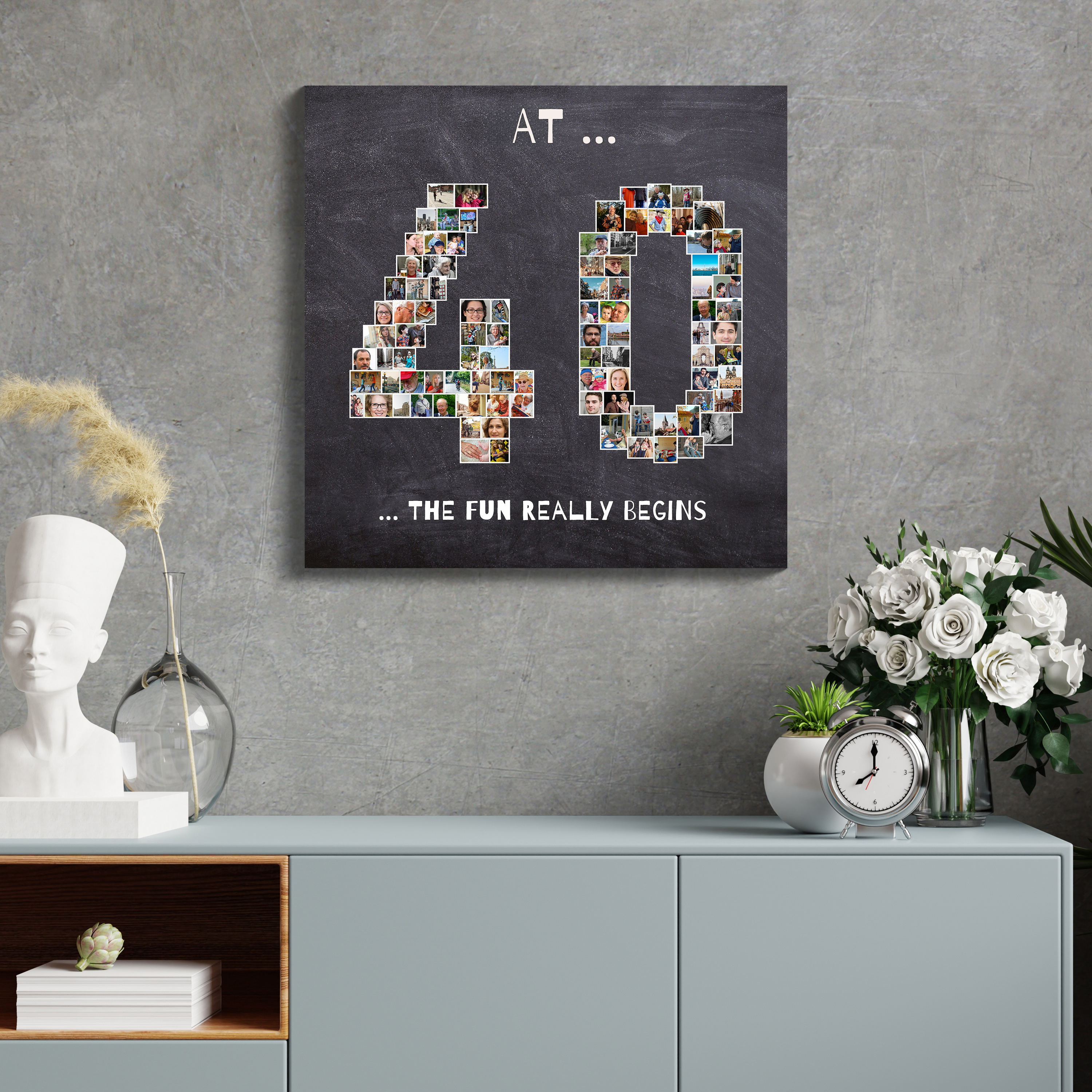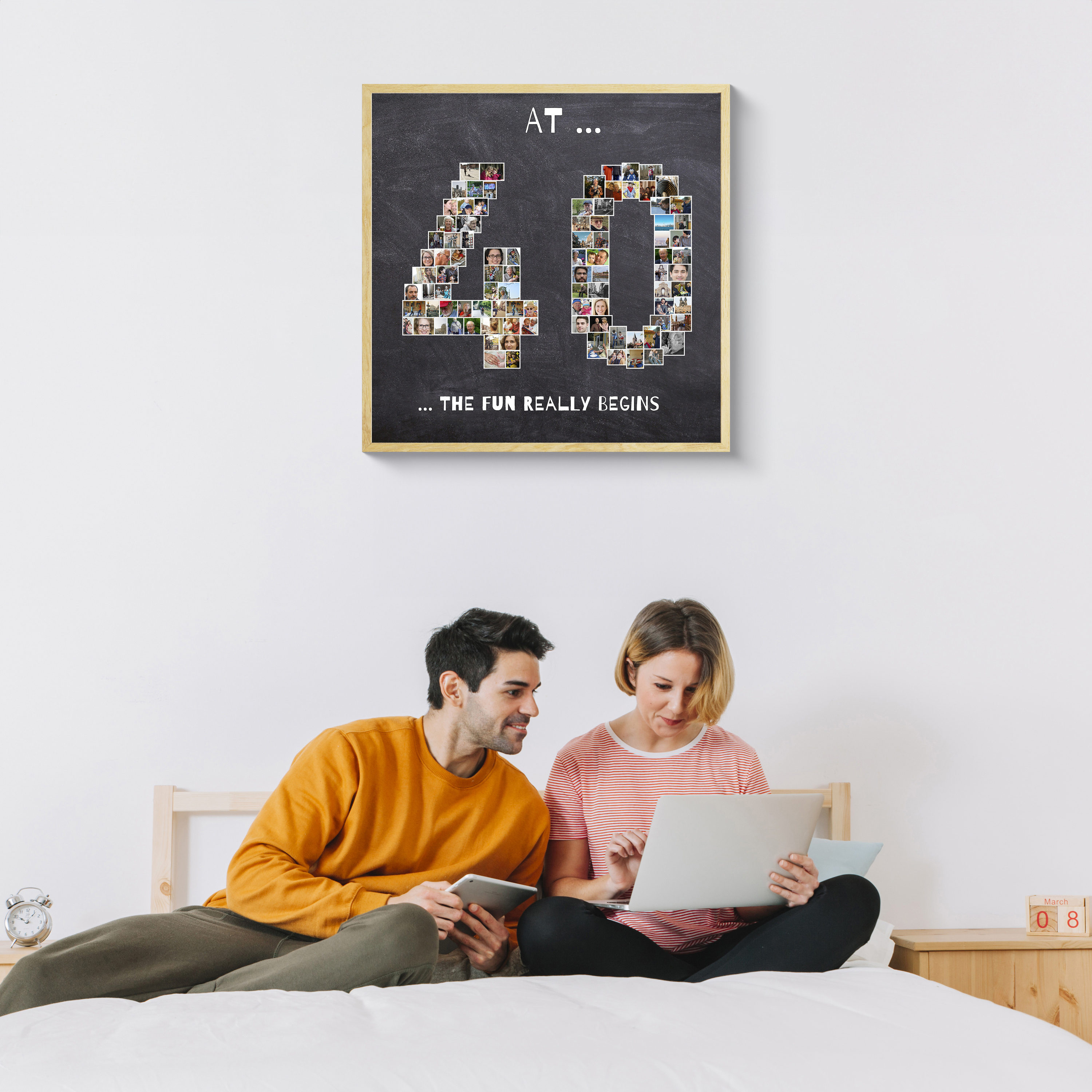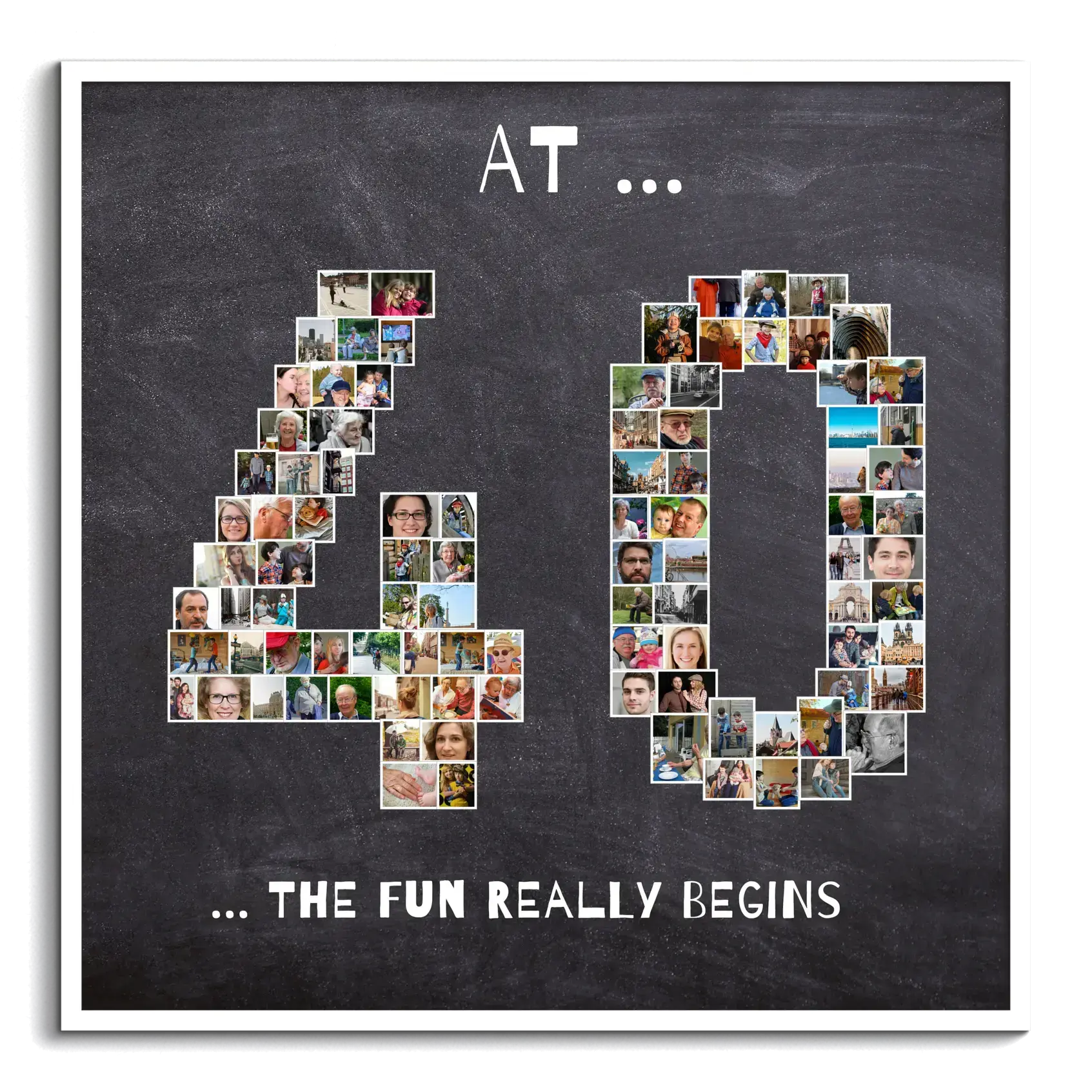 Create a unique birthday gift with our personalized photo collage, designed to celebrate a milestone like turning 40. Picture a collage shaped as the number "40", filled with your favorite photos and accompanied by a humorous message. Personalize it further with your own images and text, making it ideal for a special birthday present or party decoration.
