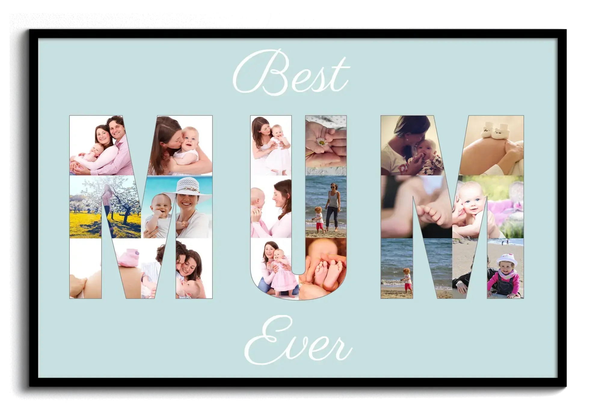Celebrate mothers with custom photo collages spelling out "Best Mum Ever." Perfect for any occasion.