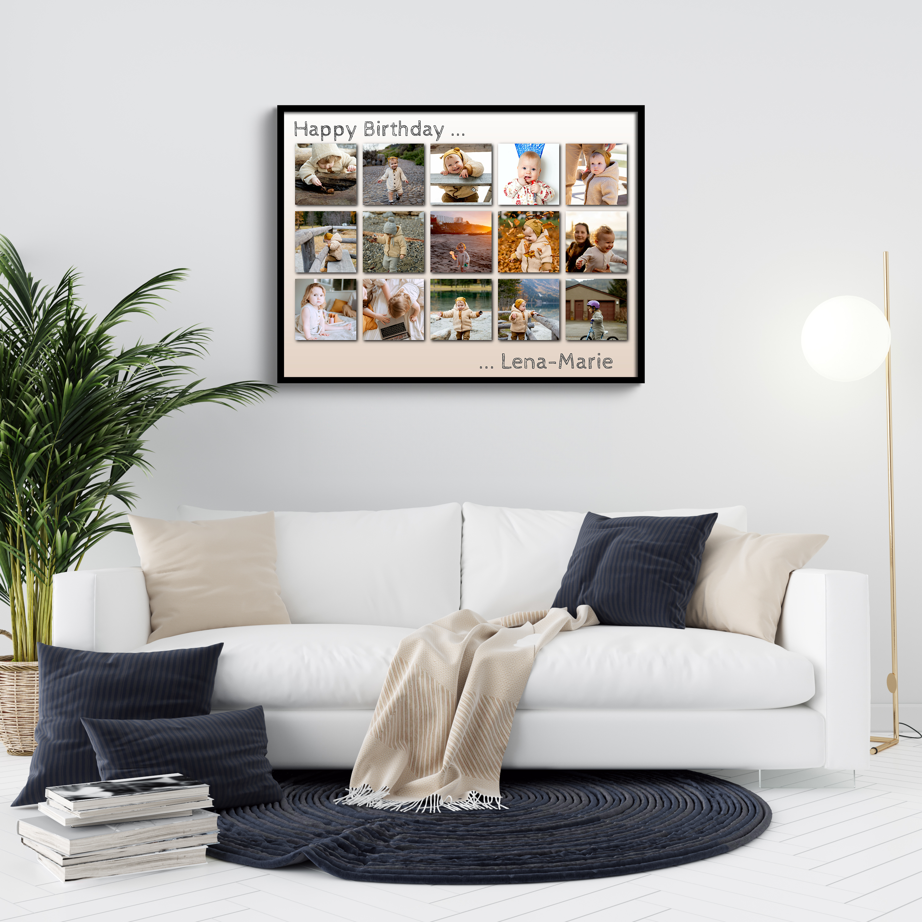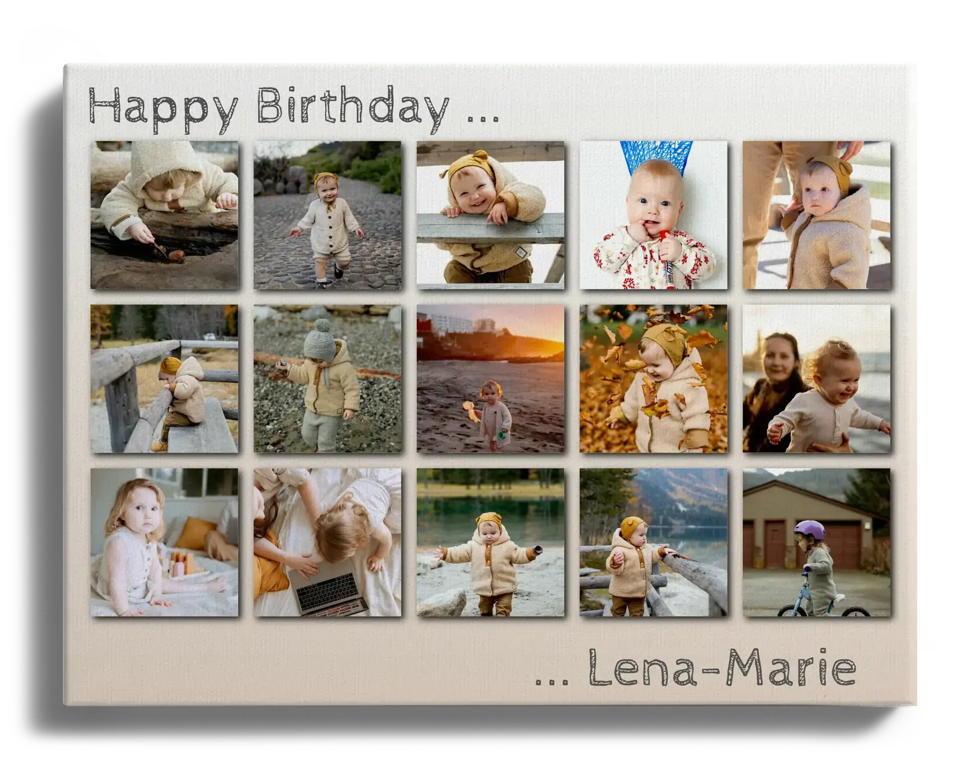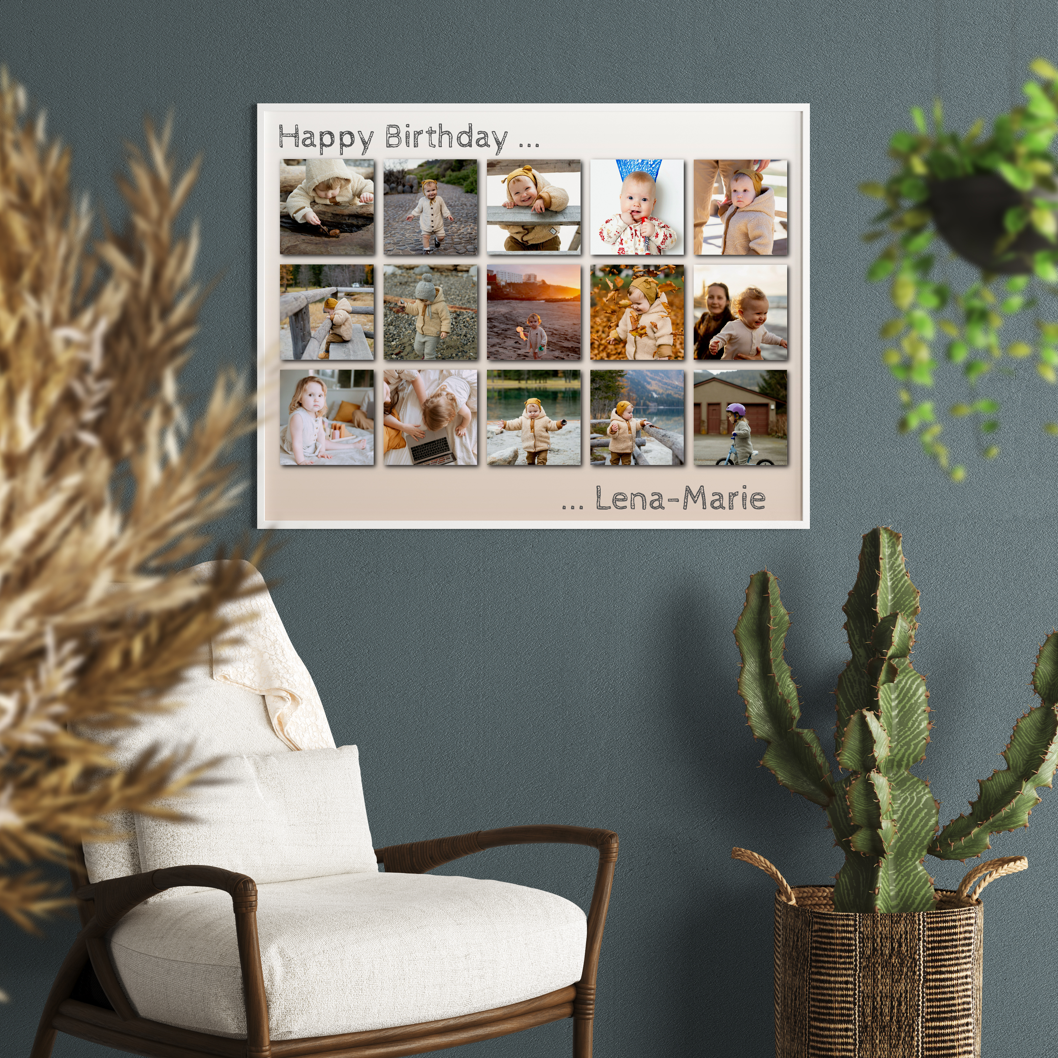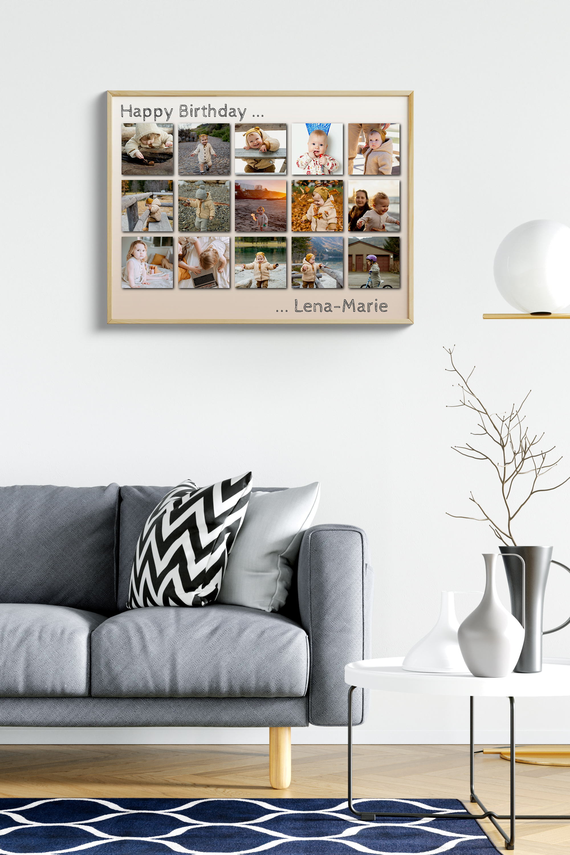 Create a stunning birthday gift with our customizable photo collage, perfect for celebrating a special occasion with loved ones. This example features 15 photos arranged in a neat grid on high-quality acrylic glass, with a personal touch from the greeting "Happy Birthday, Lena-Marie." Ideal for families or friends, this unique keepsake brings joy and warmth to any birthday celebration. Feel free to adjust the photos, message, font, background color, and layout to make it truly yours.
