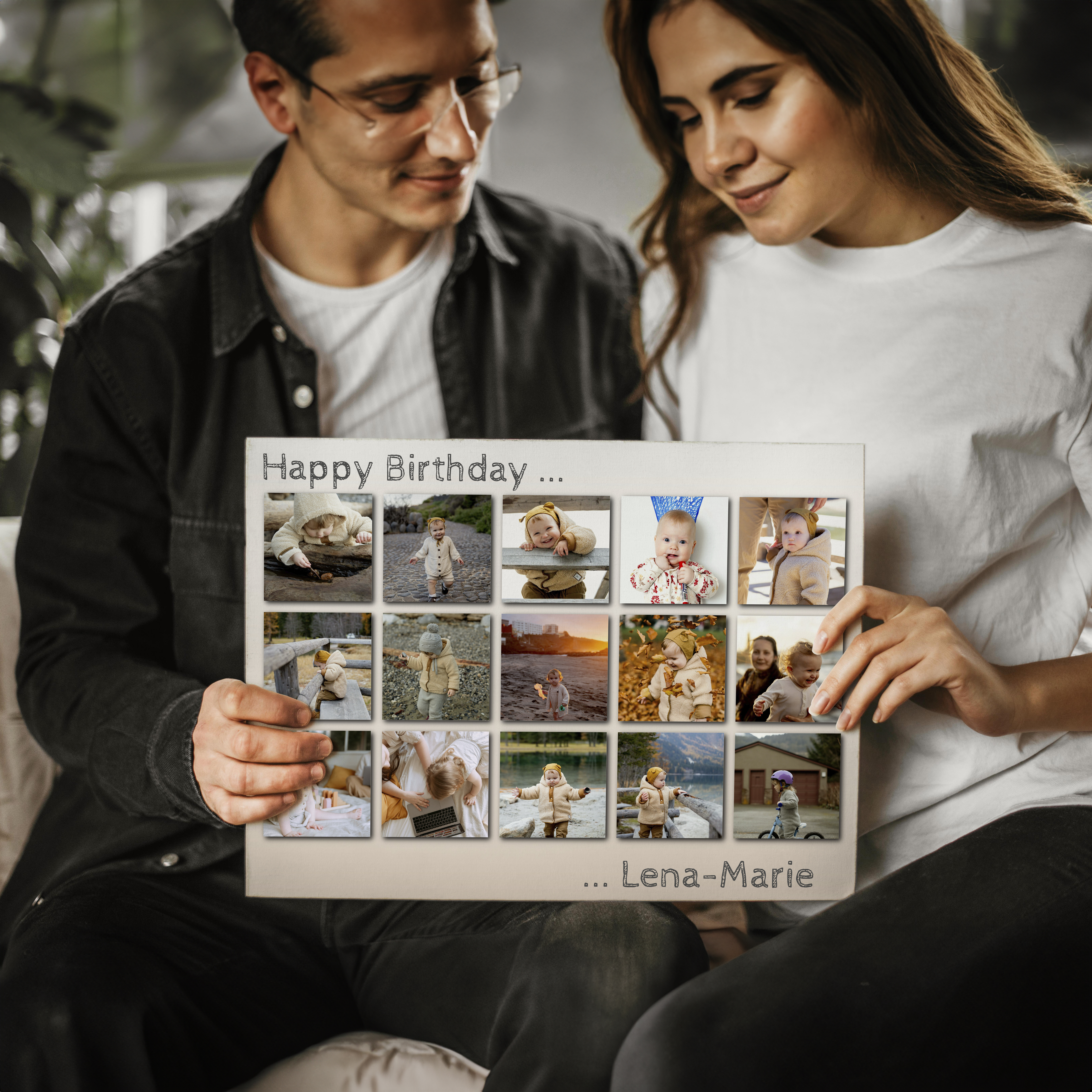 Birthday joy captured: 15-photo grid on premium acrylic, perfect personalized gift.