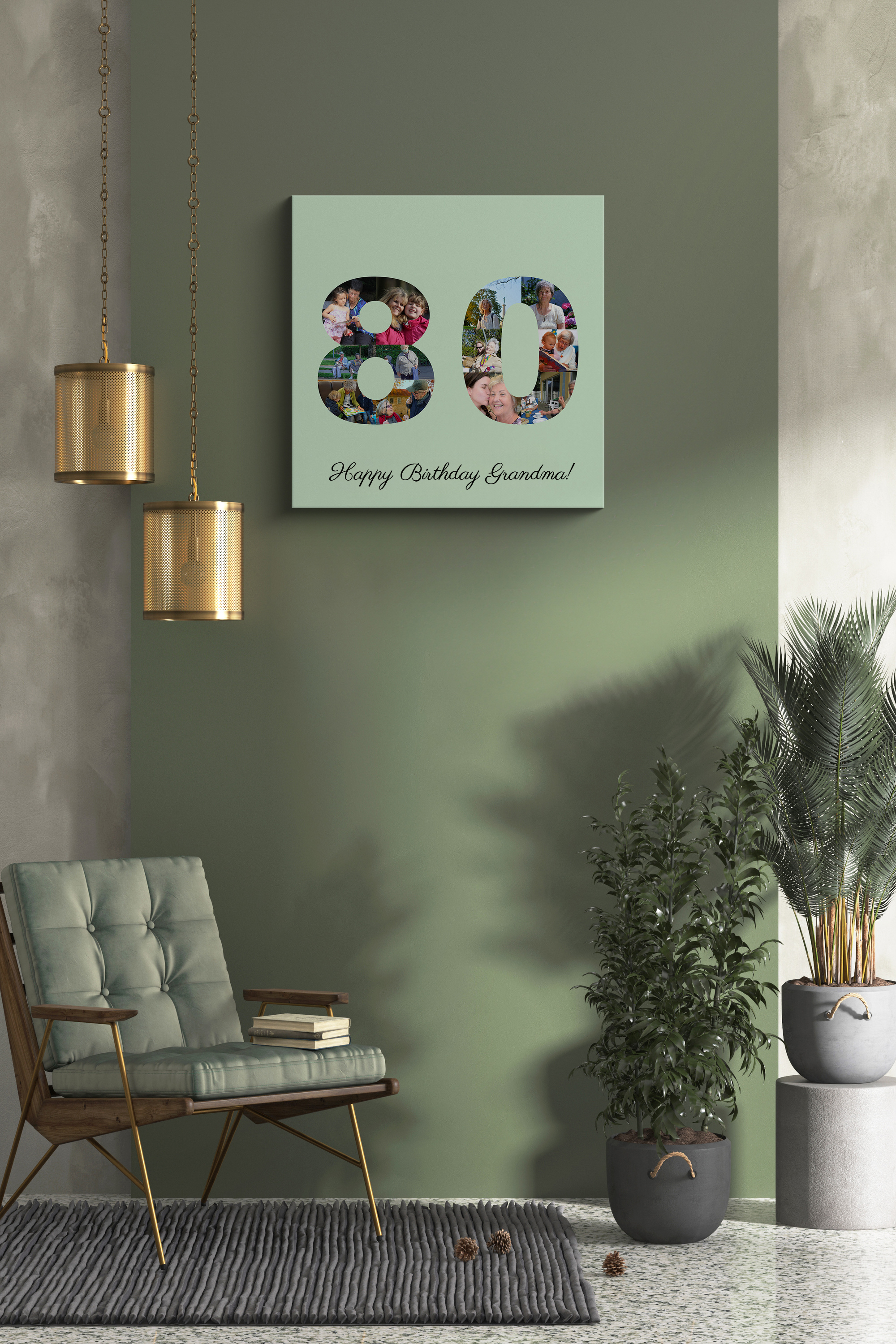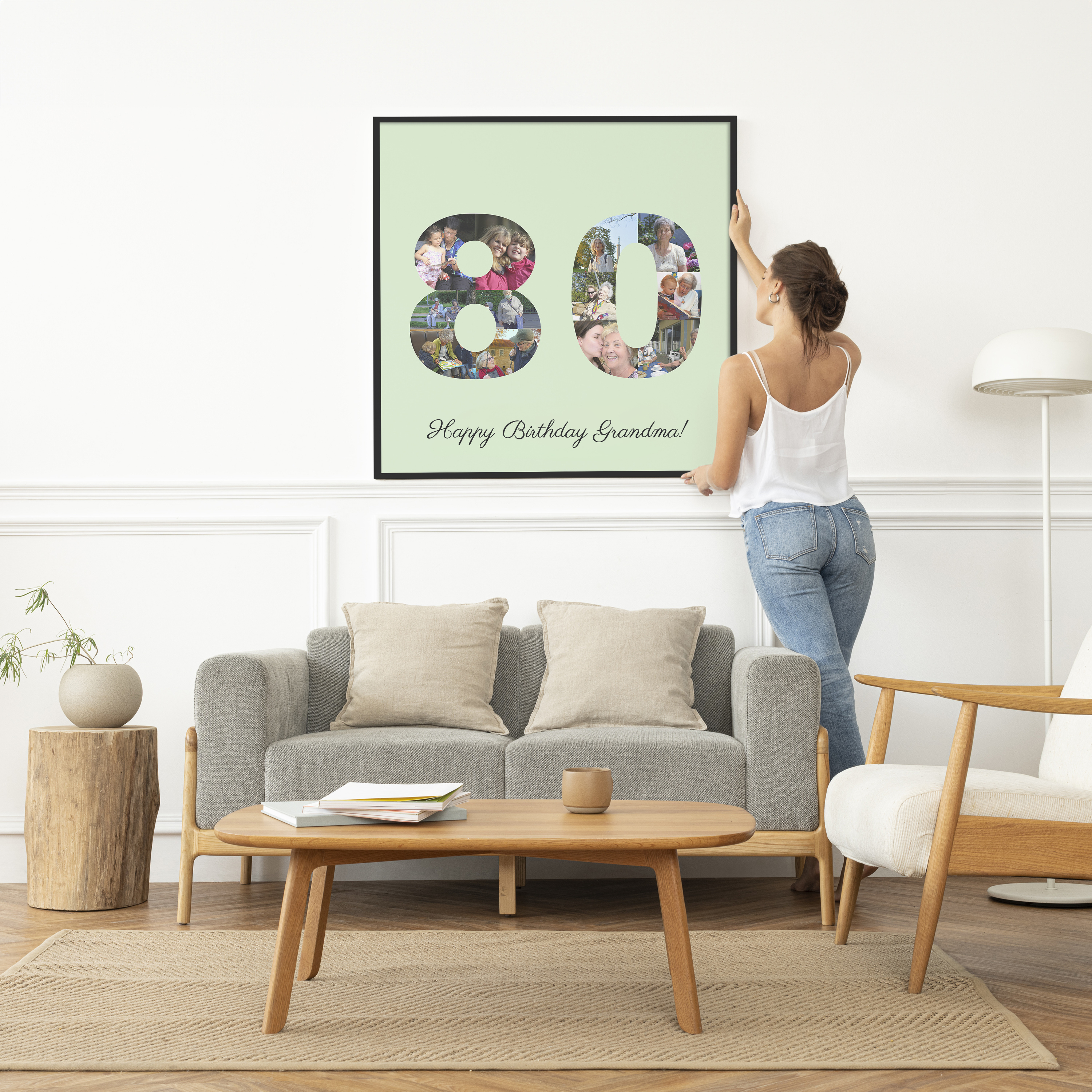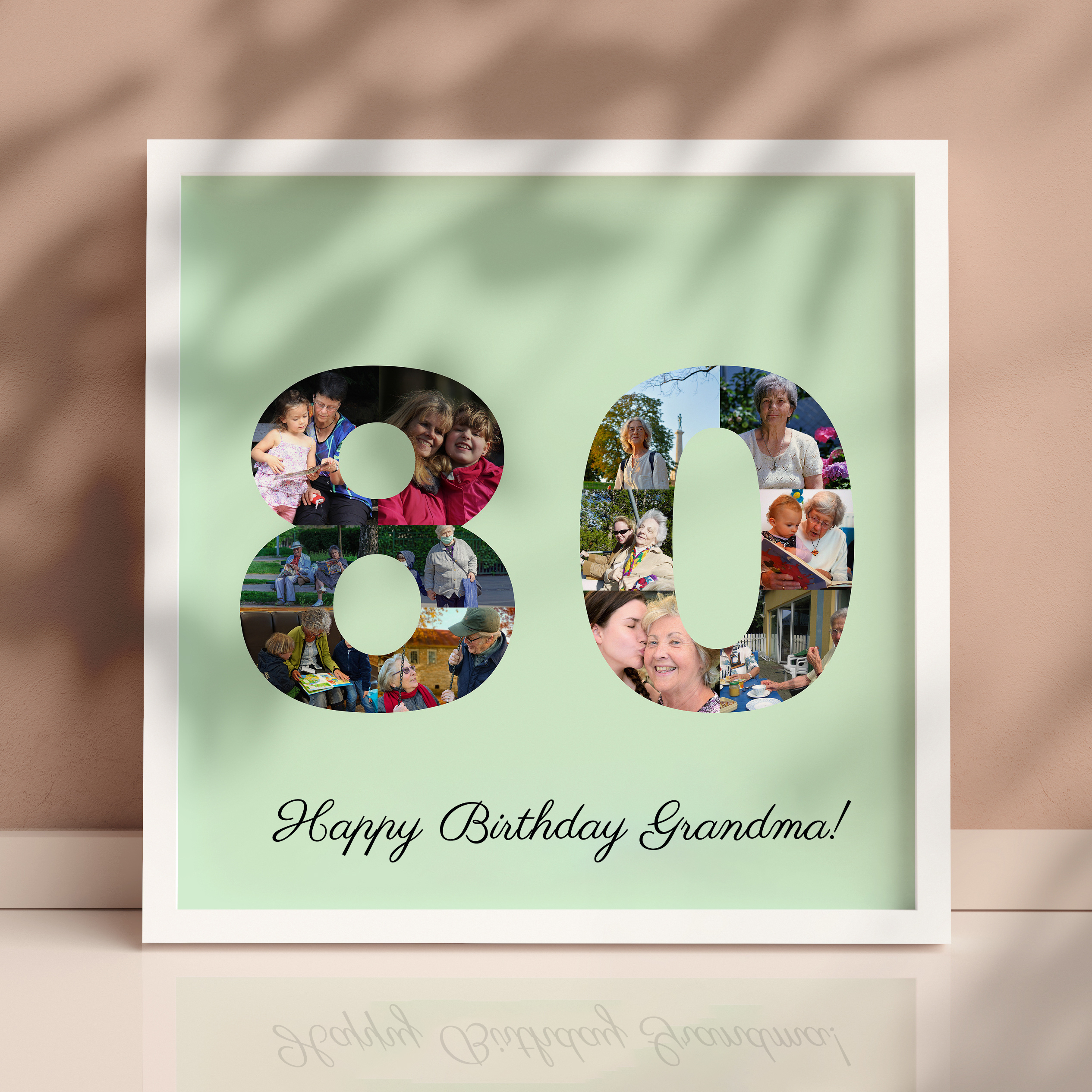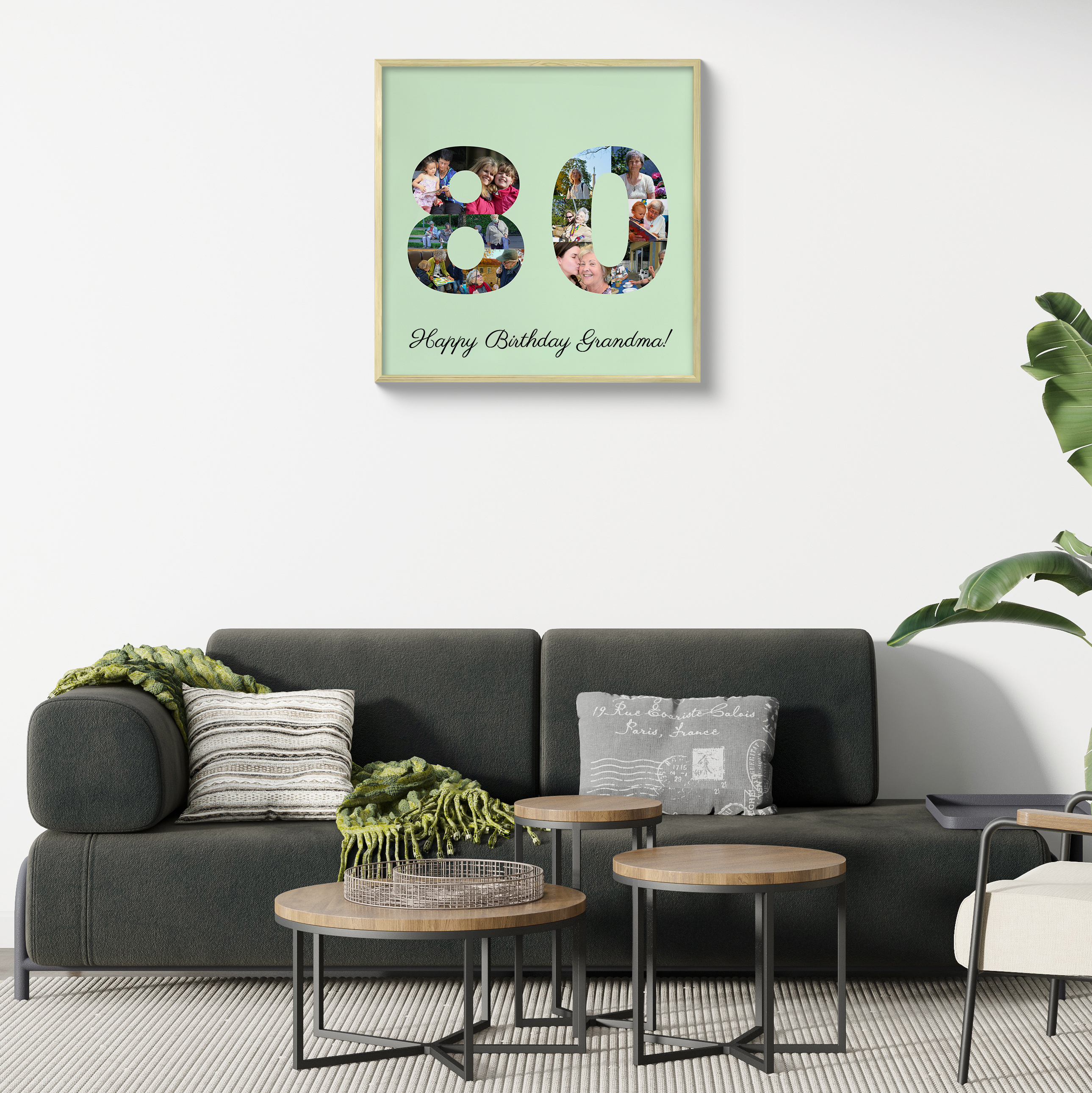 Create the perfect personalized touch with your own custom photo collage. Celebrate a special birthday with a unique number collage, like the stylish "80" filled with 12 small photos and the heartfelt message "happy birthday, Grandma." This modern design is great for family members, friends, or anyone looking for a creative and personal gift.