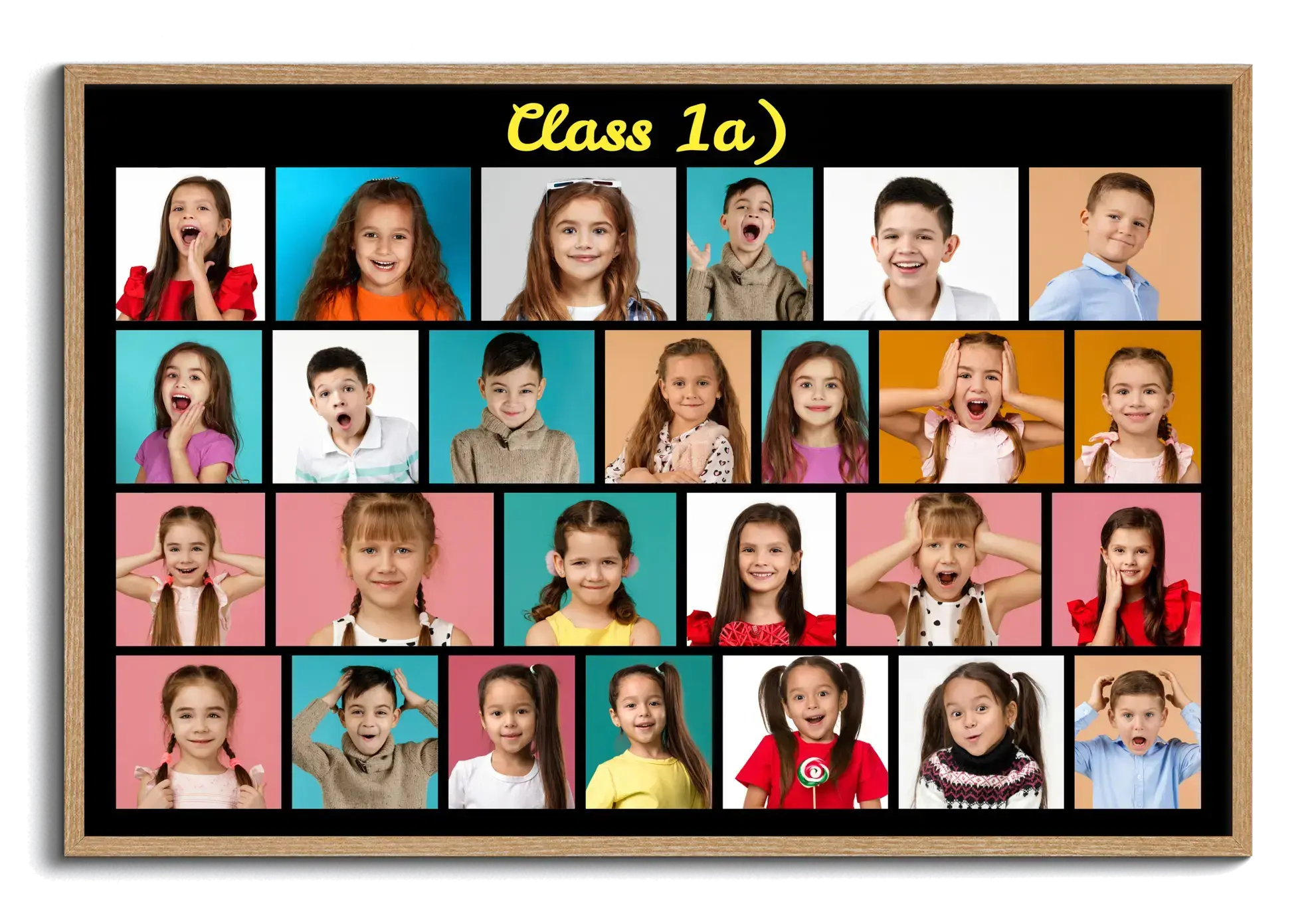 Create your own personalized masterpiece with our customizable photo collage, perfect for any occasion. Imagine capturing the precious memories of your child's class or kindergarten group, showcasing each child with uniquely sized portrait photos set against vibrant backgrounds. This lively design, featuring bold black and neon text that reads Class 1a, is ideal as a gift for teachers, a classroom display, or a keepsake for parents. Every element, from text and photos to colors and fonts, is entirely customizable to suit your needs.