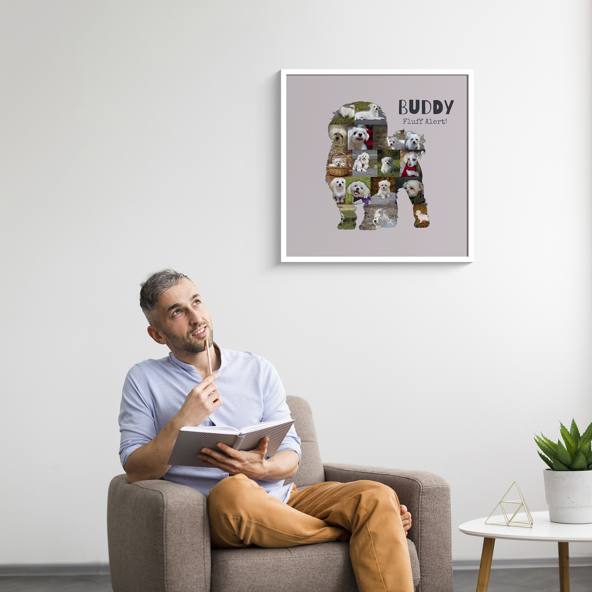 Create a personalized masterpiece with our unique dog silhouette photo collage, designed exclusively for Maltese lovers. This creative product allows you to fill the silhouette of a sitting or standing Maltese with 15-20 of your own cherished photos. Add a personal touch with custom text, such as "Fluff Alert" or "Cotton Candy with Eyes." It's the perfect decorative piece for your home or a thoughtful gift for friends and family. Tailor your collage with customized photos, silhouette choices, colors, and text to capture the essence of your furry friend.