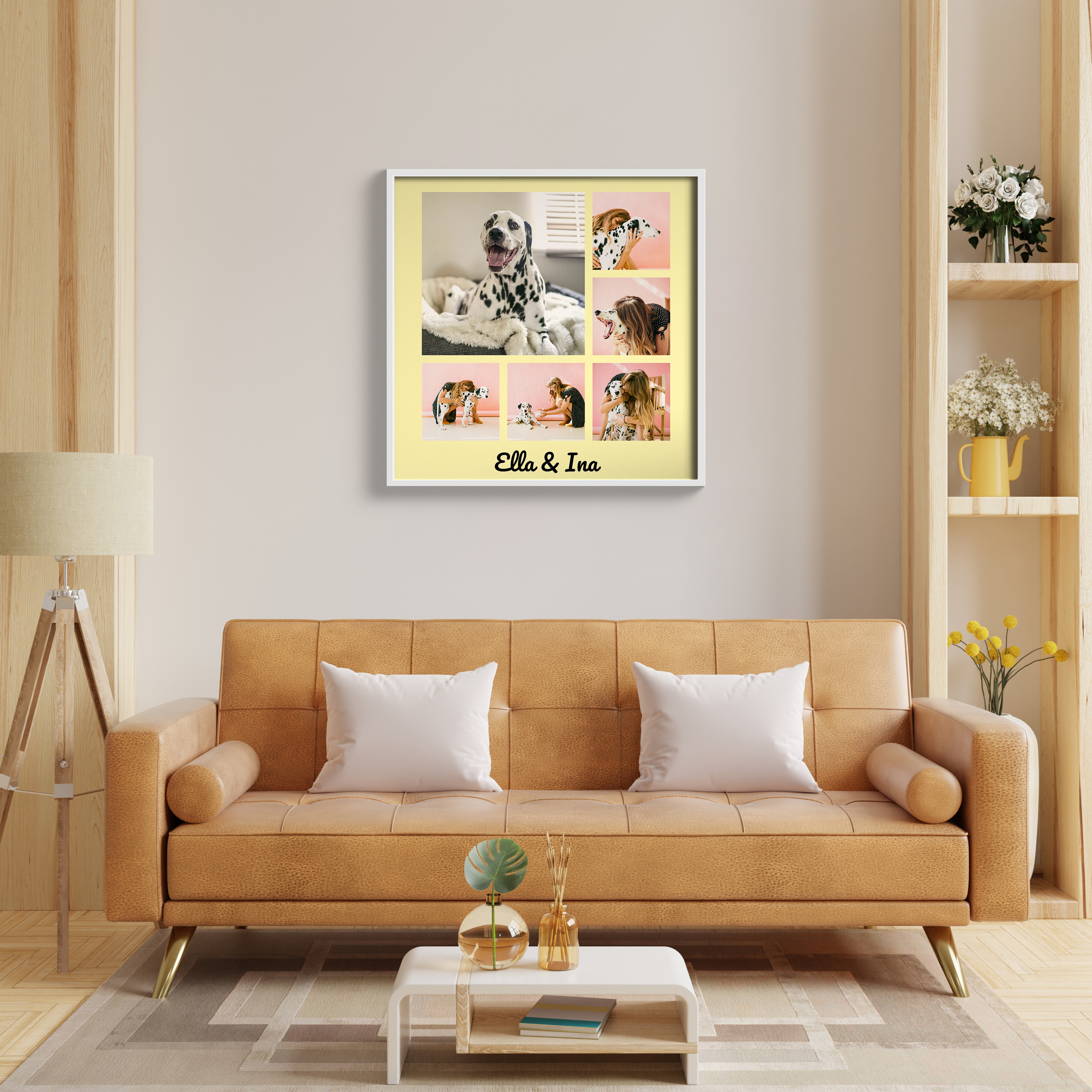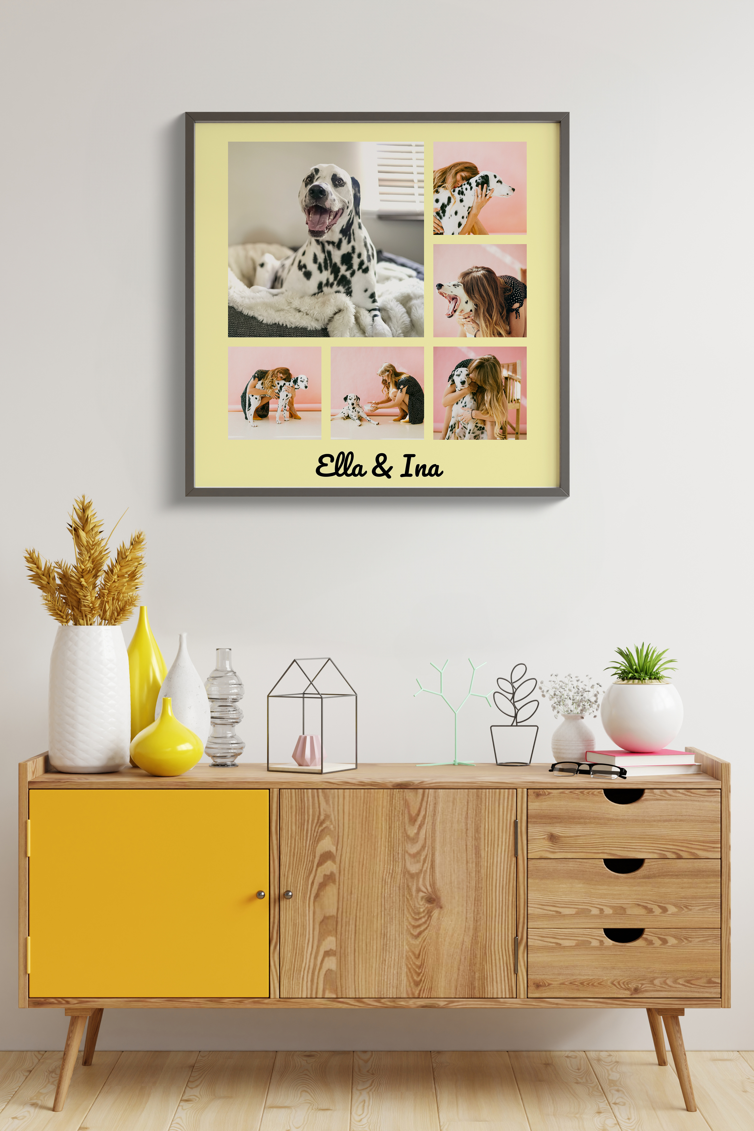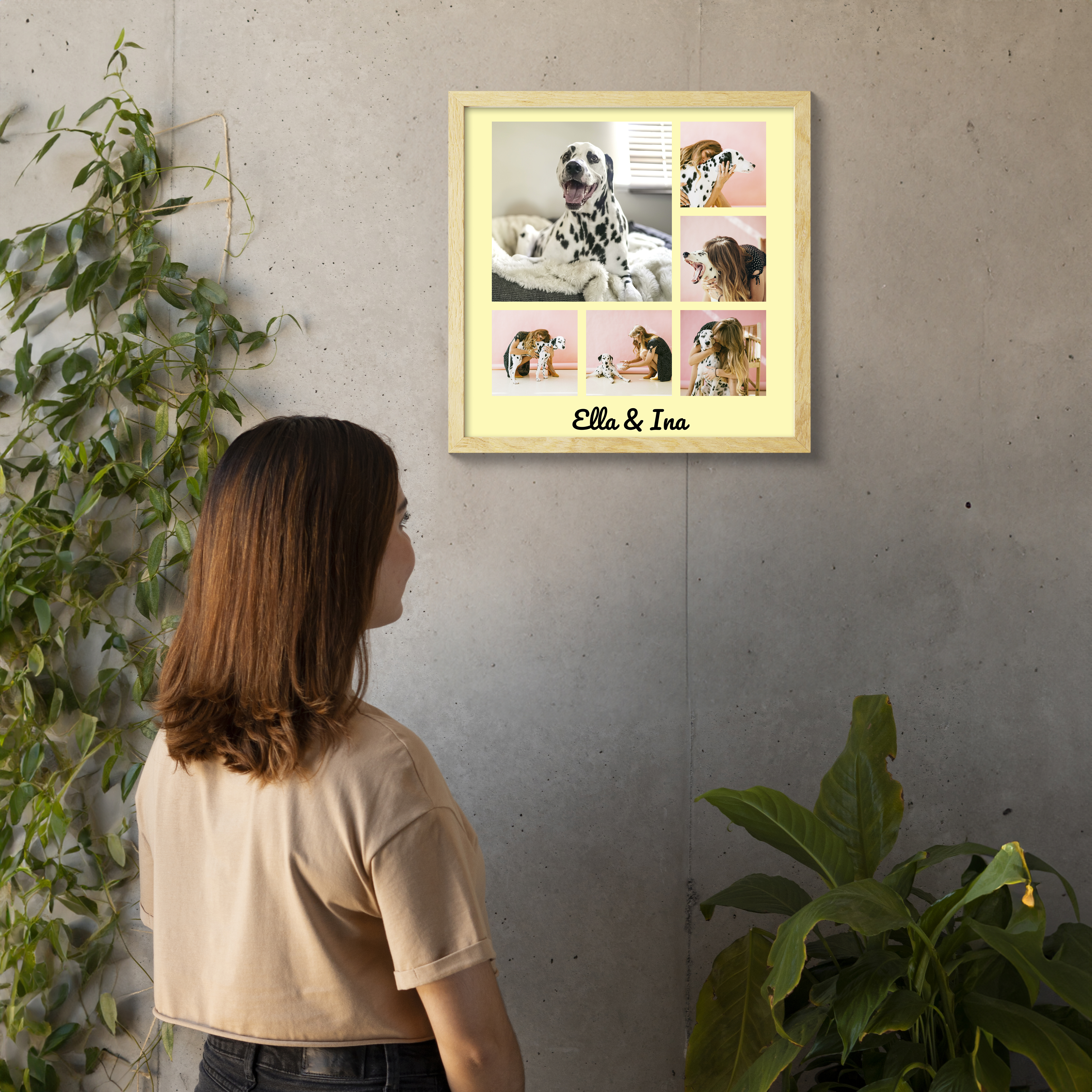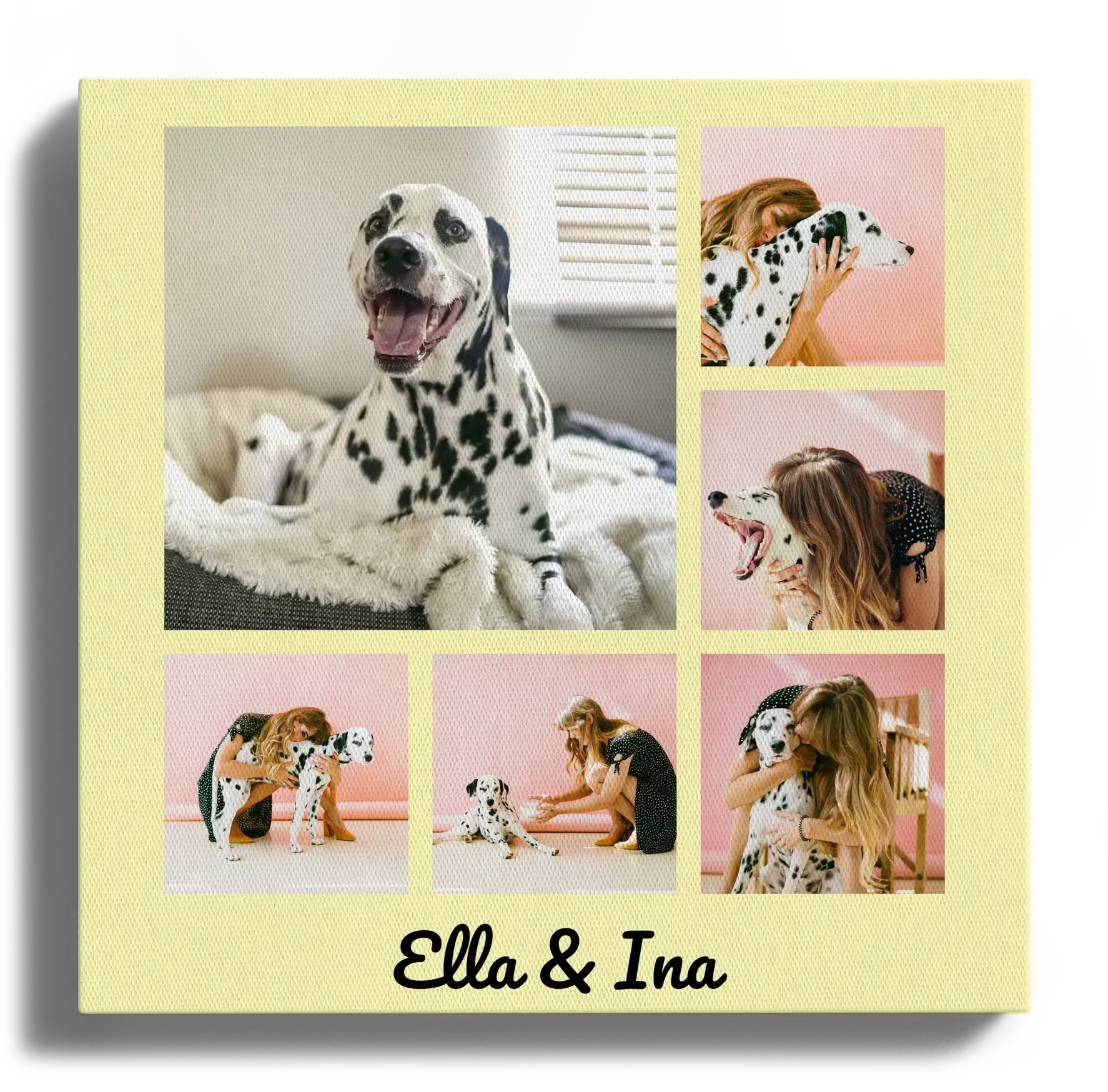 Create your own personalized photo collage today and let your memories take center stage. Imagine a stylish, square design that features six photos, like the cherished moments of a beloved pet. In this example, a larger picture highlights a special shot, complemented by a personal touch with text, like the names "Elle and Ina," representing the bond between dog and owner. You have the freedom to alter the number of images, background colors, texts, and fonts to make it truly yours.