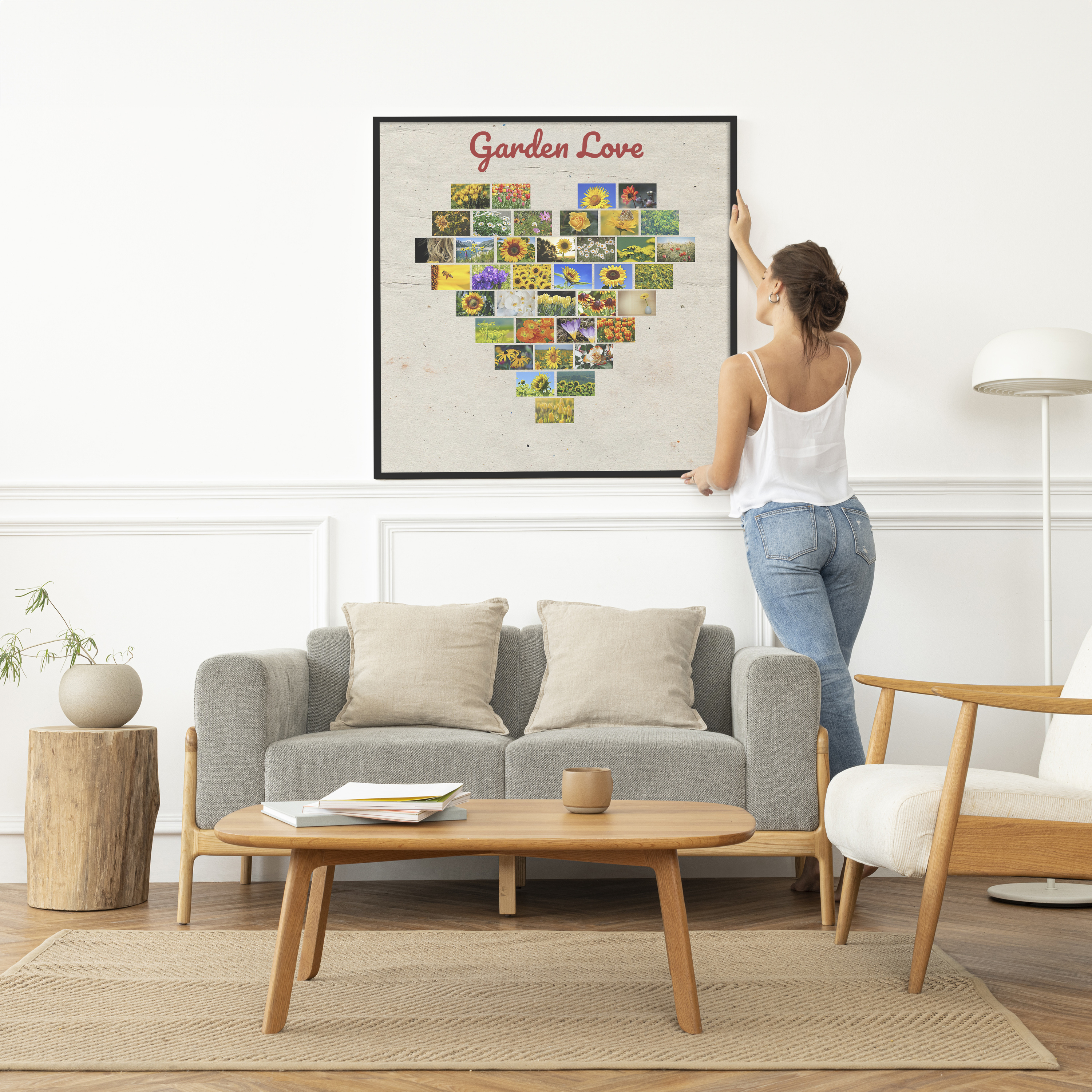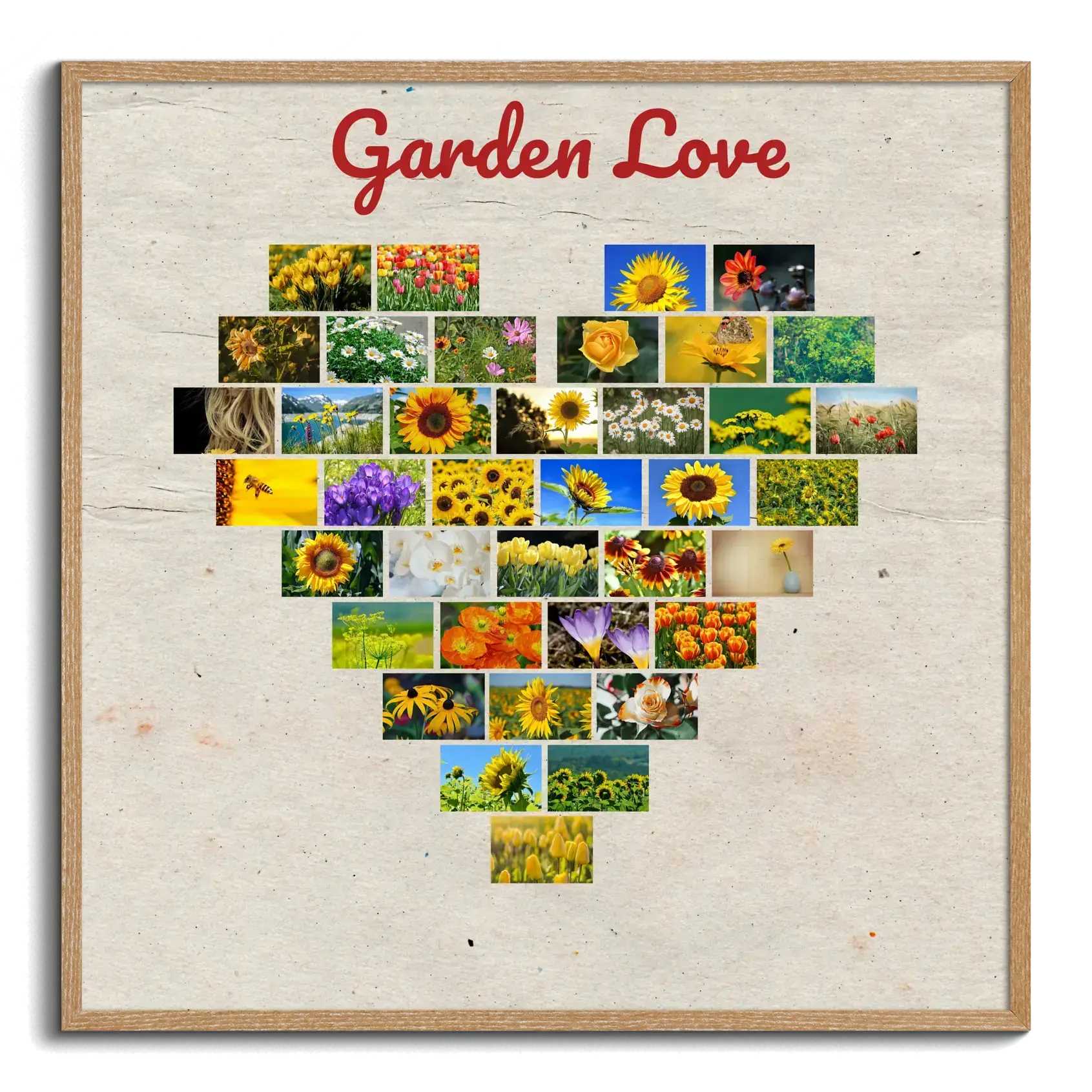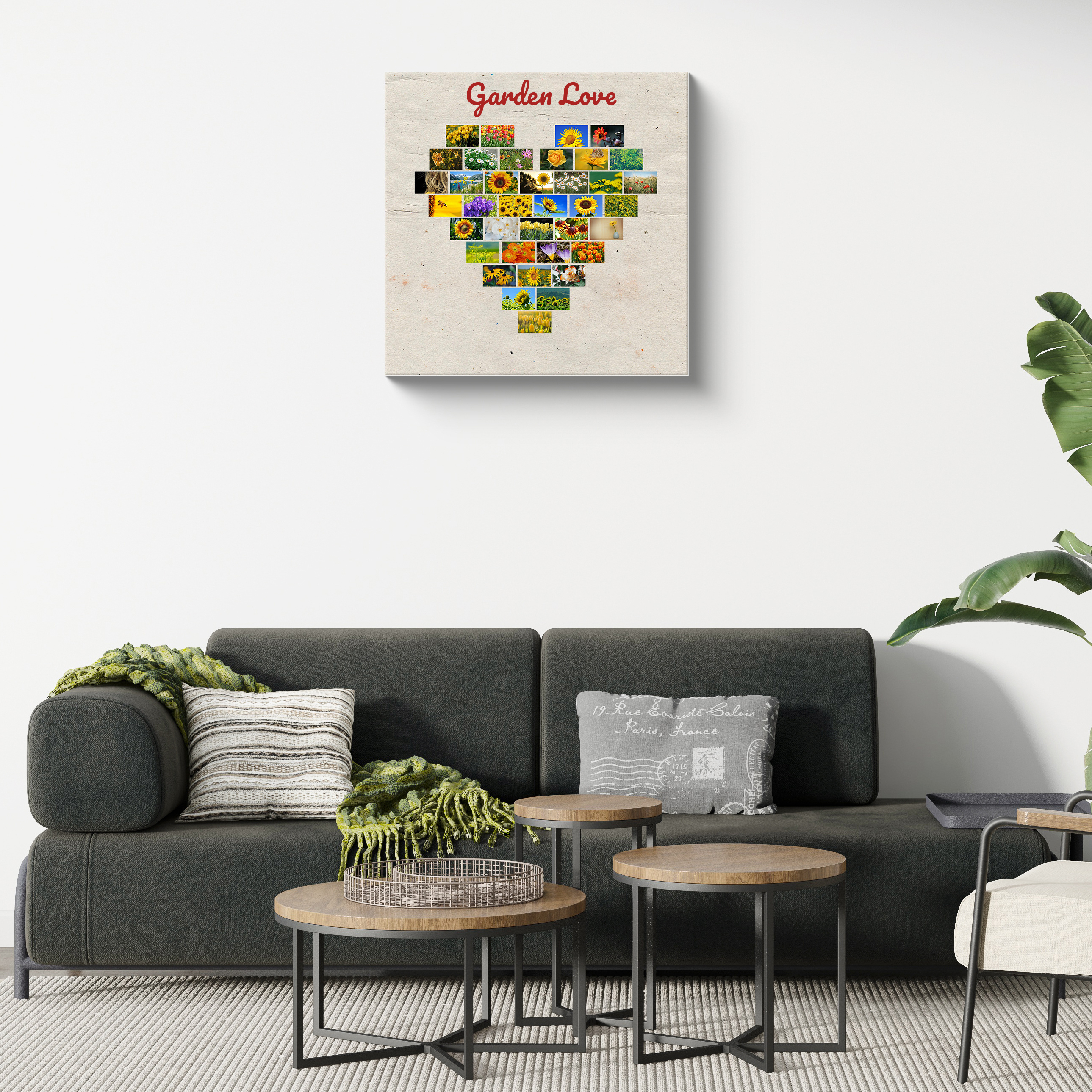 Create your own vibrant heart-shaped collage, full of personal memories and vivid imagery! Our customizable heart collage on canvas is perfect for garden lovers, bursting with your favorite photos set against colorful backgrounds. Add a personal touch with text like "Garden Love". Ideal as a unique gift for friends and family or a charming piece for your home. Customize photos, text, background colors, fonts, and layout effortlessly.