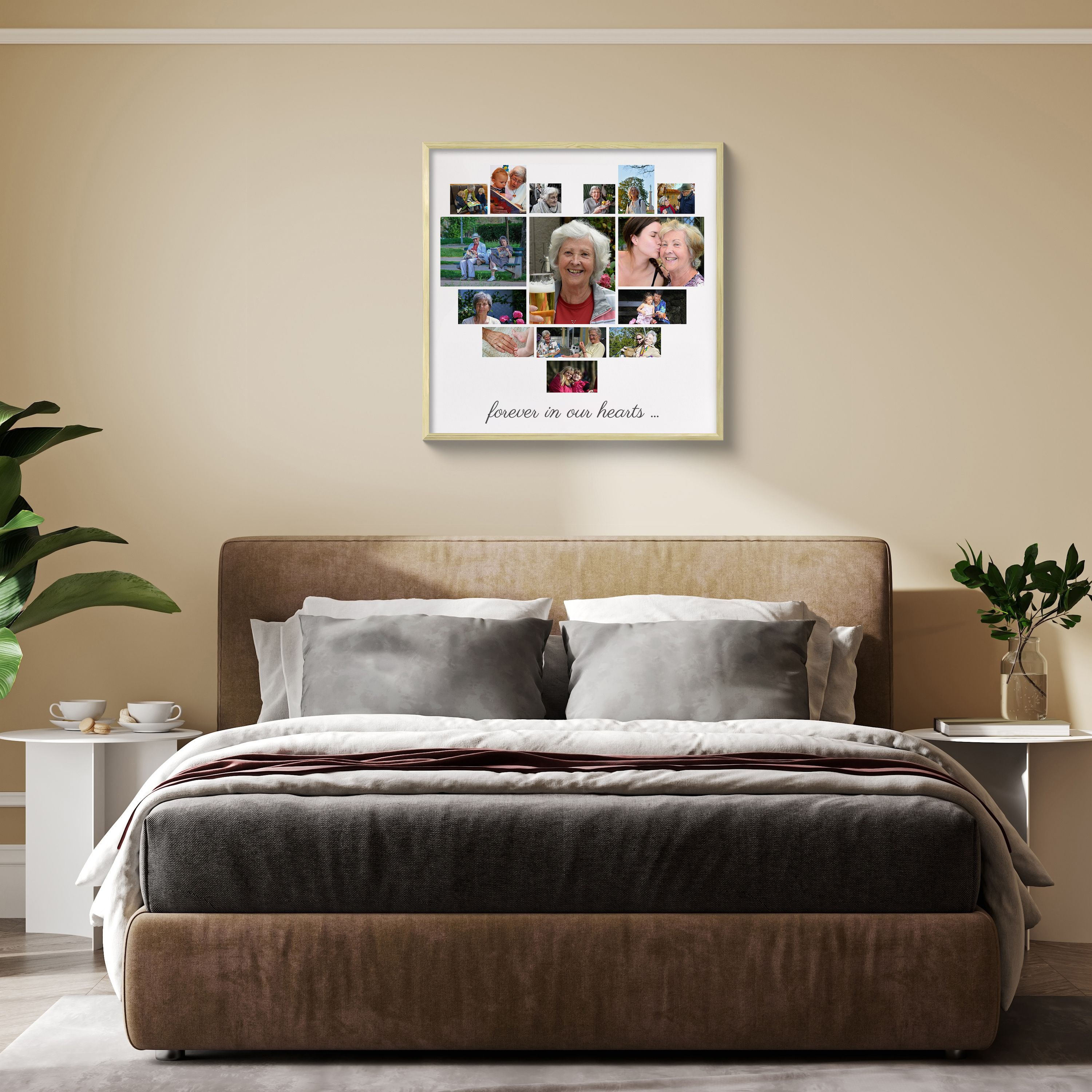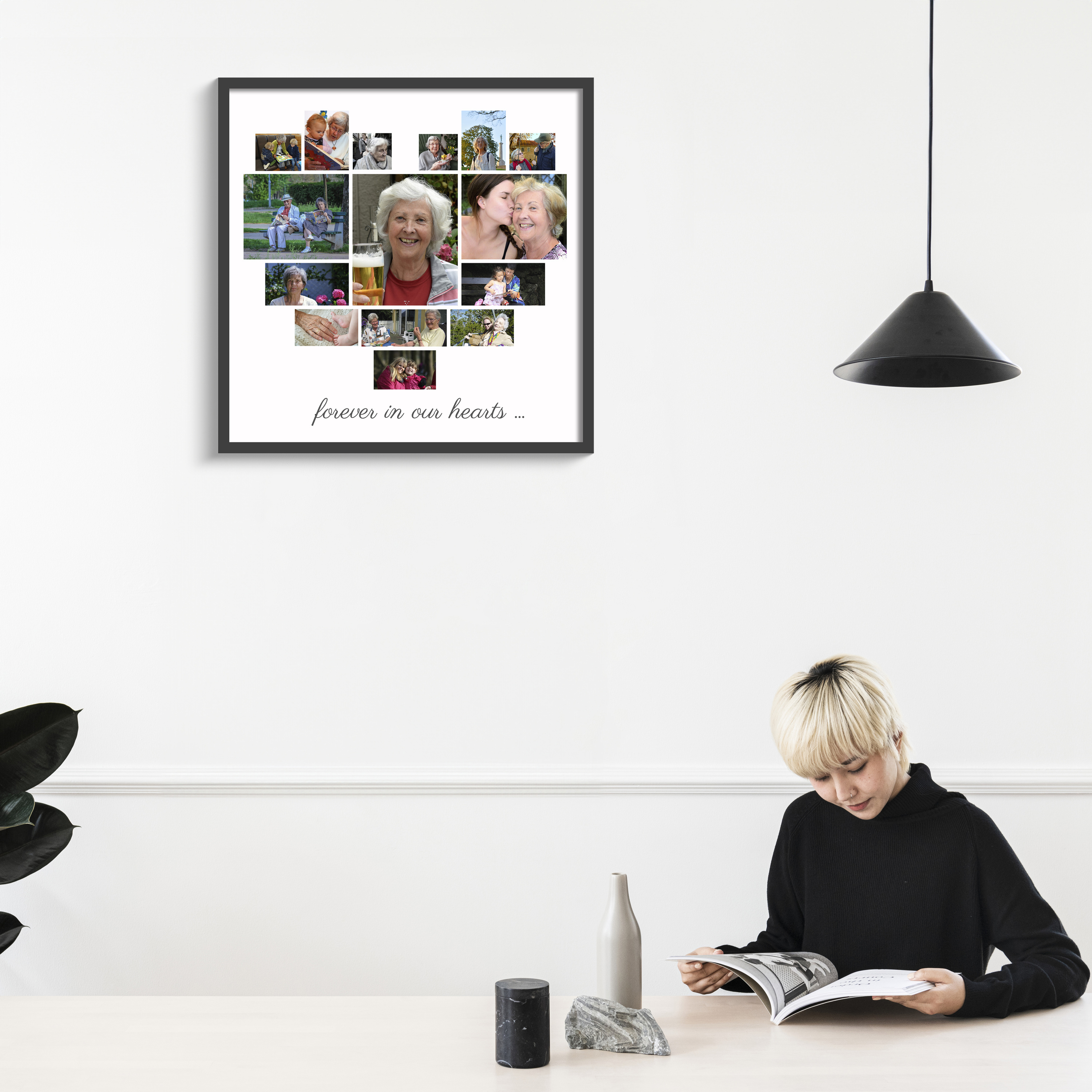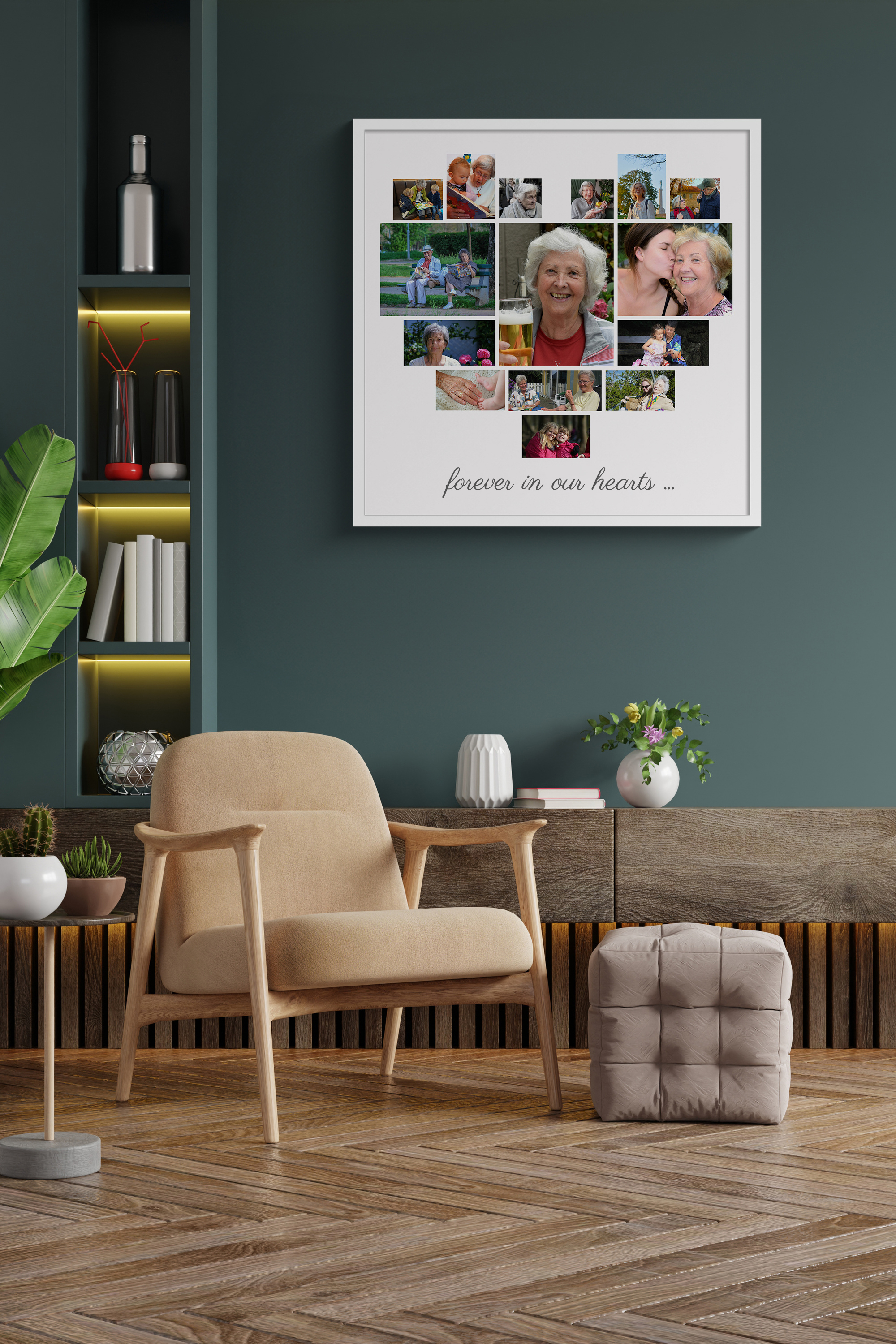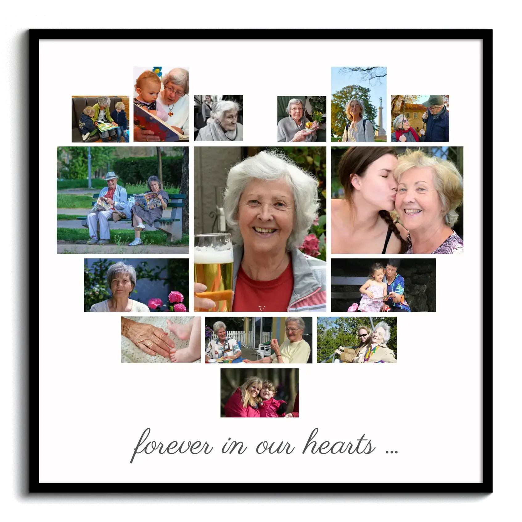 Create your own custom photo collage that speaks from the heart. Imagine gifting your grandmother a beautiful heart-shaped collage with all her cherished memories, perfectly formed by small photos, and centered with a bigger picture that says "forever in our hearts." This product offers a personal touch that makes it ideal for any special occasion or as a heartfelt tribute.