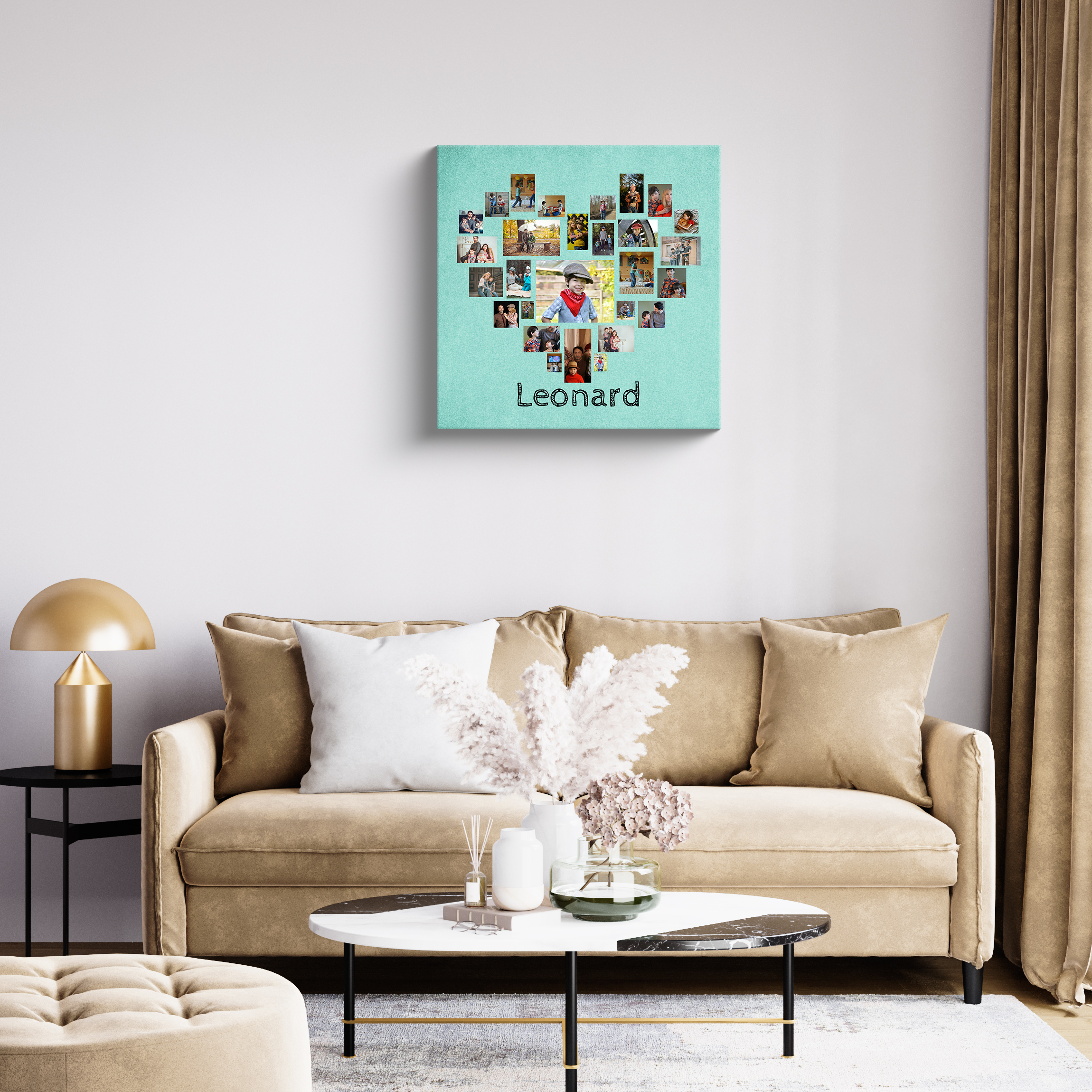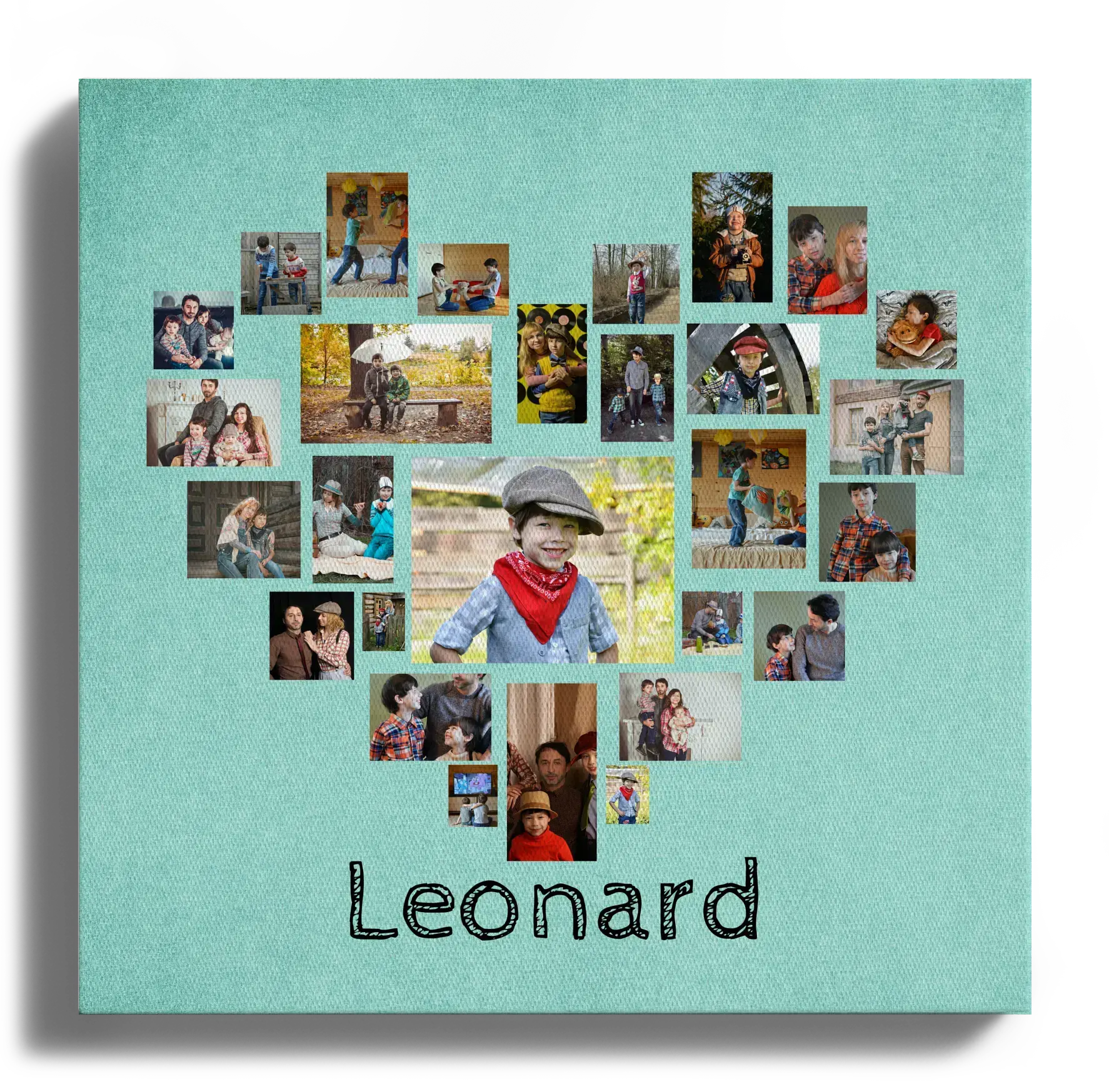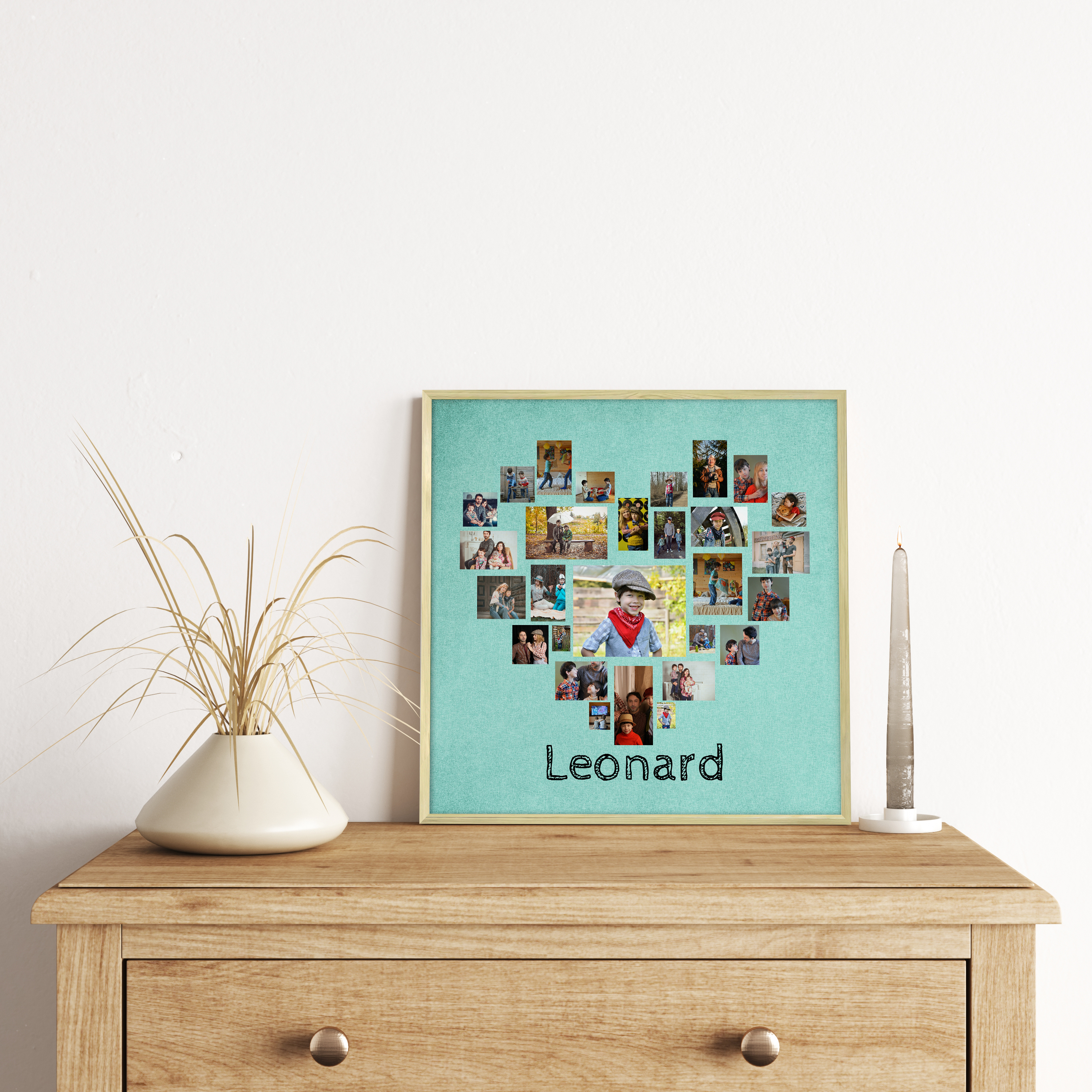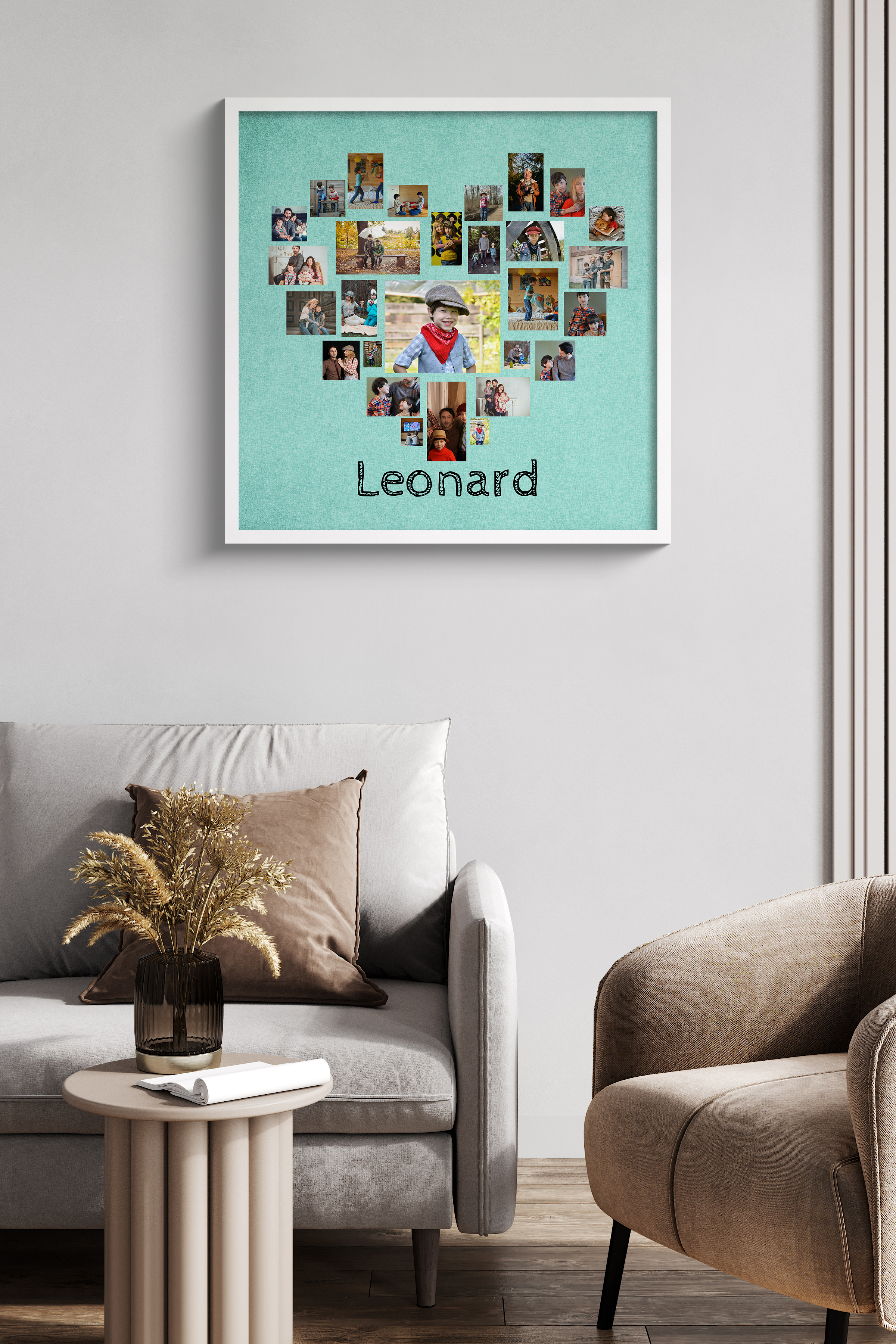 Designing your collage is easy. Start by choosing from various customizable templates, like the heart shape for that special touch. Upload your photos directly from your computer, tablet, or smartphone, and arrange them to your liking. Once you're satisfied, click to add it to your cart in your preferred format or download the high-resolution file.