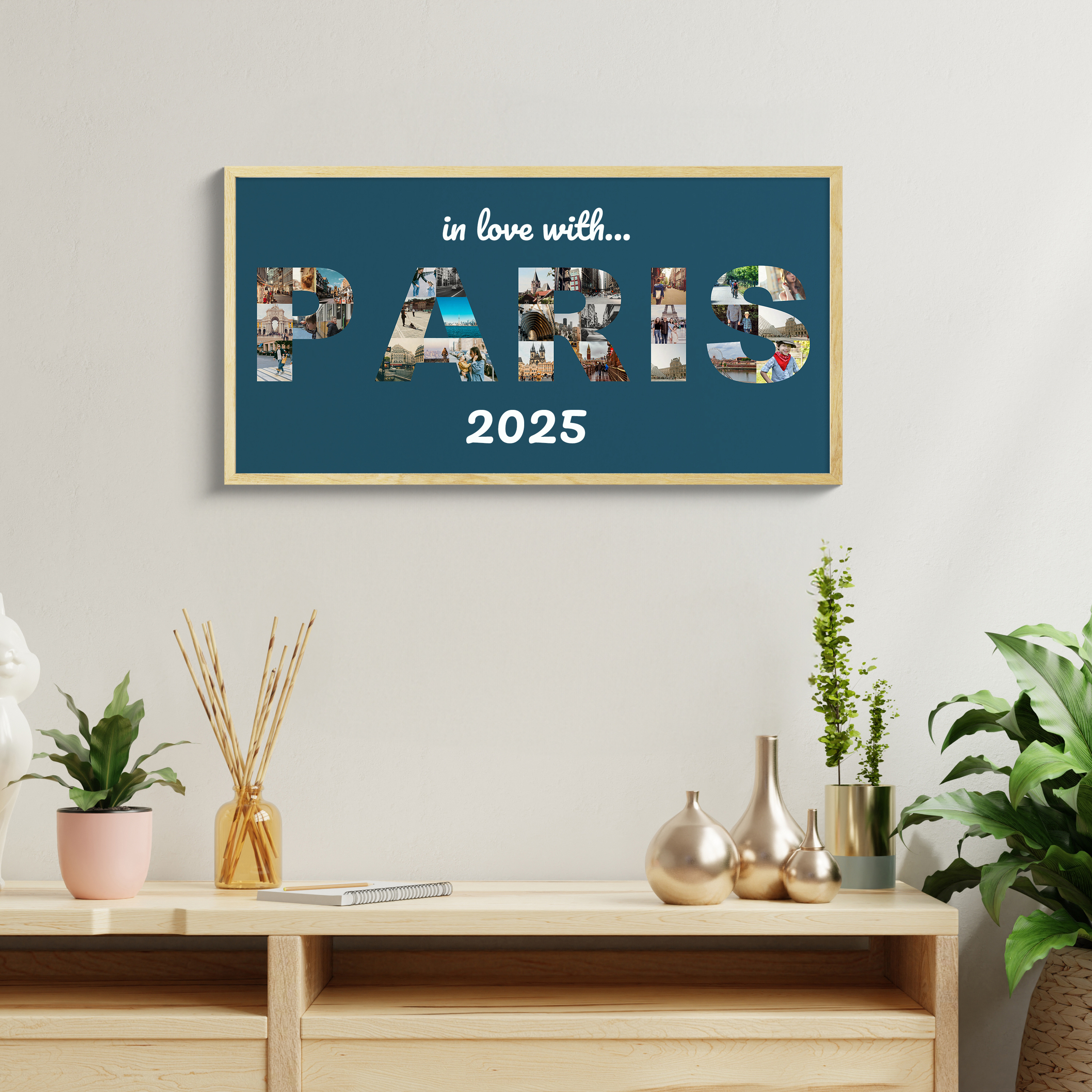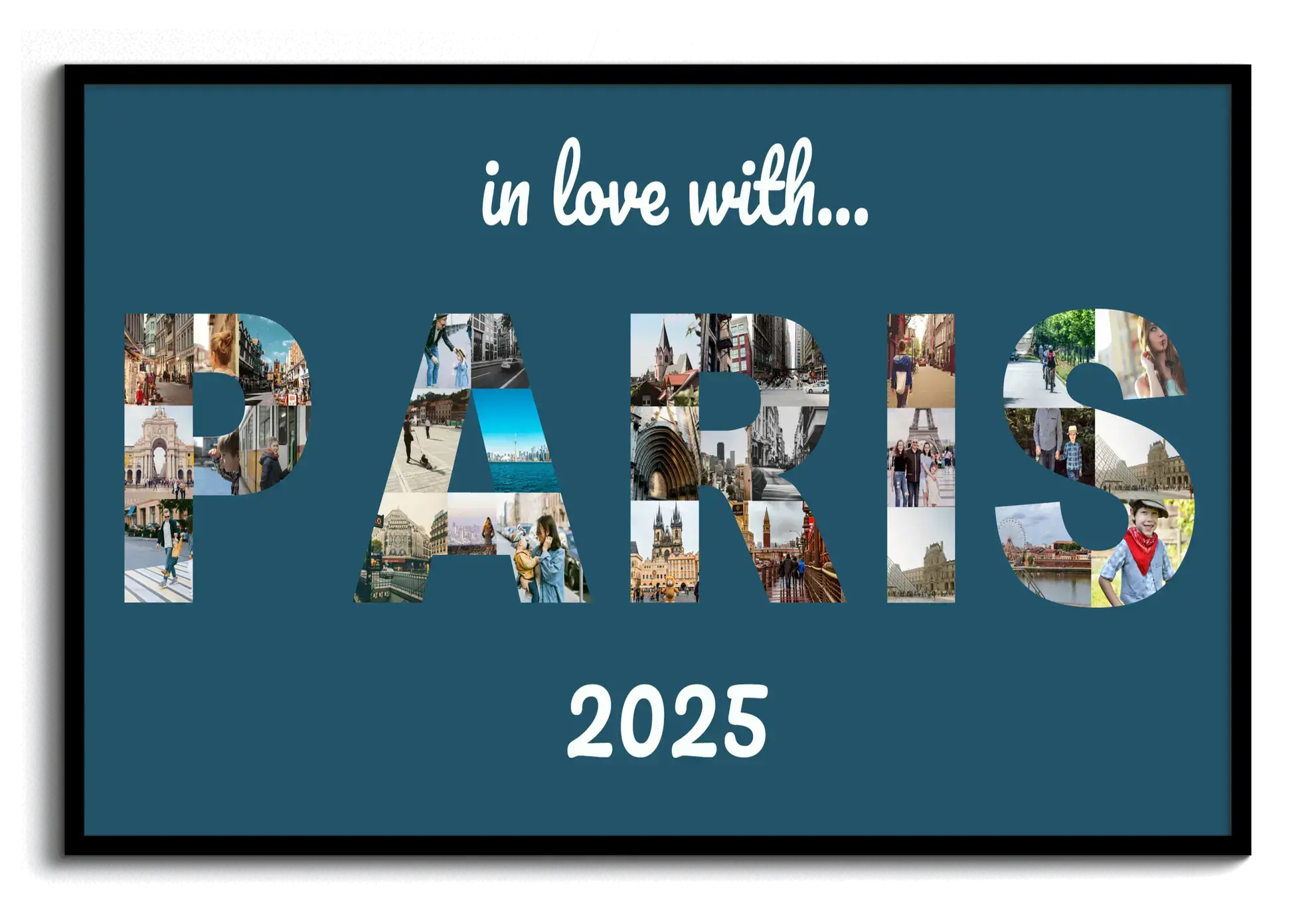 Paris name spelled in photos on premium canvas with deep blue background; fully customizable.