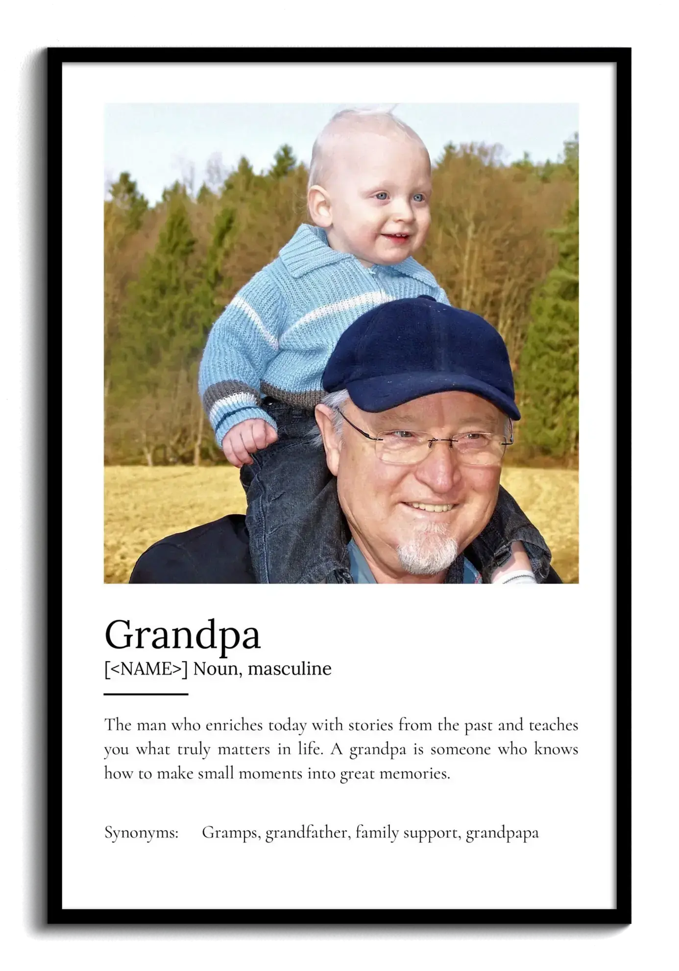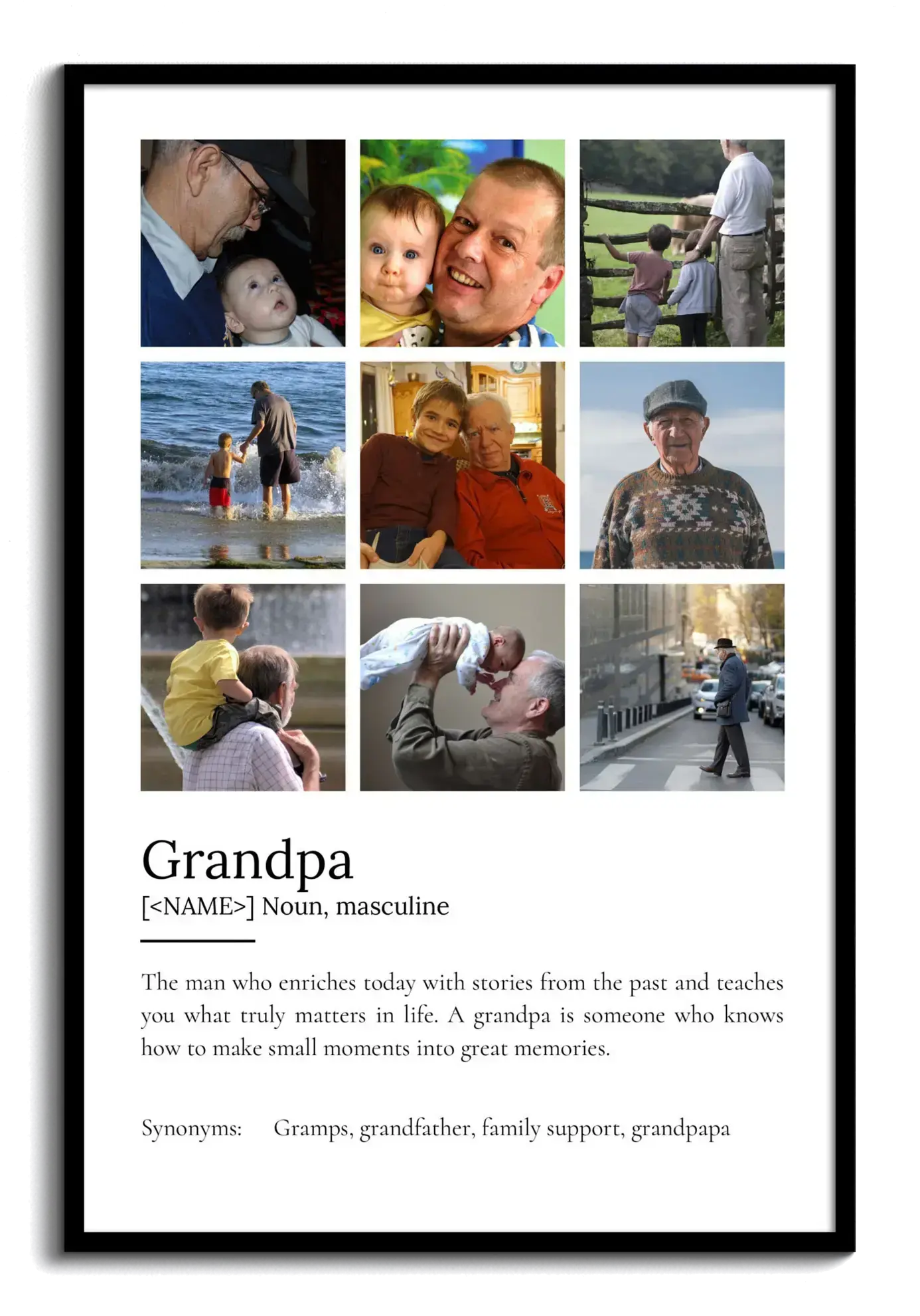 Create a heartfelt memento for your grandpa with our customizable Definitions-Poster 'Grandpa' in the iconic dictionary style. Designed as a personalized gift, this poster features space for your own photo, with room for up to nine images. Add a loving touch with a predefined definition that captures the essence of a grandpa - "The man who enriches today with stories from the past and teaches you what truly matters in life. A grandpa knows how to make big memories out of little moments." Customize the text, color, photos, and layout to make it truly unique.