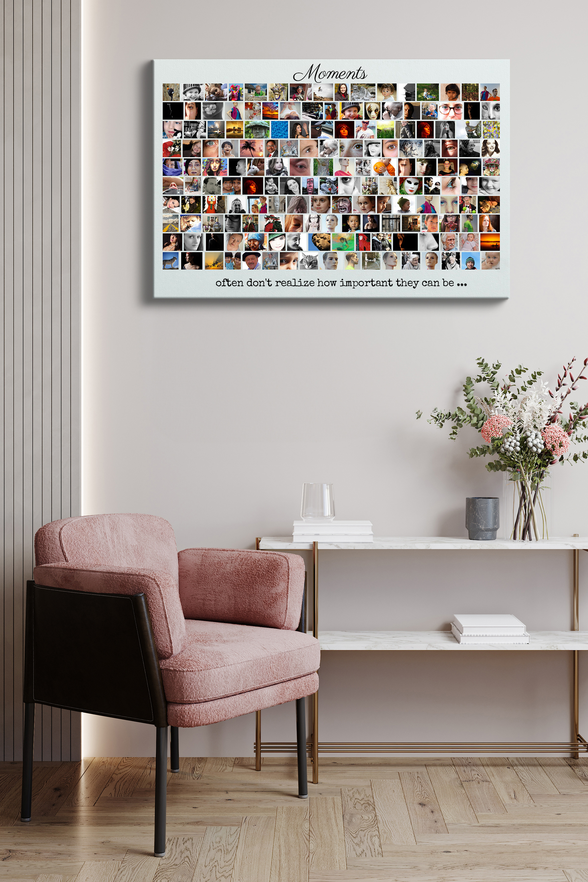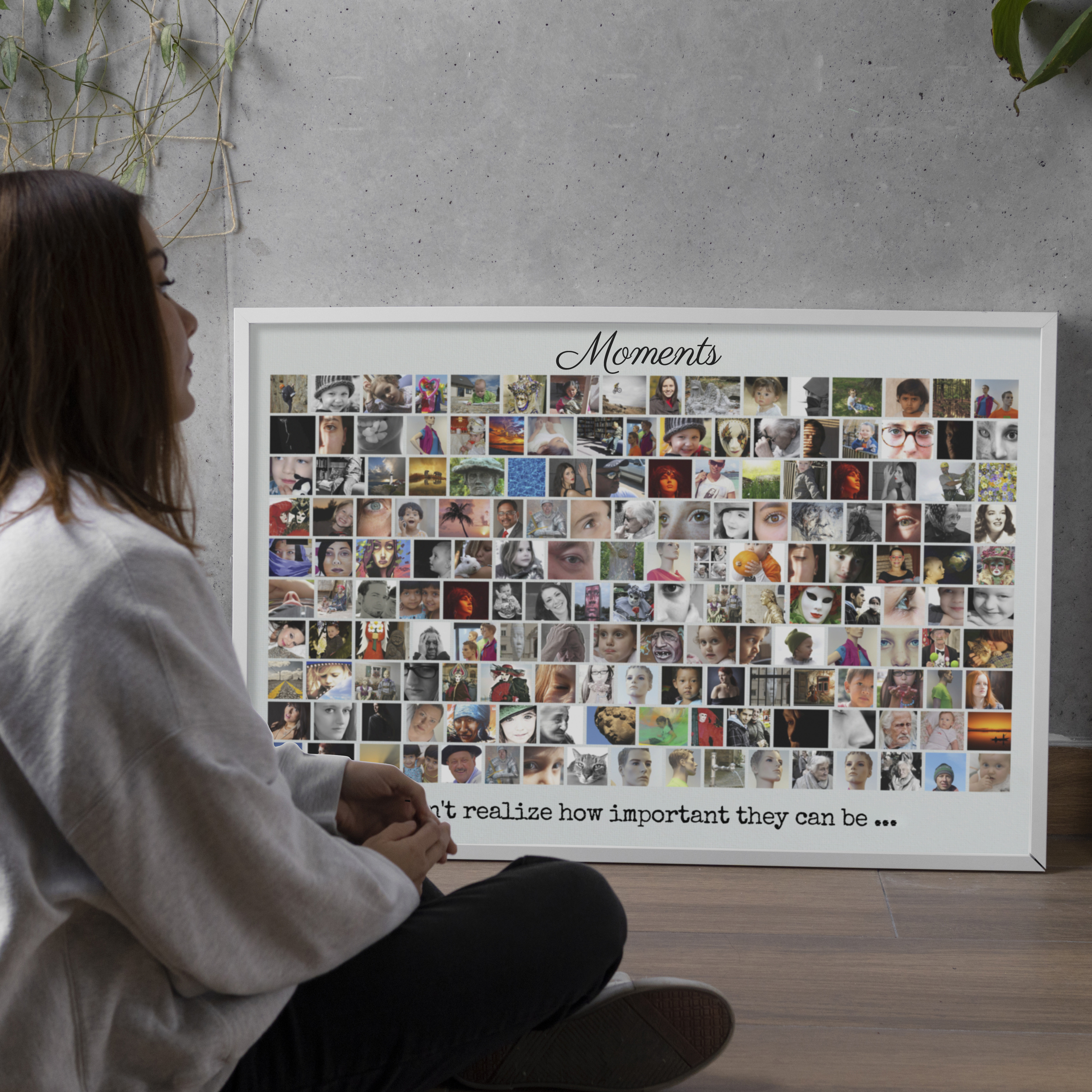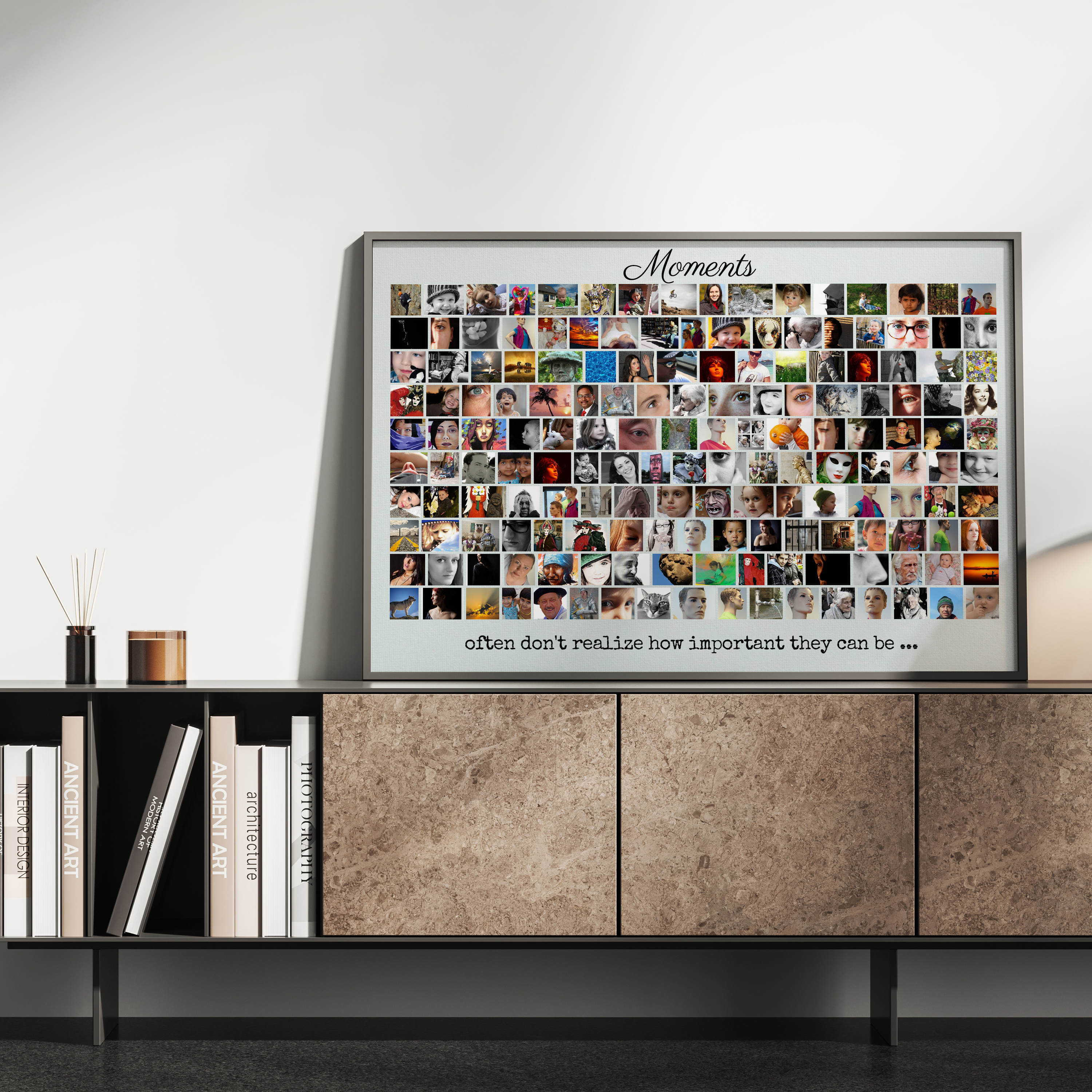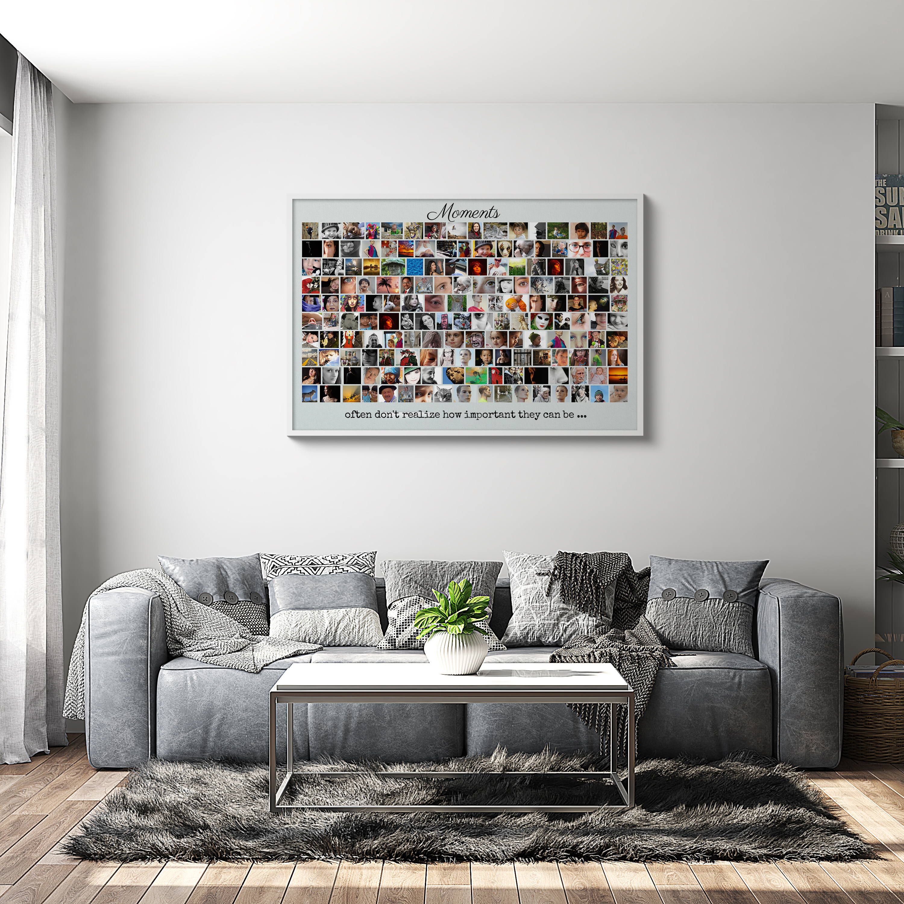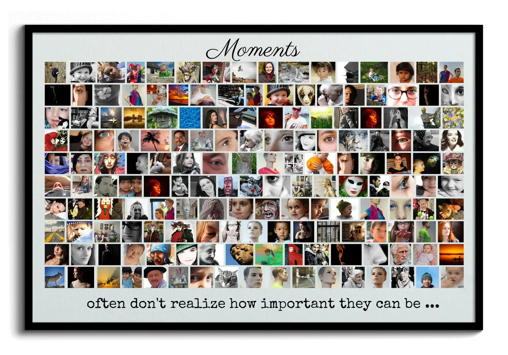 Create your own personalized photo collage masterpiece and cherish those unforgettable moments! This horizontal photo collage is crafted with a stunning array of images organized in neat rows, making it an ideal personal gift or decorative highlight. Add your unique touch with a custom inscription like "Moments – often unaware of how important they can be...", adjustable to your liking. Imagine creating this collage with anywhere from 5 to over 160 photos, tailoring it to capture the essence of your cherished memories.