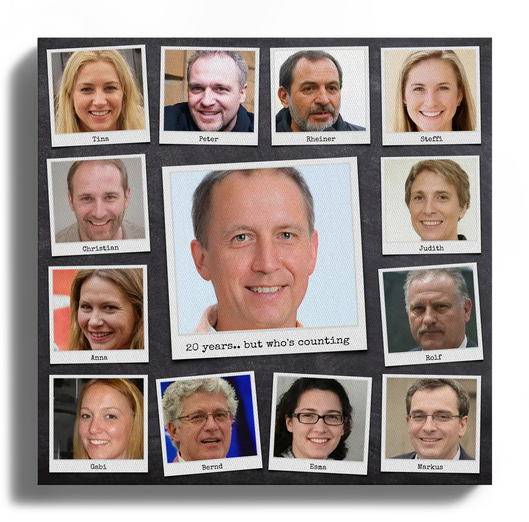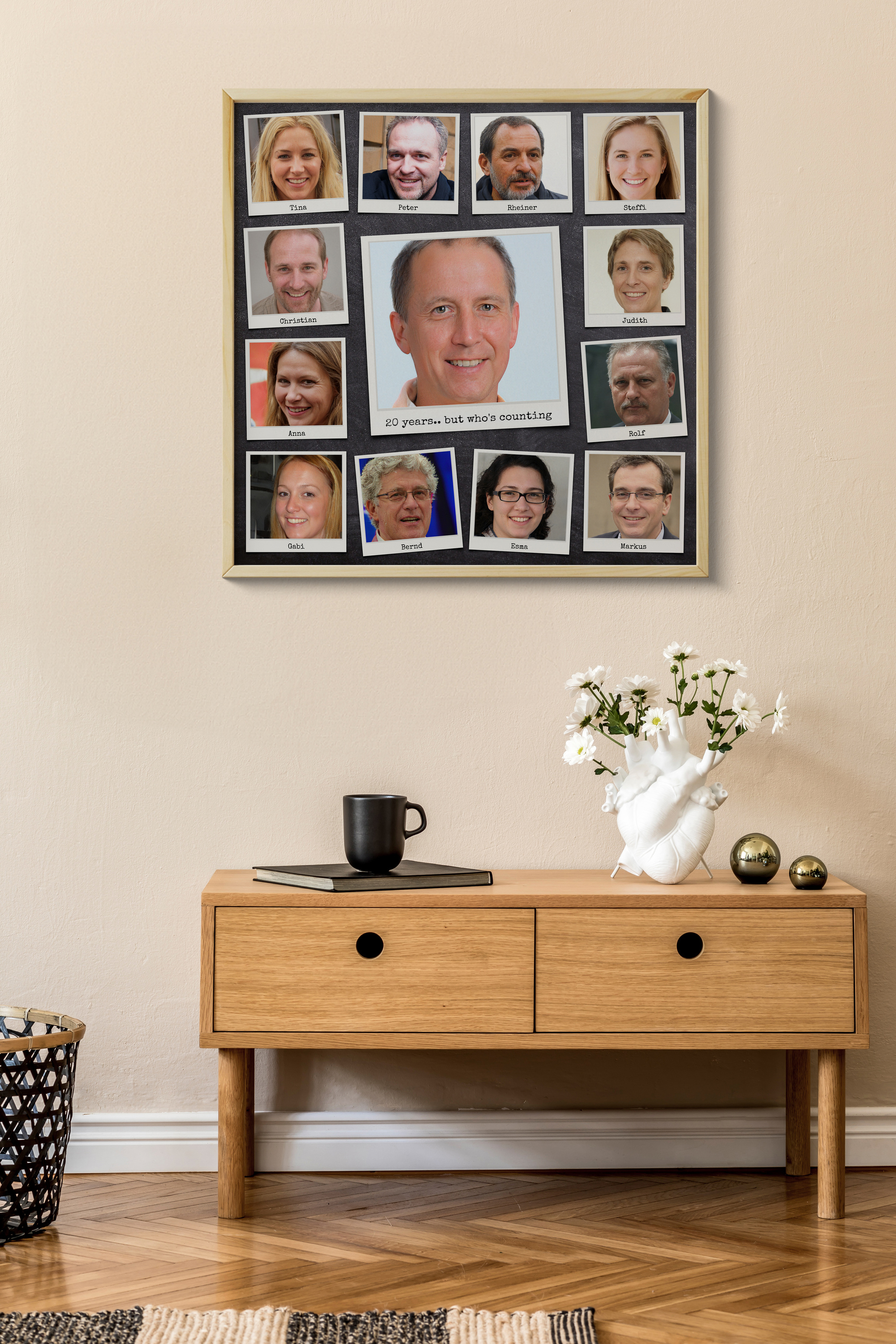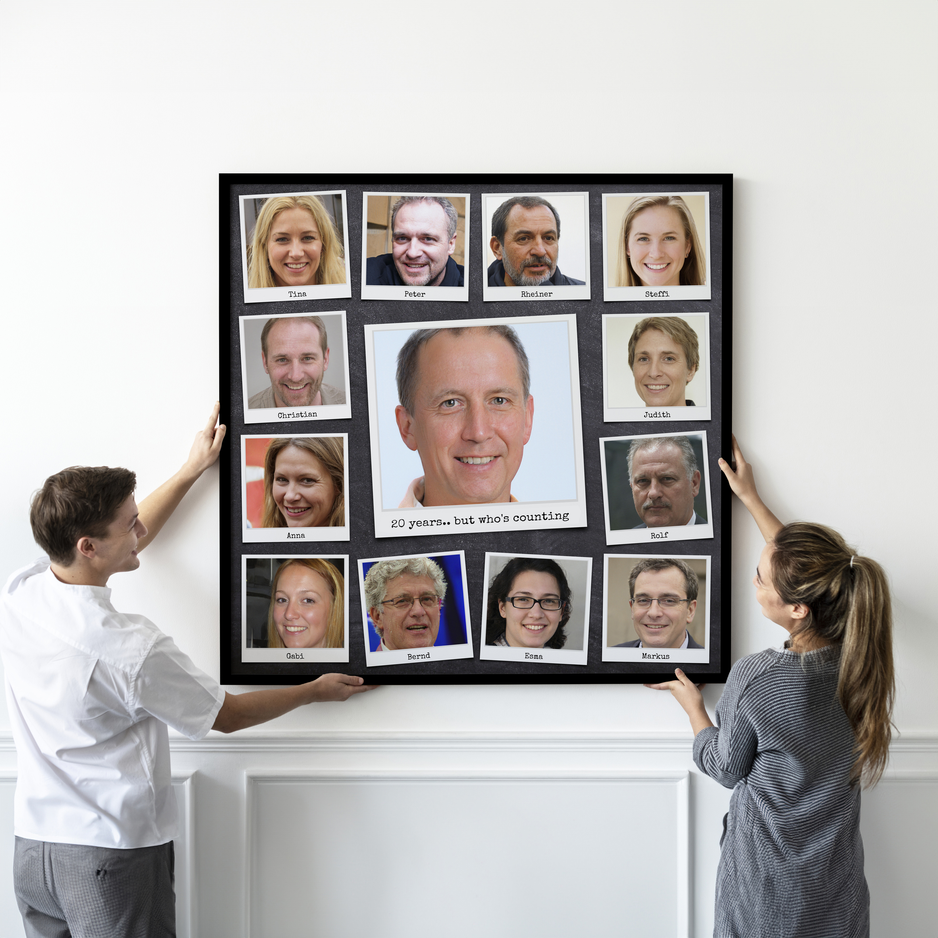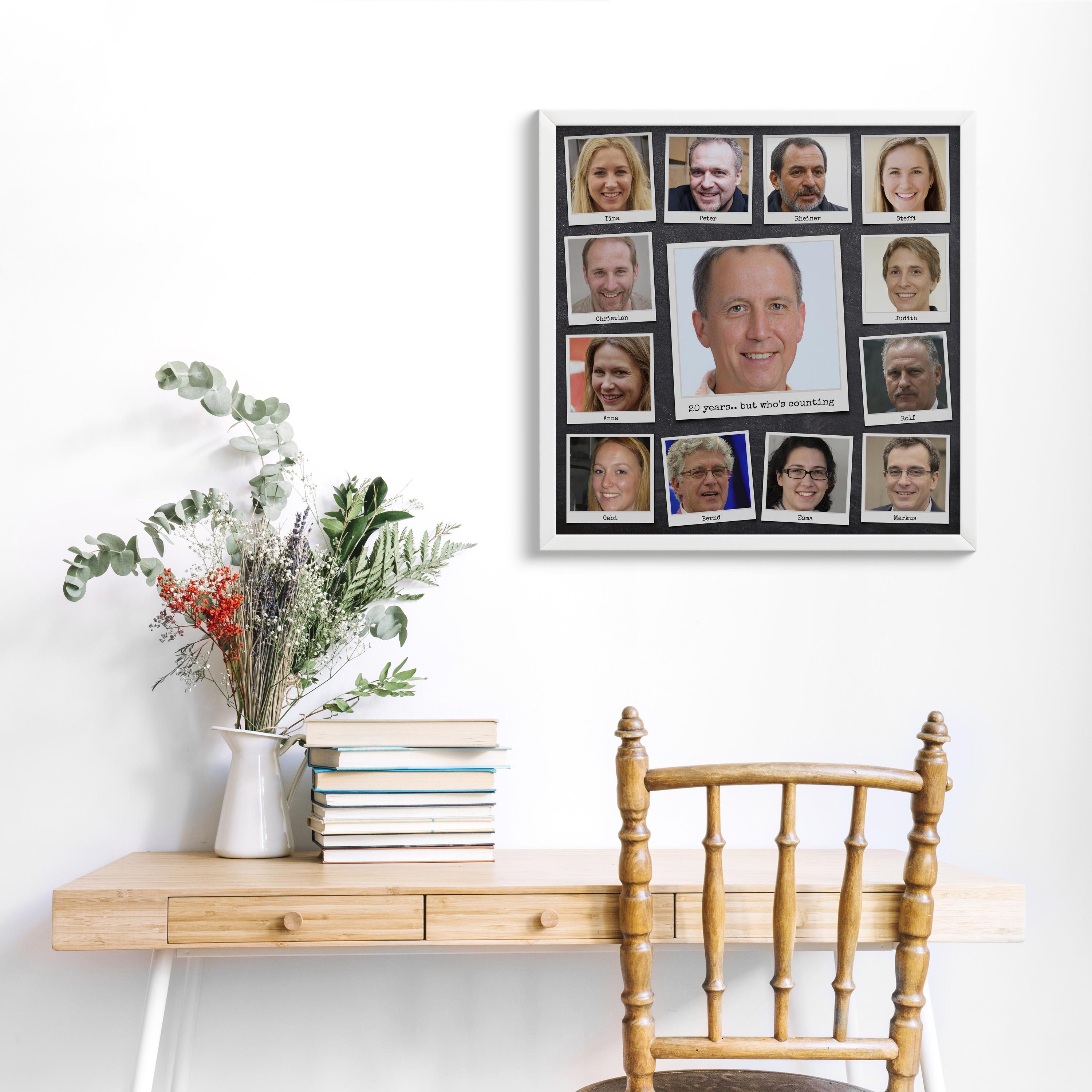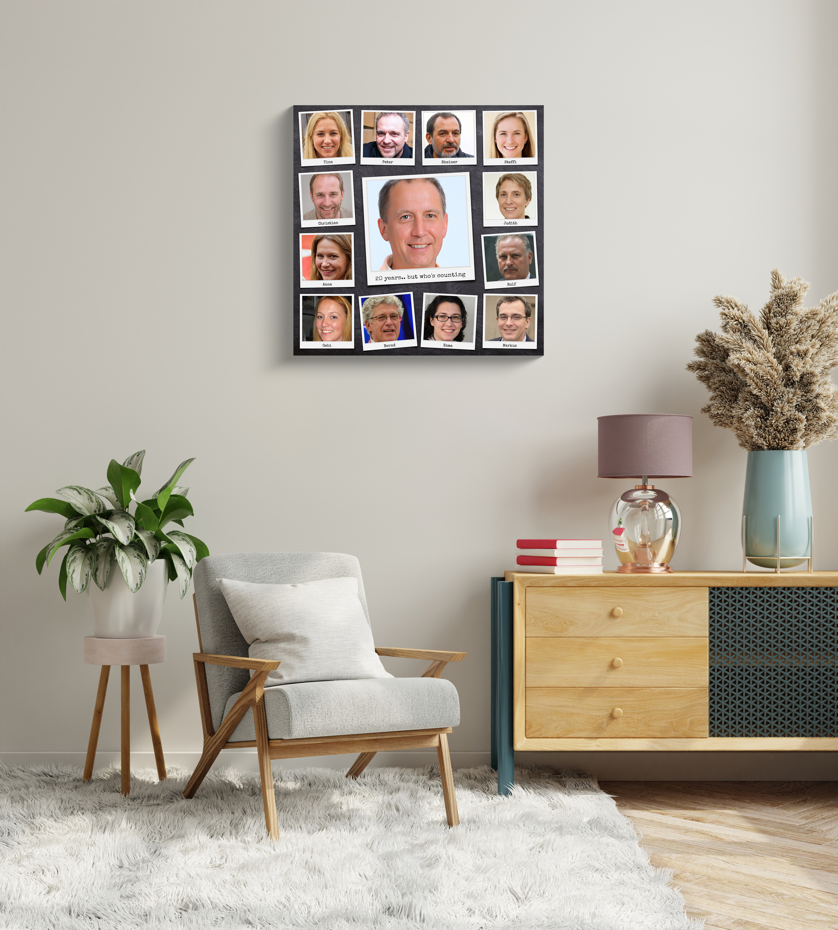 Create a lasting memory with our customizable Polaroid-style photo collage, perfect for a retirement or anniversary gift. This design features individual photos with names, and a larger central photo with the phrase 20 years.. but who’s counting. Personalize it with your own images and text for a unique keepsake.