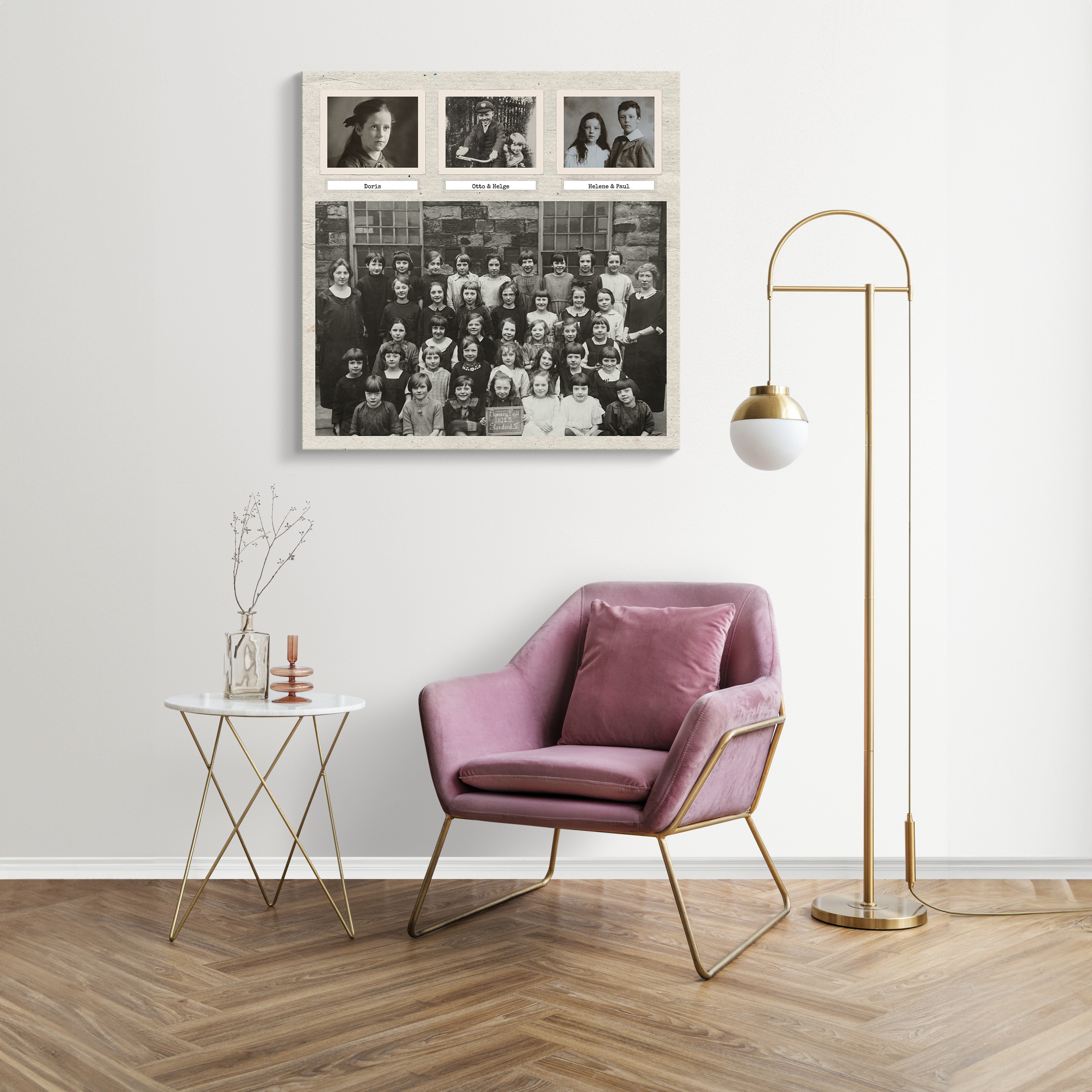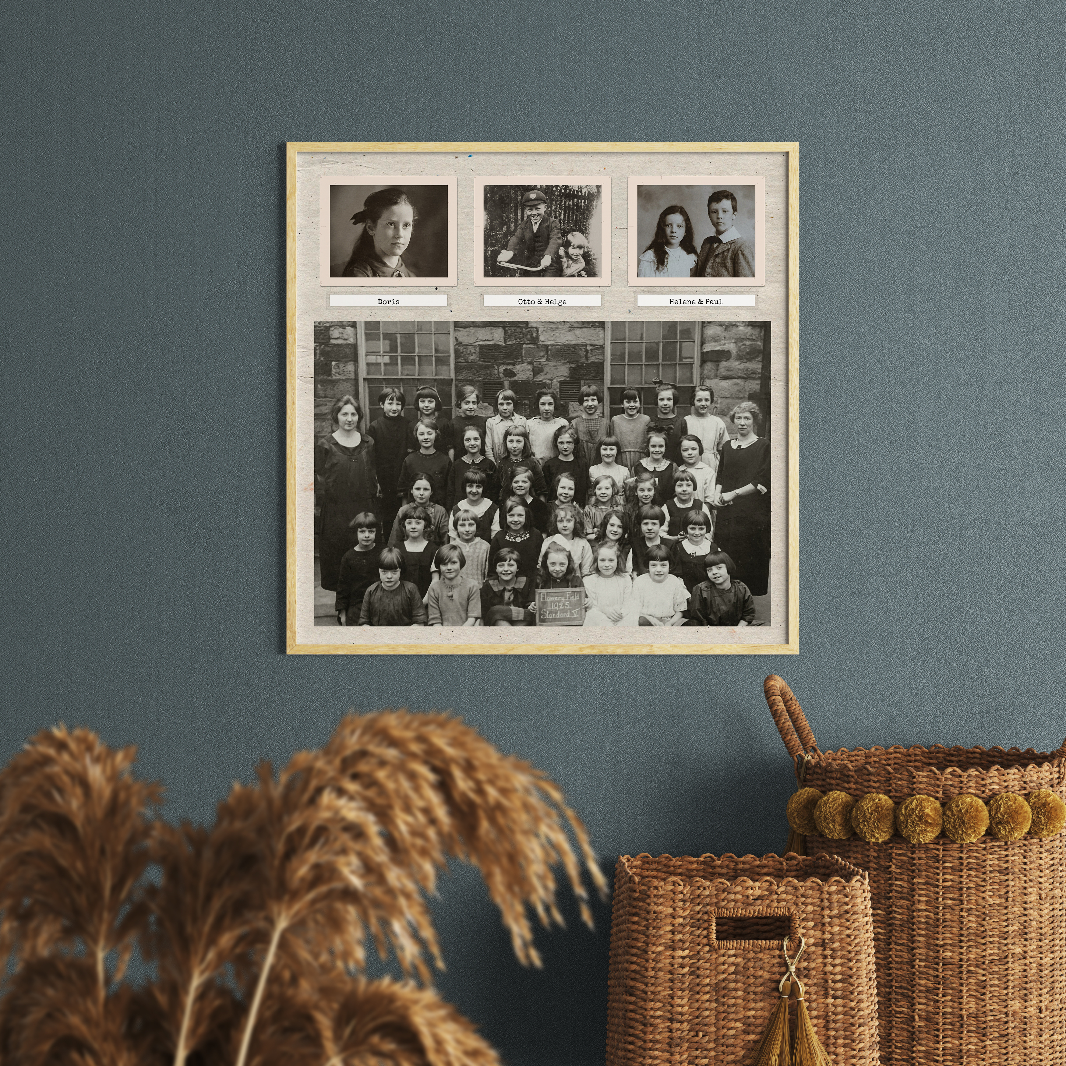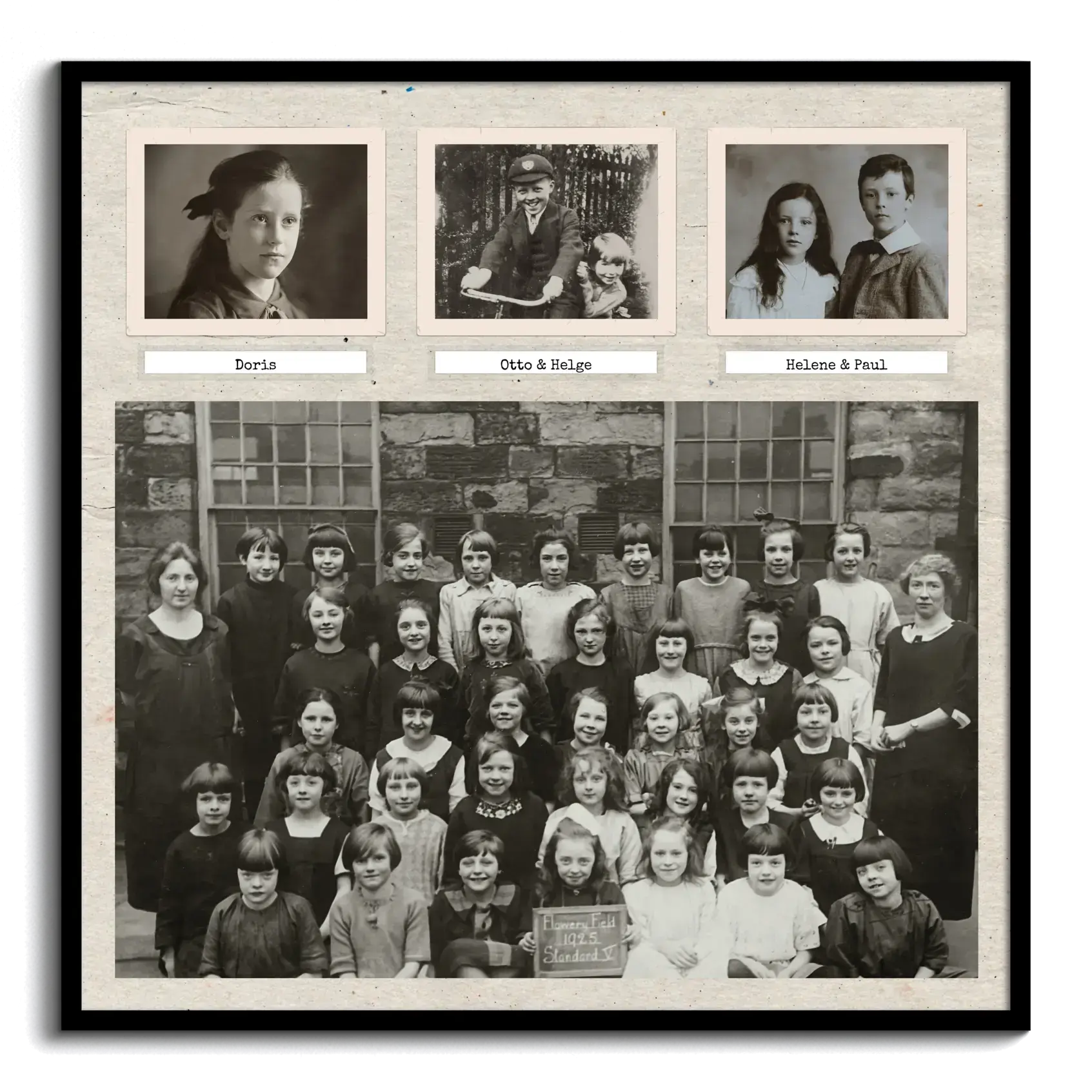 Create your own personalized photo collage today! Imagine a charming retro-style collage featuring a large black-and-white class photo, complemented by three smaller Polaroid pictures, each with a name above it. It's perfect as a school-time memento, ideal for gifting to teachers, students, or parents alike.