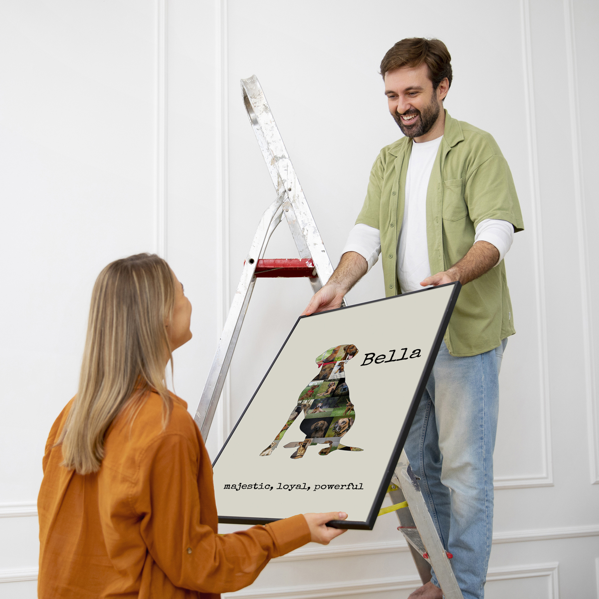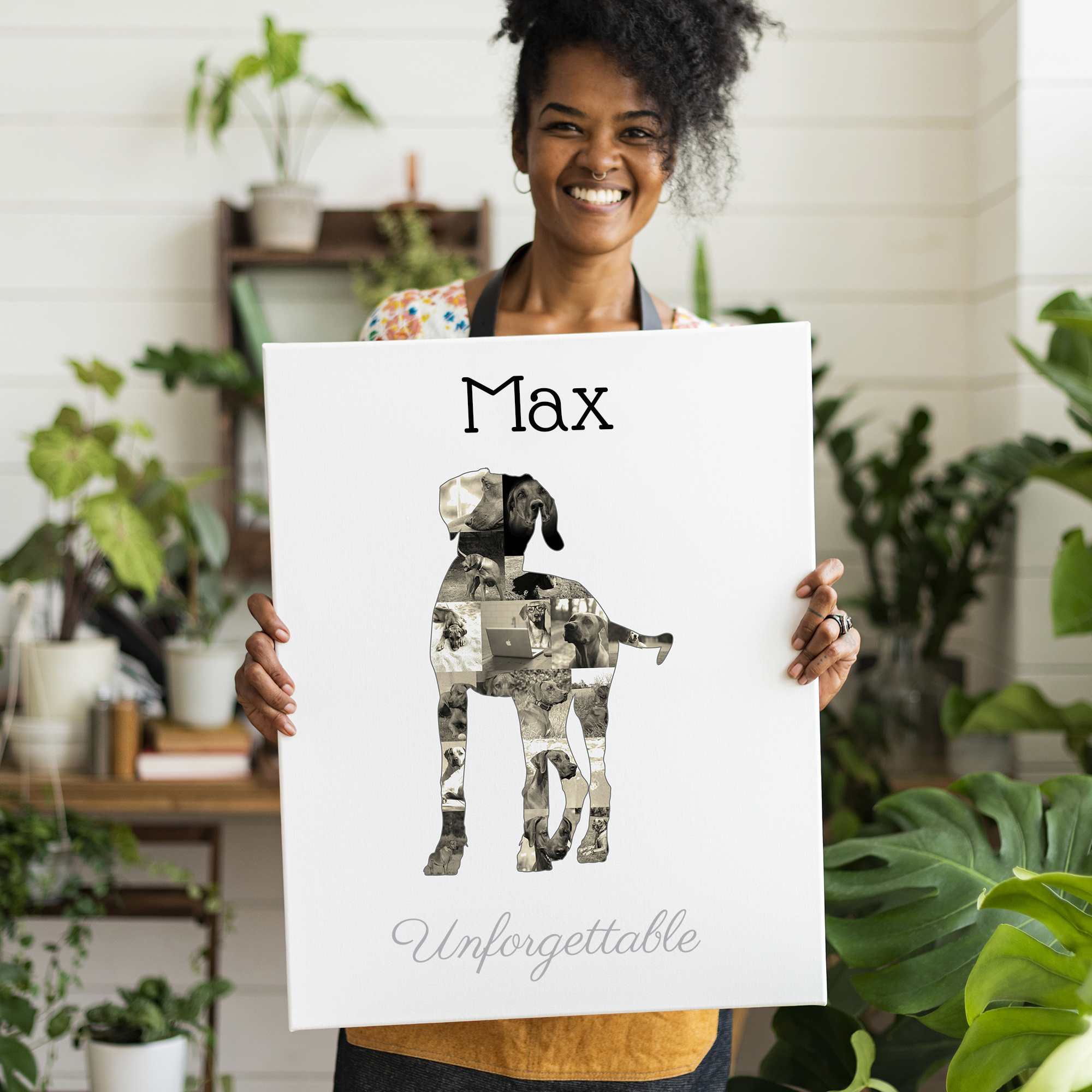 Creating this personalized photo collage is super easy. Choose your preferred silhouette, upload your favorite photos, and place them within the design. You can add text to make it even more special. Once you're happy with your creation, select your printing option, and we'll handle the rest.