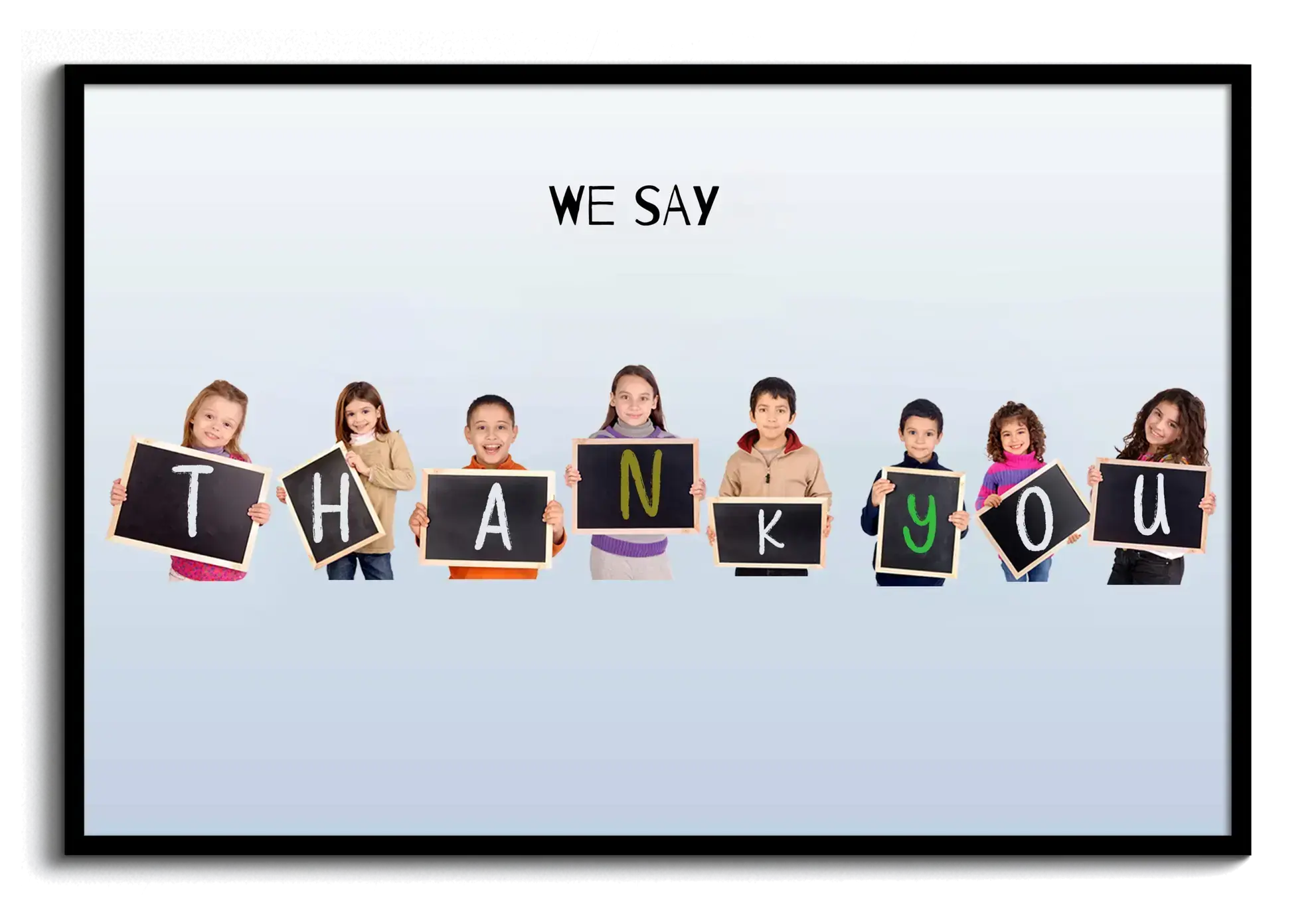 Create something truly special and say "Thank You" in a unique way with our customizable photo collage. Imagine a group of schoolchildren holding up letter boards to spell out "THANKS," accompanied by the heartfelt phrase "We say Thank You." It's the perfect gift for teachers, a charming display in classrooms, or a memorable keepsake for parents. Every aspect, from photos, colors, font, to the saying and layout, is yours to personalize.