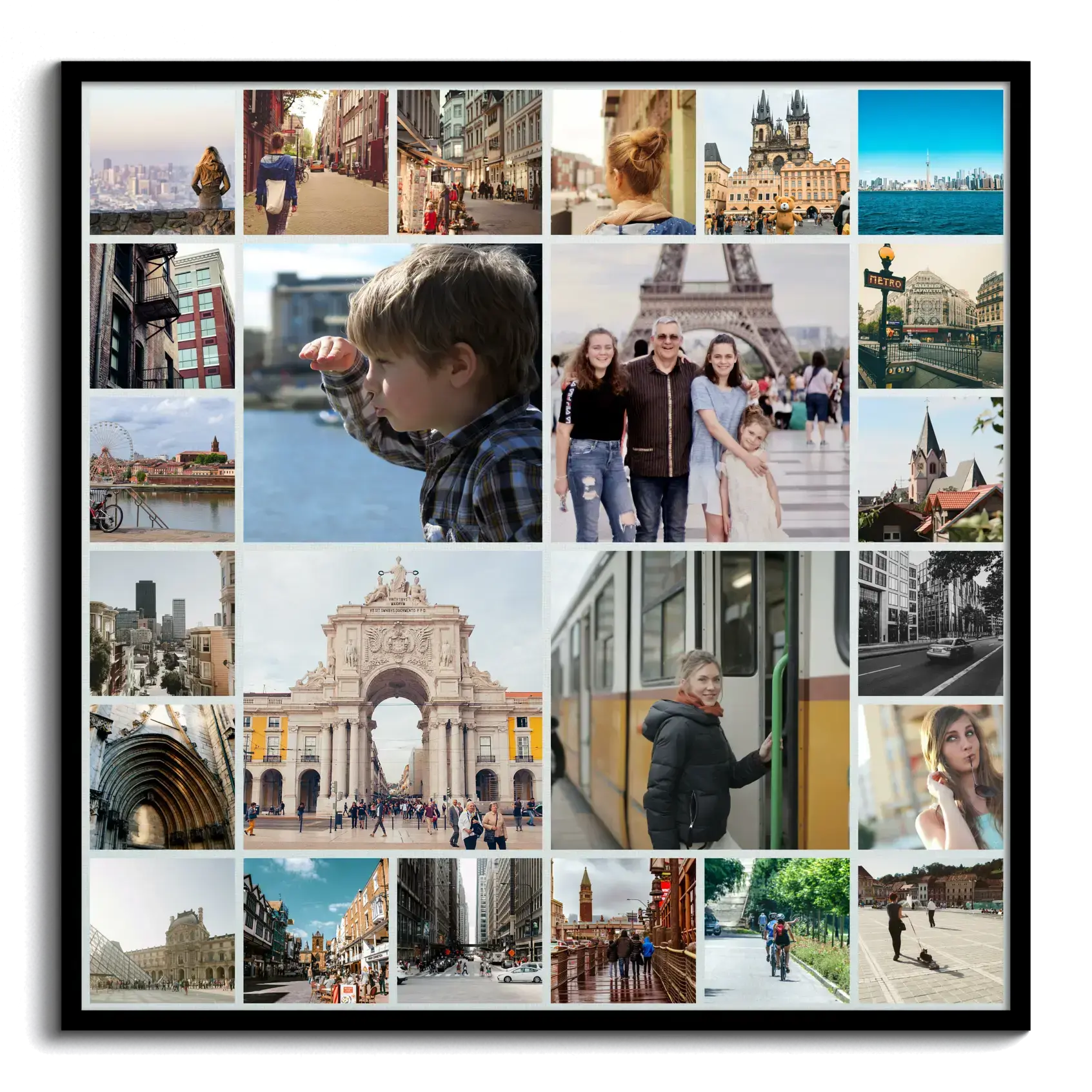 Create your own stunning photo collage today and capture your cherished memories in a unique arrangement. This example product features a square photo collage on high-quality Alu-Dibond, showcasing vacation photos with four large images in the center surrounded by smaller ones. Its minimalist and timeless design perfectly suits travel enthusiasts, families, or couples, making it a delightful decorative piece for your home or a heartfelt gift. Personalize the photos and layout to fit your style.