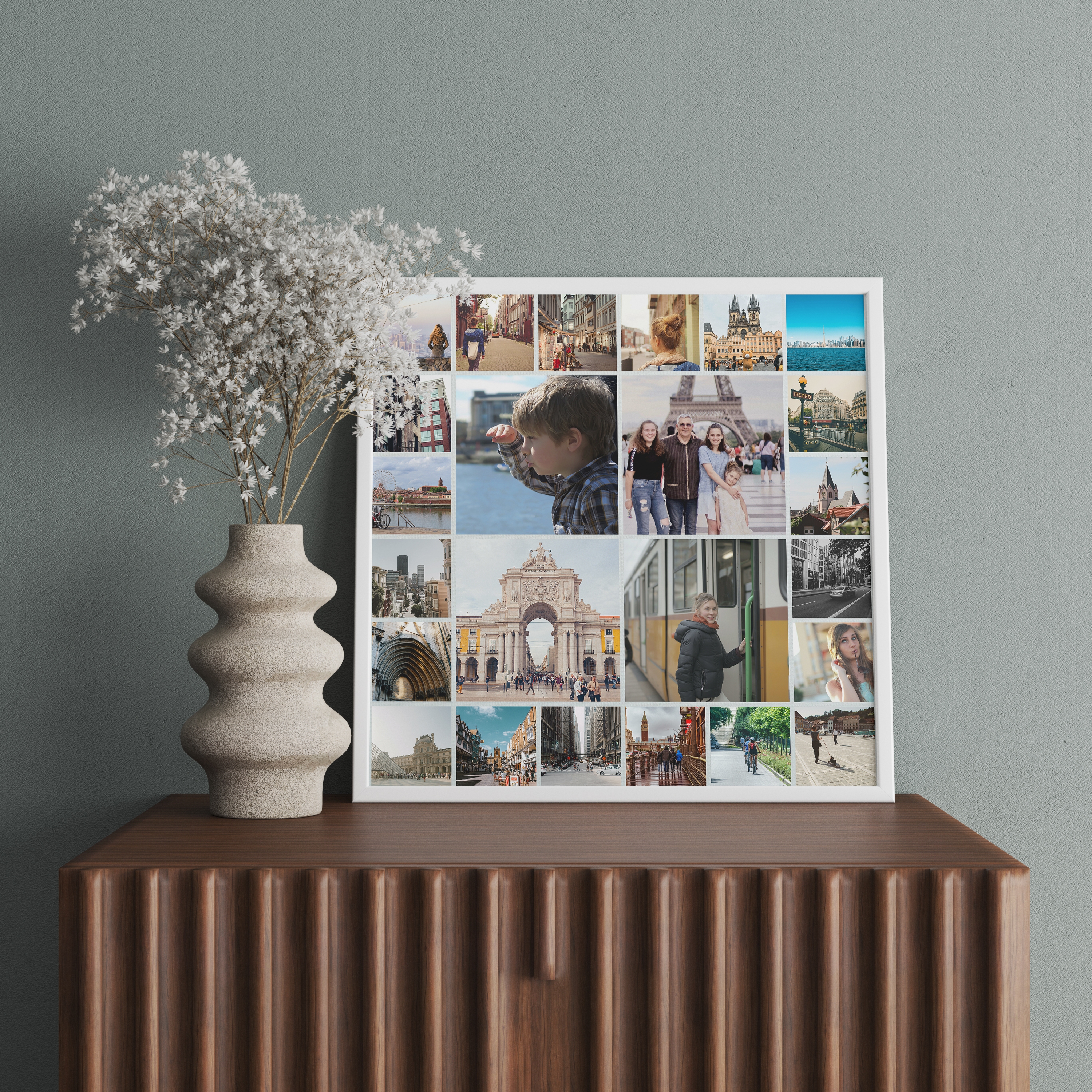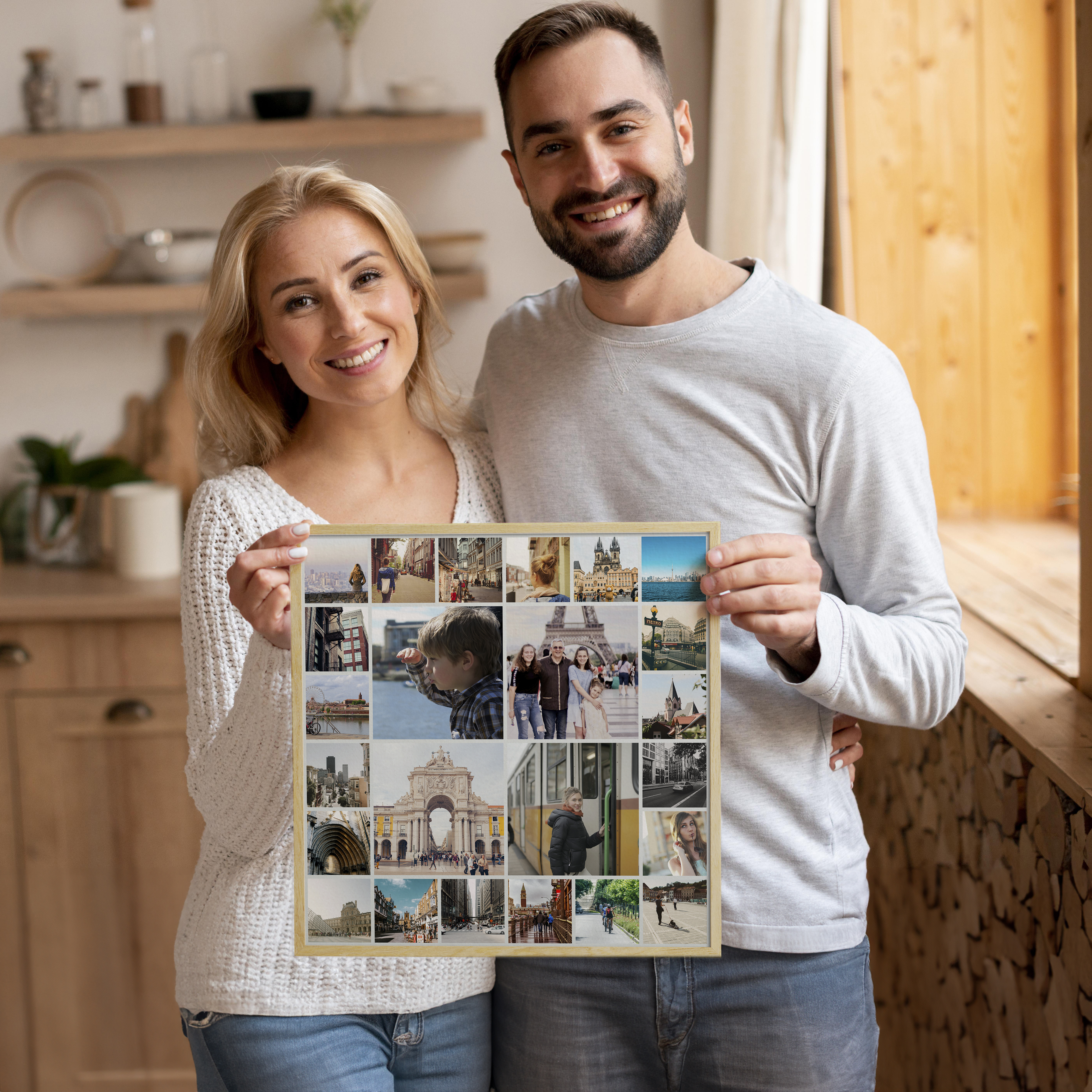 Our printing options use only premium materials to ensure your collage looks its best. From seidenmatt posters with UV protection to elegant framed prints in black, white, or natural wood, and durable Alu-Dibond or vibrant acrylic, each material provides a unique touch to your creation. Plus, you can also opt for a high-resolution download to print at your convenience.