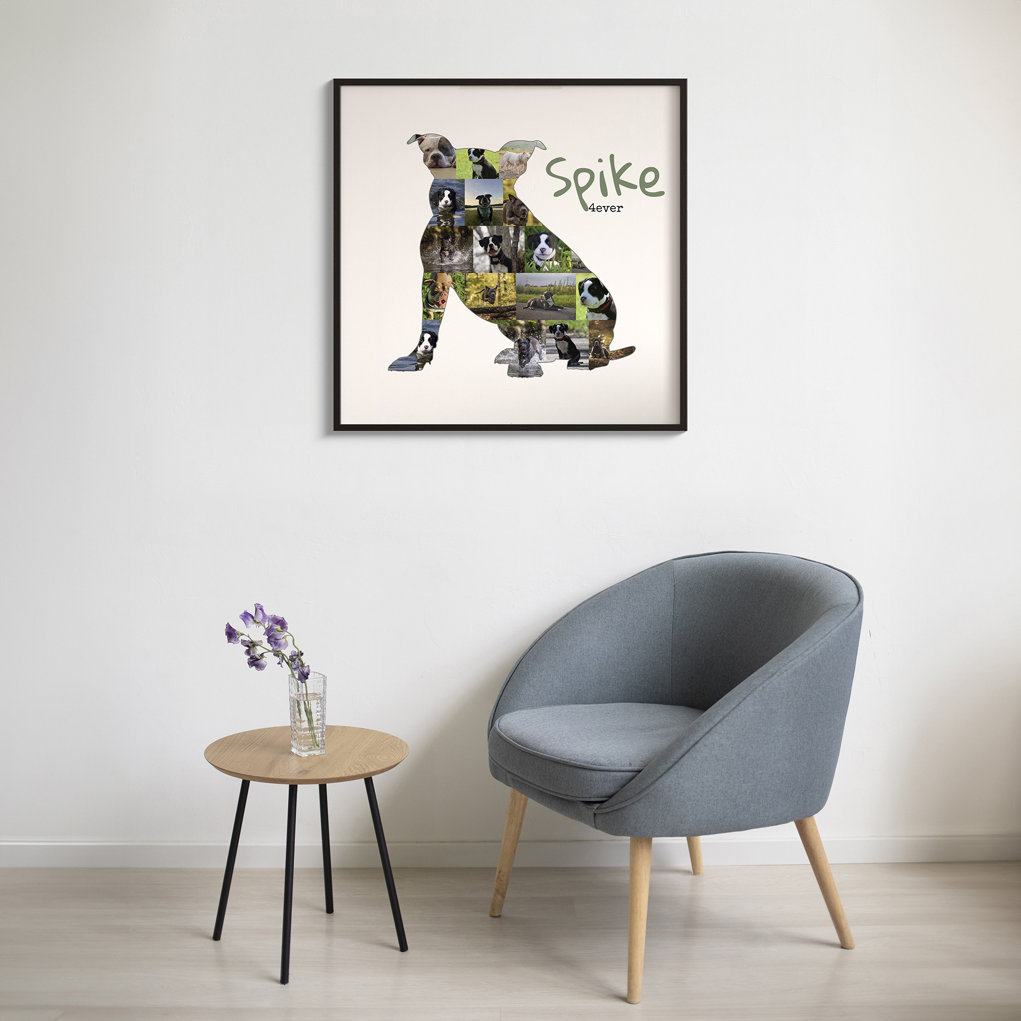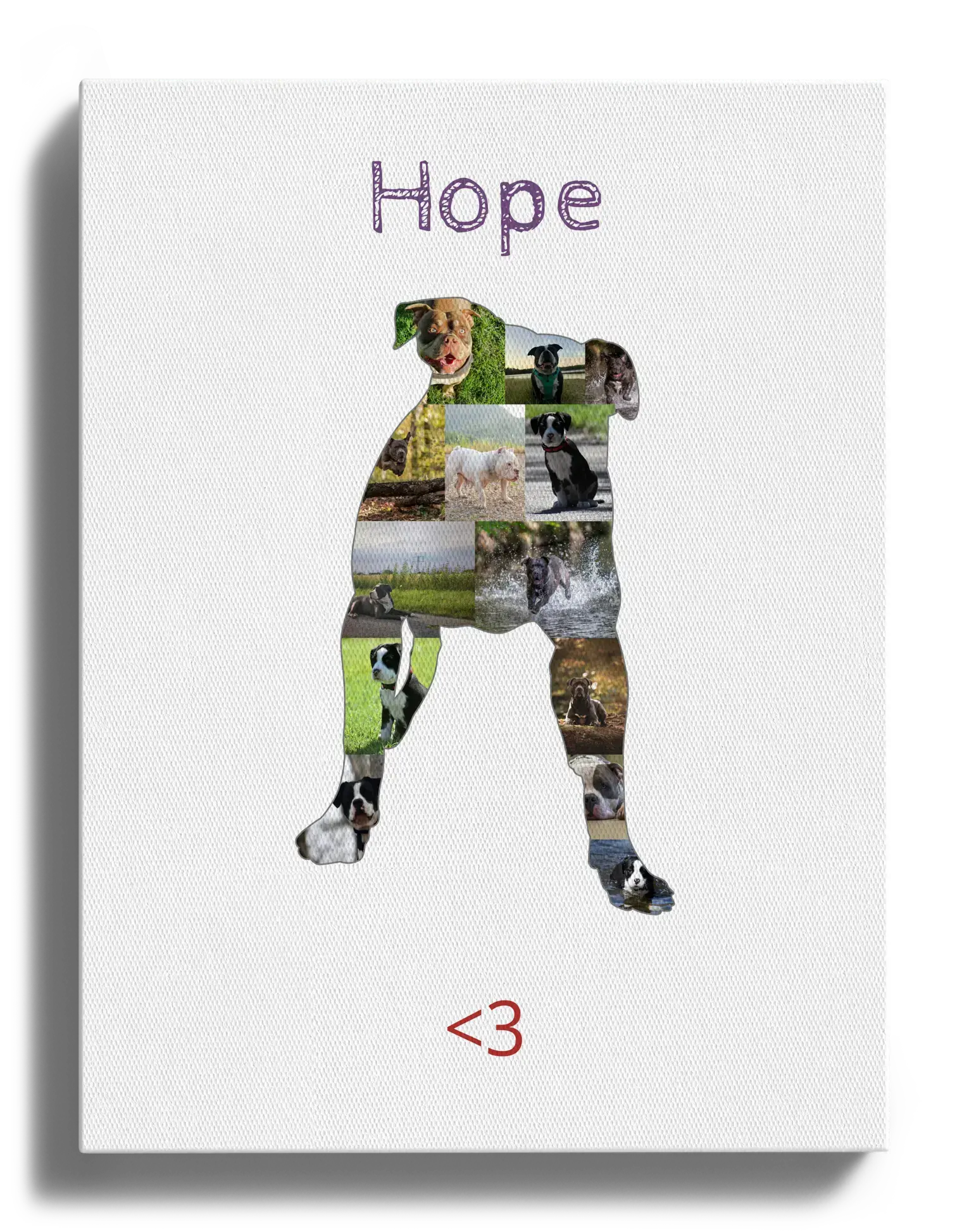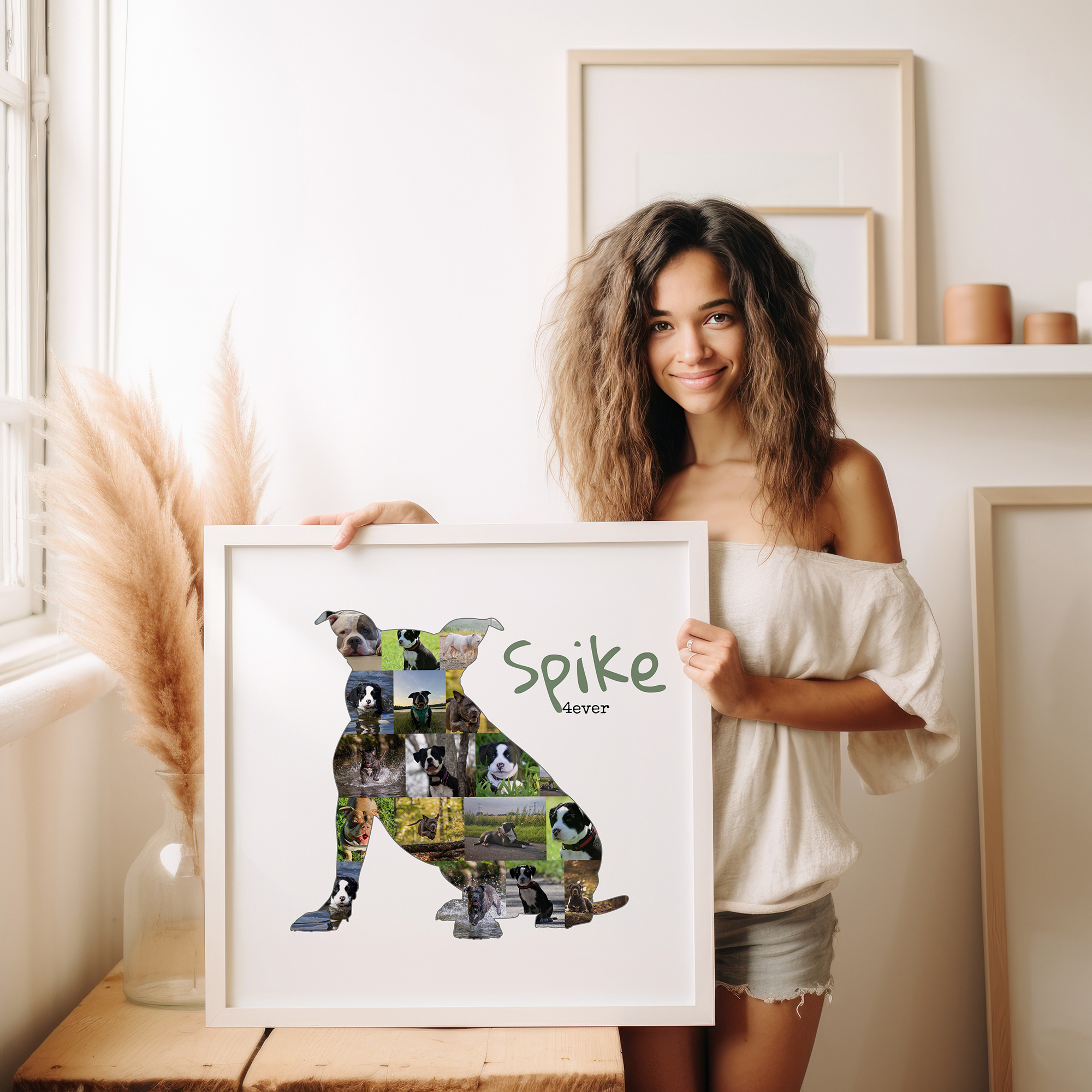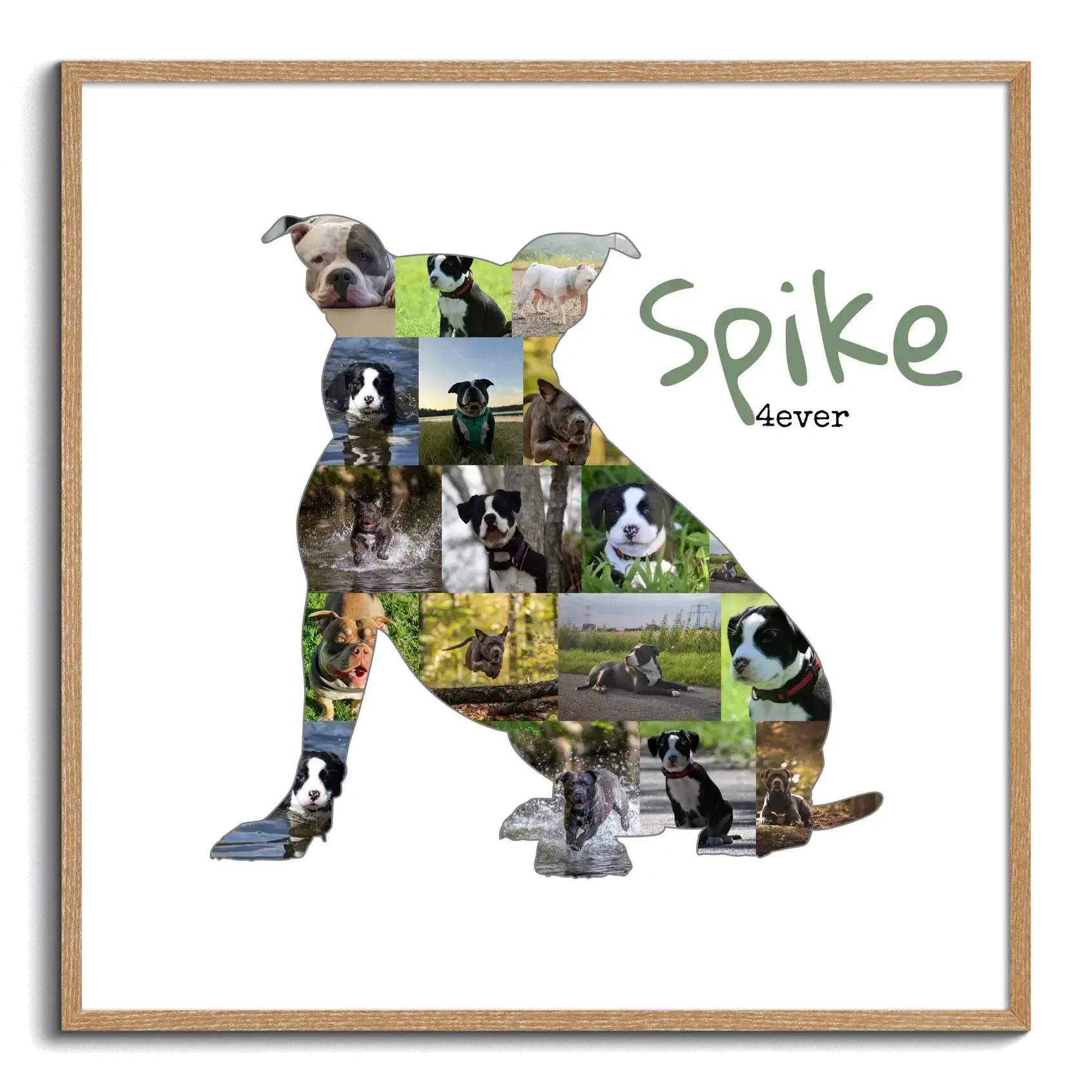 Create a unique tribute to your furry friend with our customizable American Bully silhouette photo collage. This heartwarming piece allows you to fill the silhouette of a sitting or standing American Bully with 15-20 of your own cherished photos. Add a personalized touch with your chosen text, such as 'Spike 4ever'. Perfect for dog lovers, this collage is a creative and memorable way to honor your beloved pet and can hang proudly in your home or be gifted to fellow dog enthusiasts. Customize the photos, silhouette, colors, and text to make it truly your own.