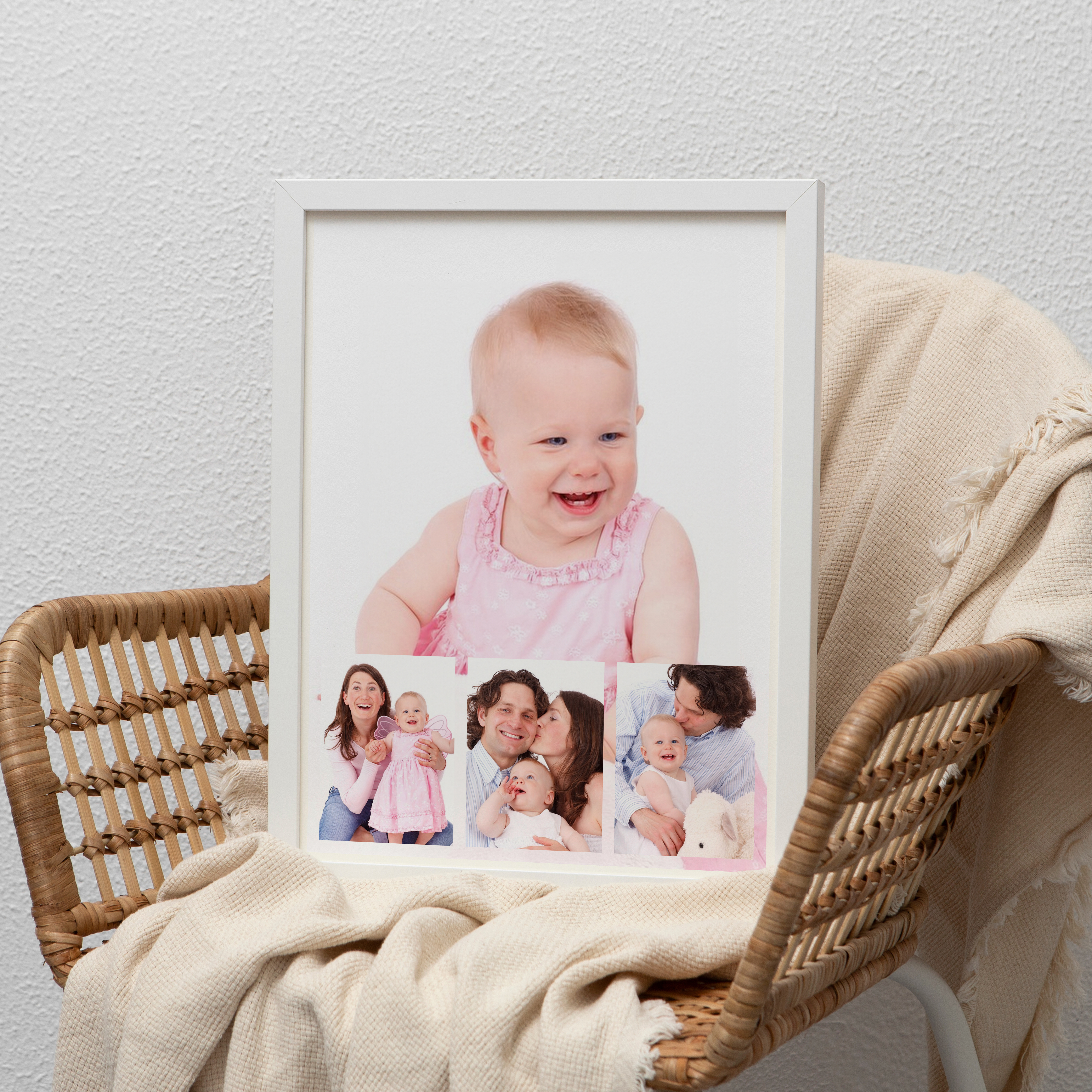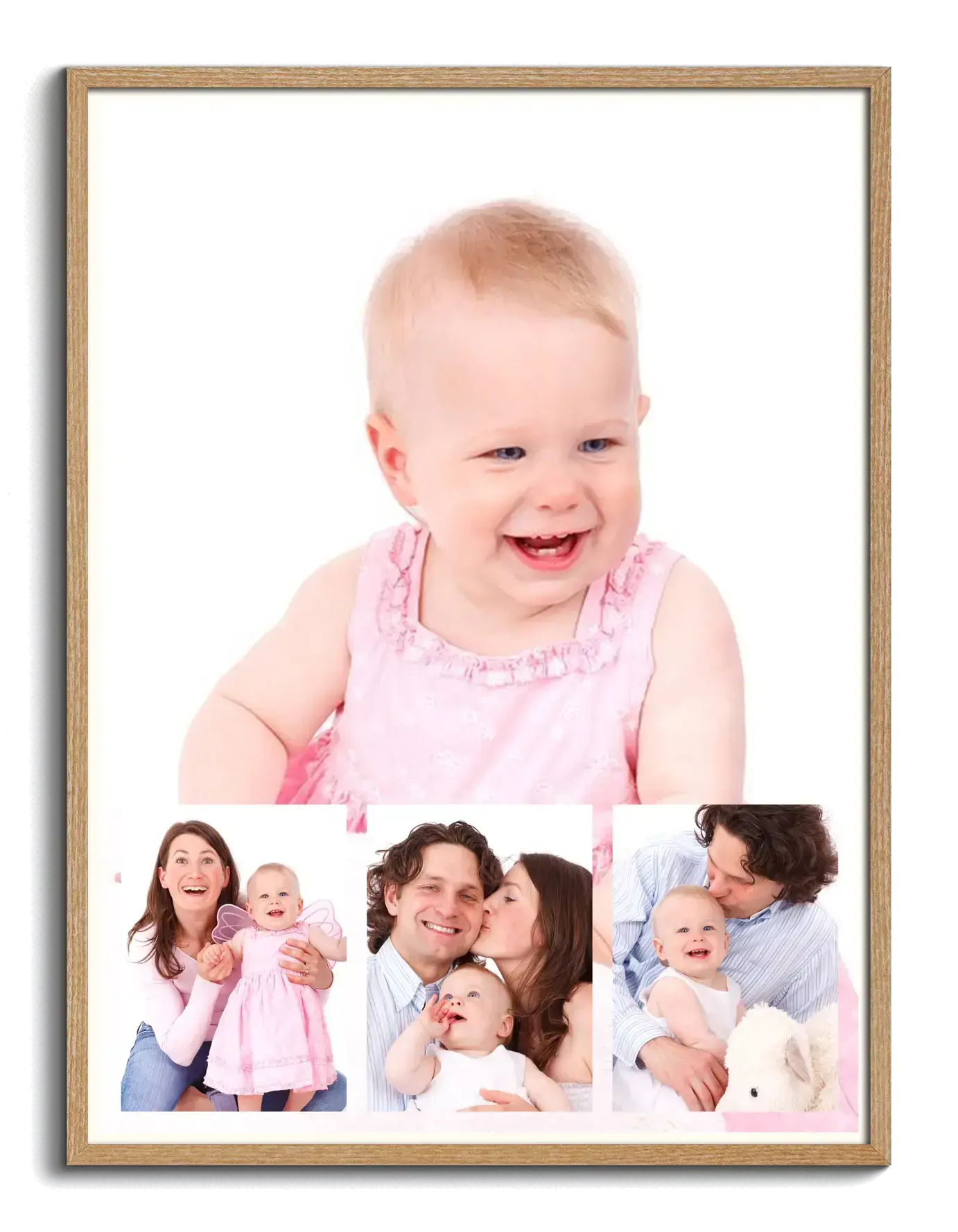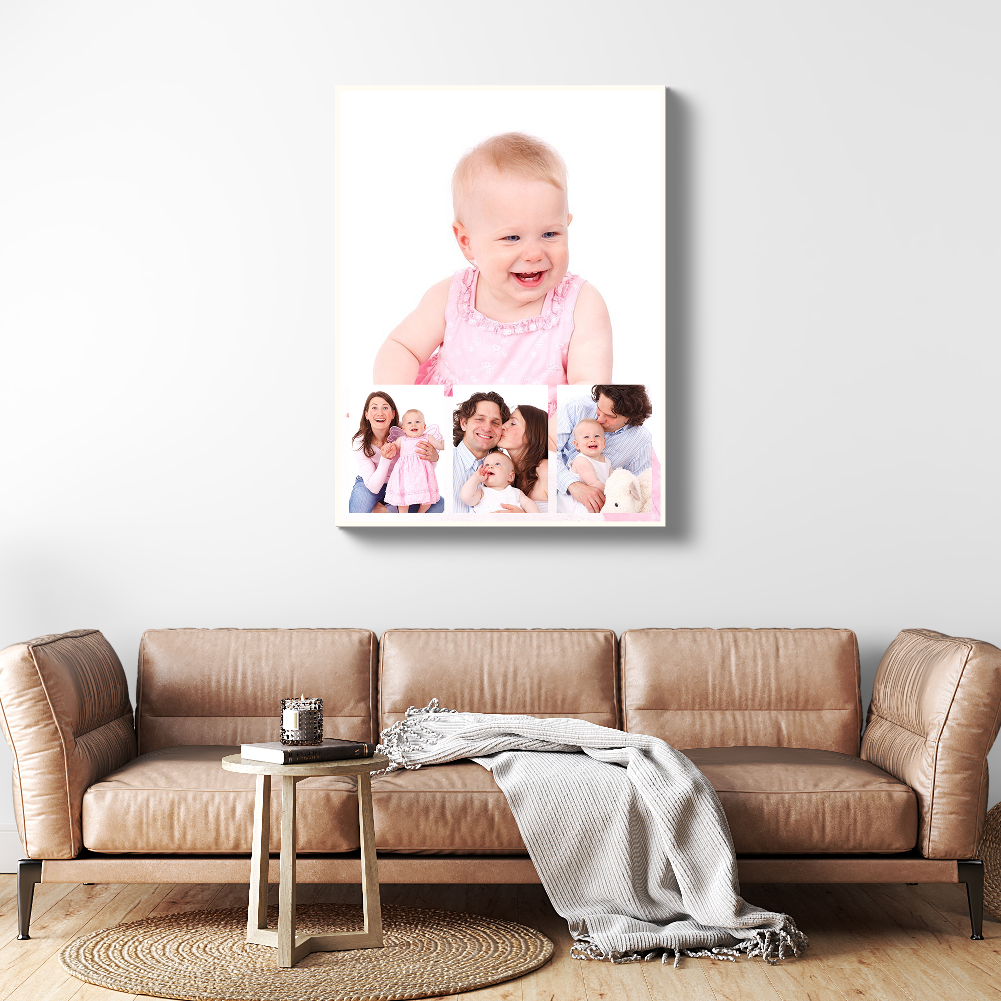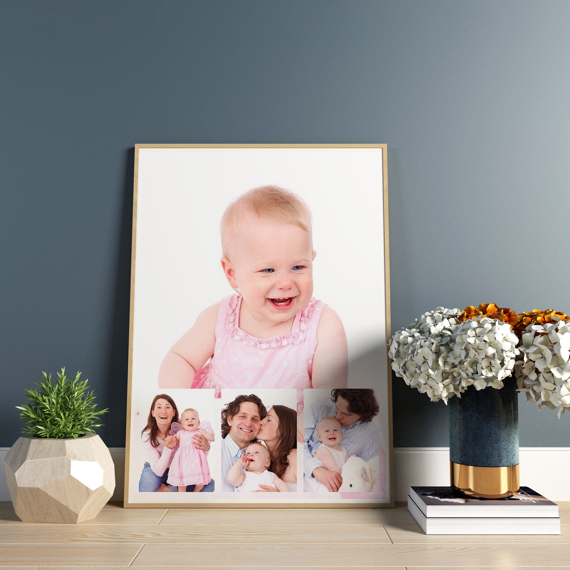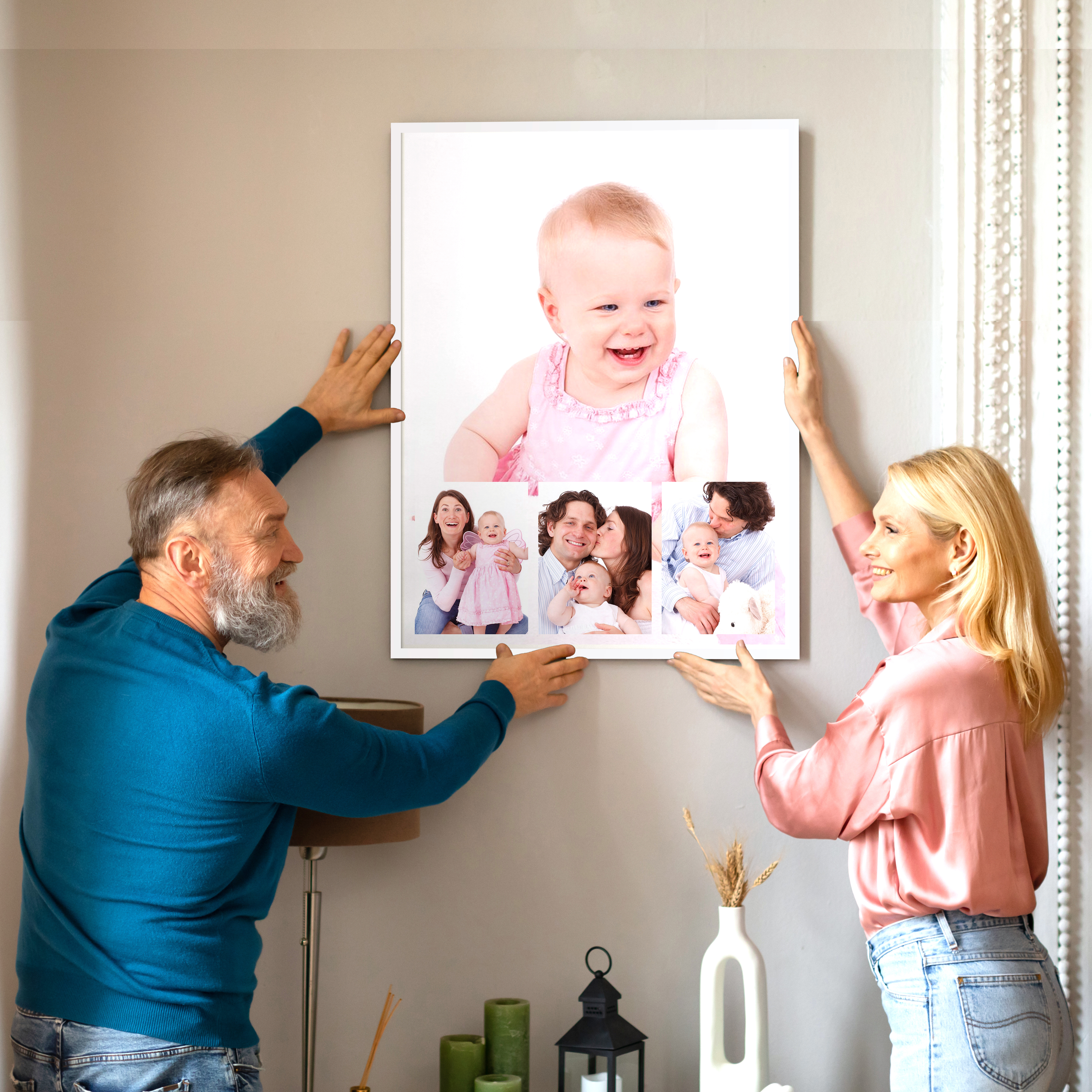 Create your own personalized family photo collage and turn memories into beautiful wall art. Imagine a large background photo of your loved ones, complemented by three smaller images elegantly arranged below. It’s the perfect gift for parents or grandparents and a wonderful decorative piece for your home. Use your favorite pictures to design this unique collage just the way you want it.