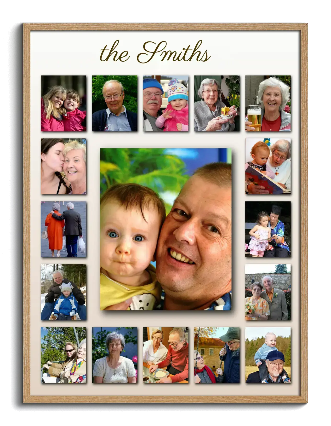 Create a customized family collage with a central photo and personalized text. Perfect gift idea.