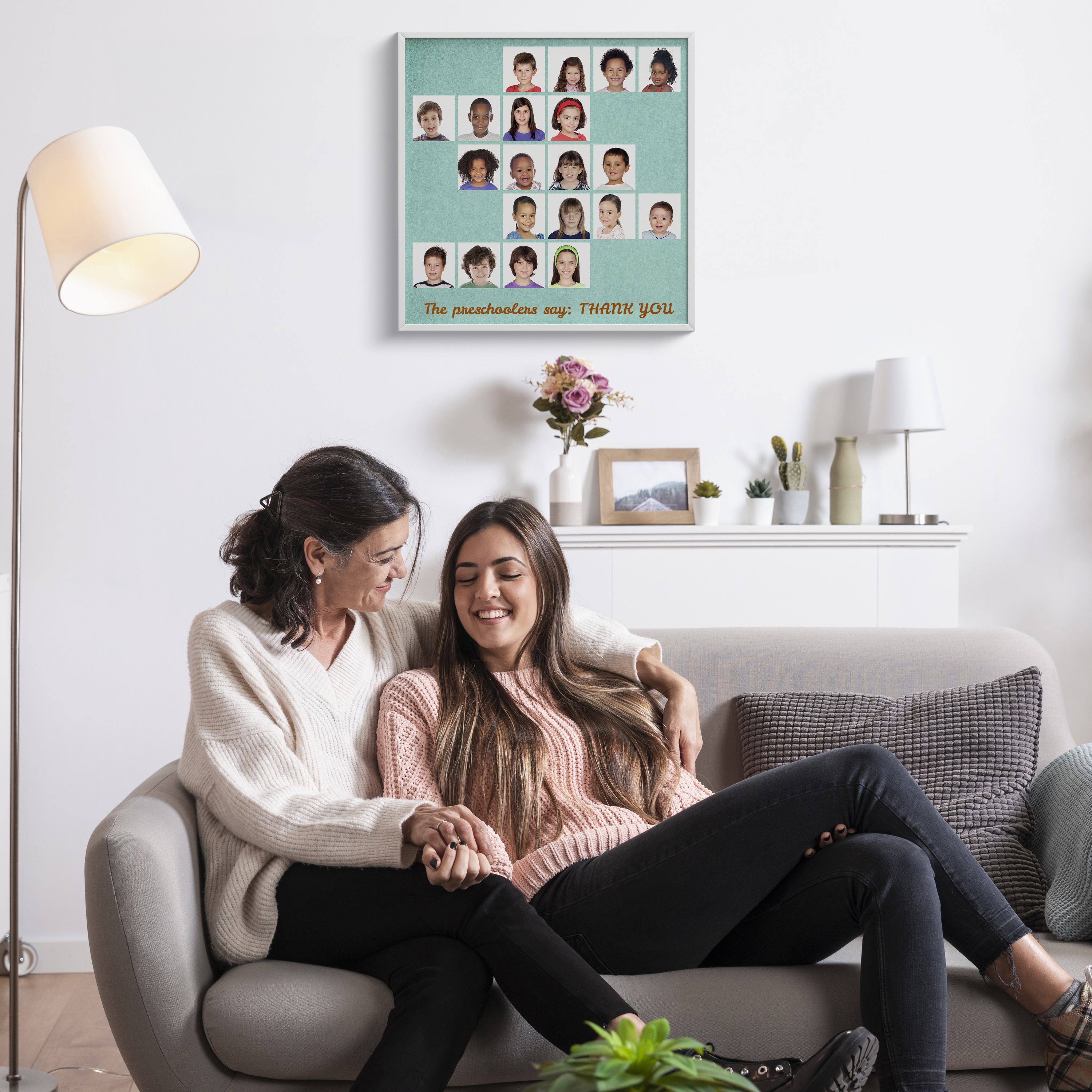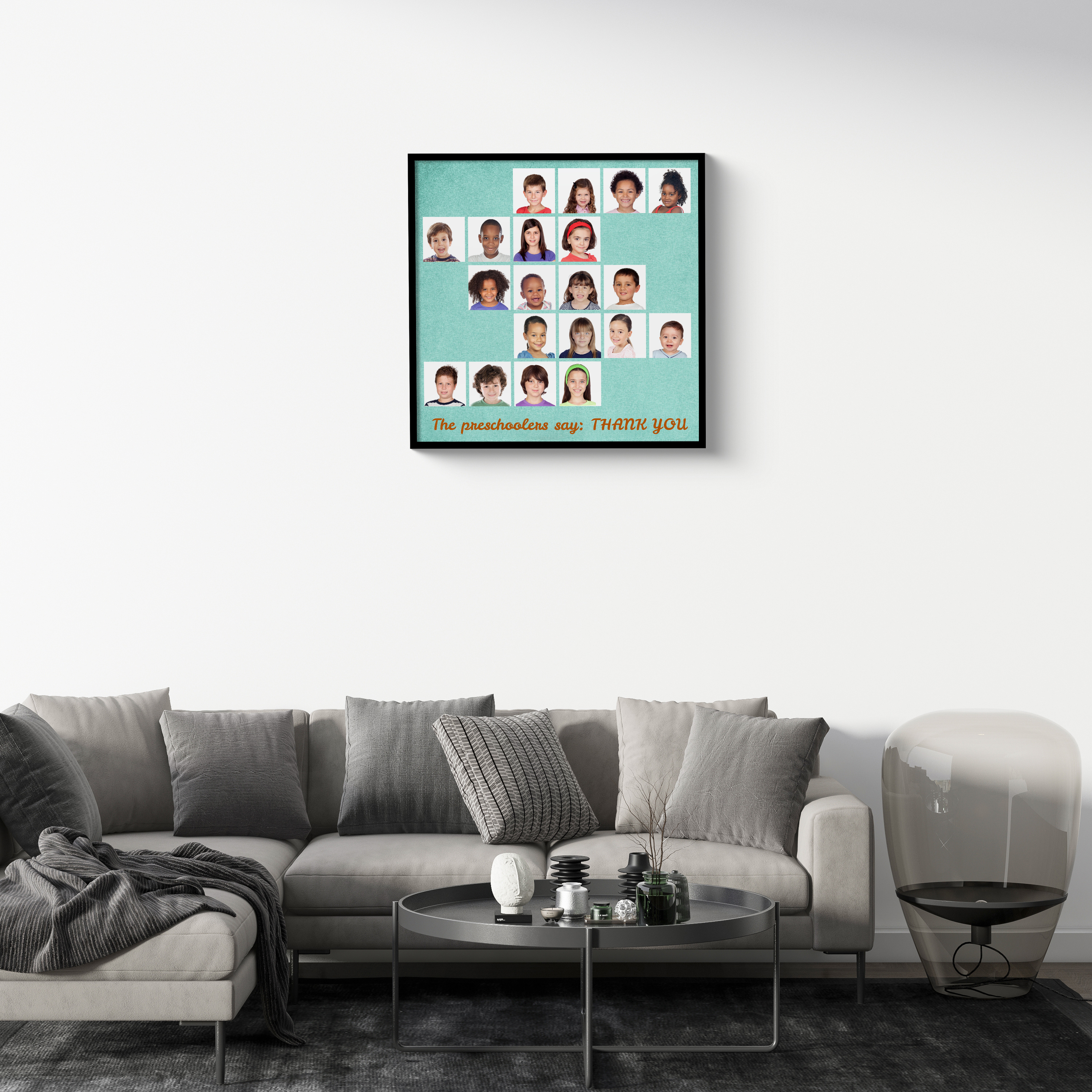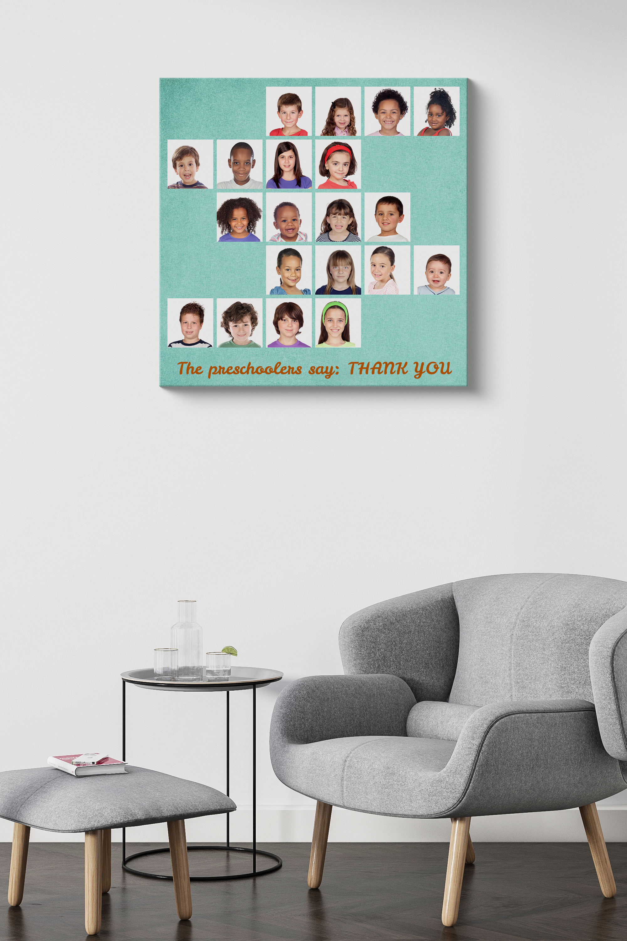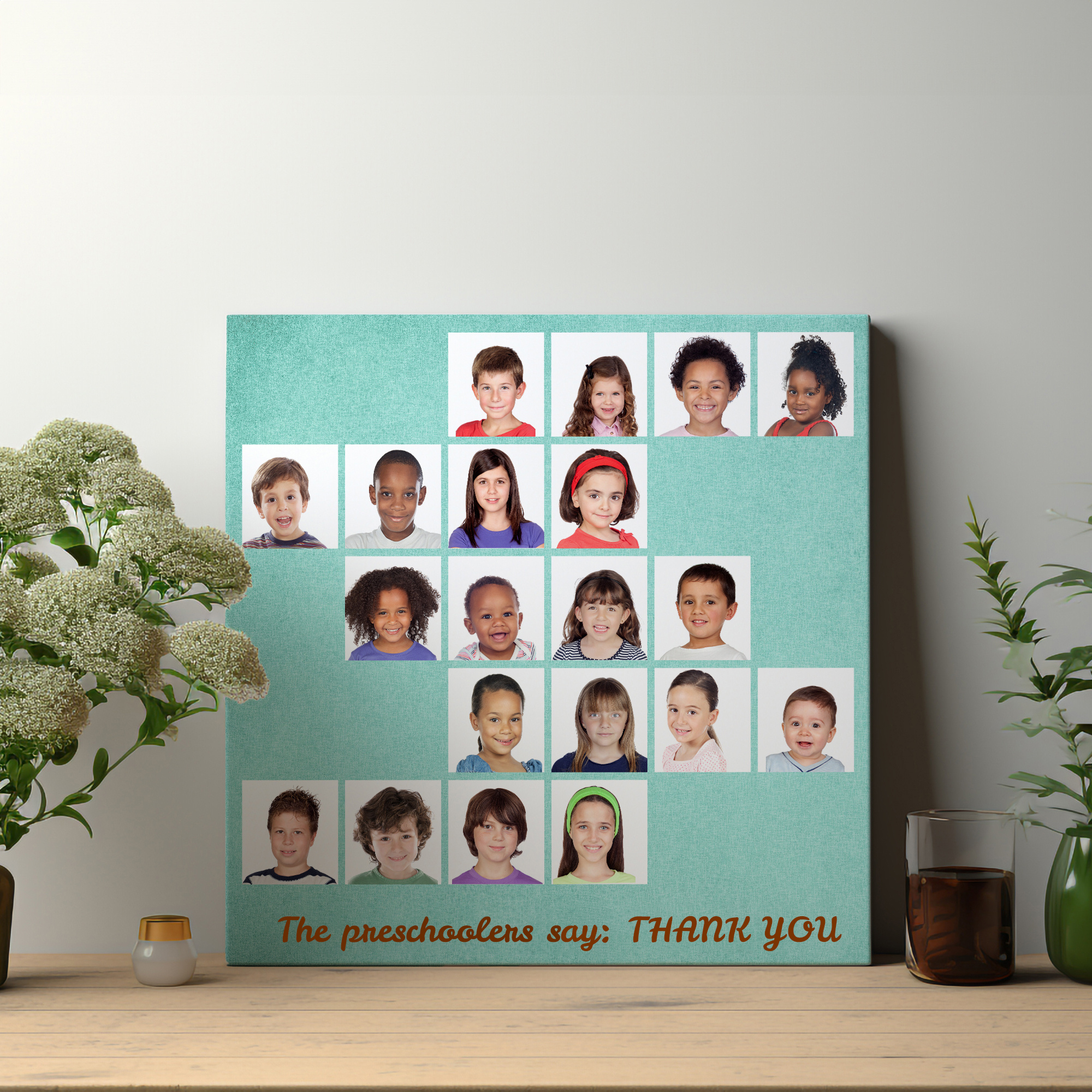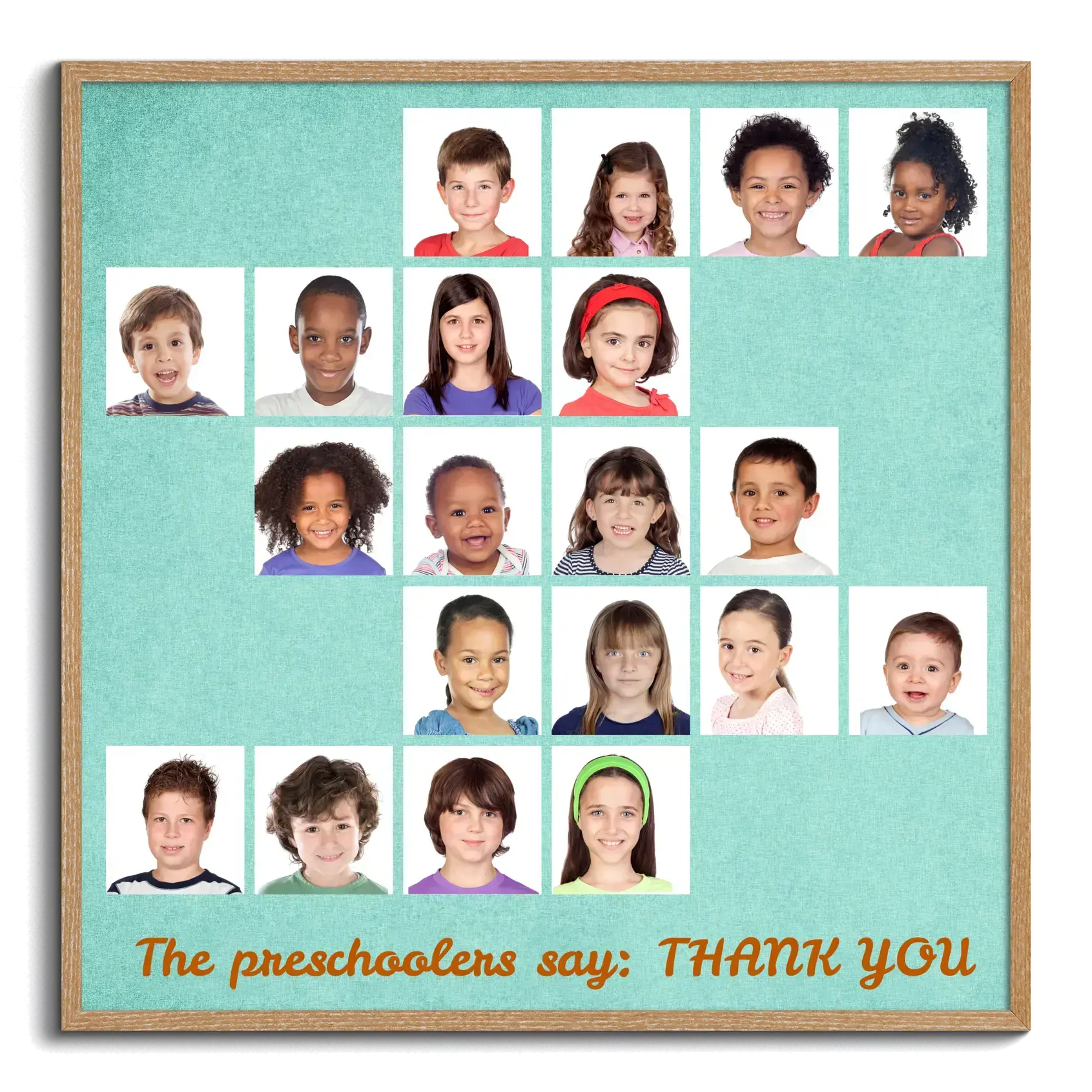 Create a unique collage for special moments. Imagine a farewell gift from your child's kindergarten class, featuring portraits of all the little ones set against a soothing mint backdrop, arranged in five whimsical rows of four. It's completed with the text "The Preschoolers Say: THANK YOU" – making it a perfect gift for teachers, a group room display, or a cherished memory for parents. Customize every aspect, from photos and texts to colors and layout, to match your vision.
