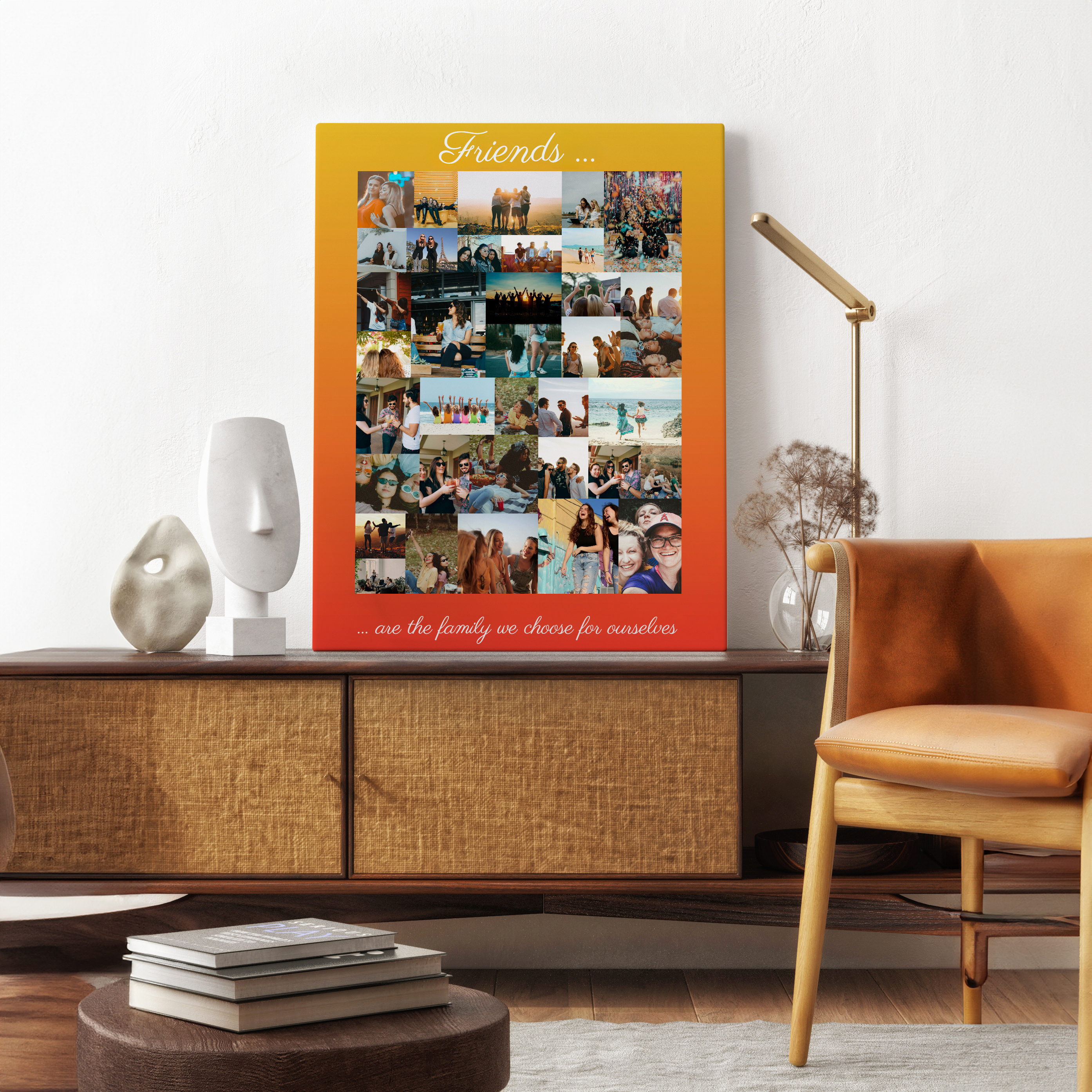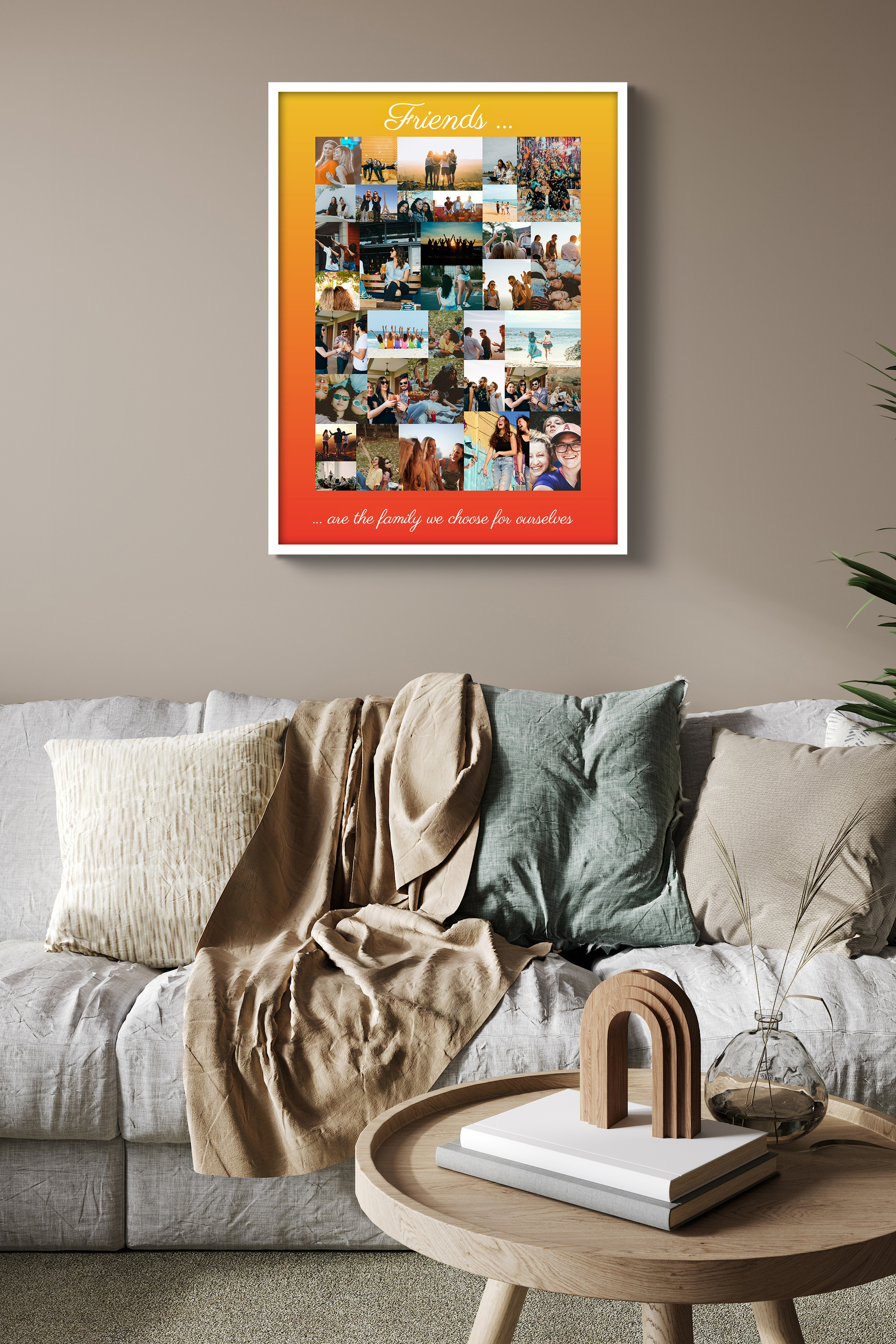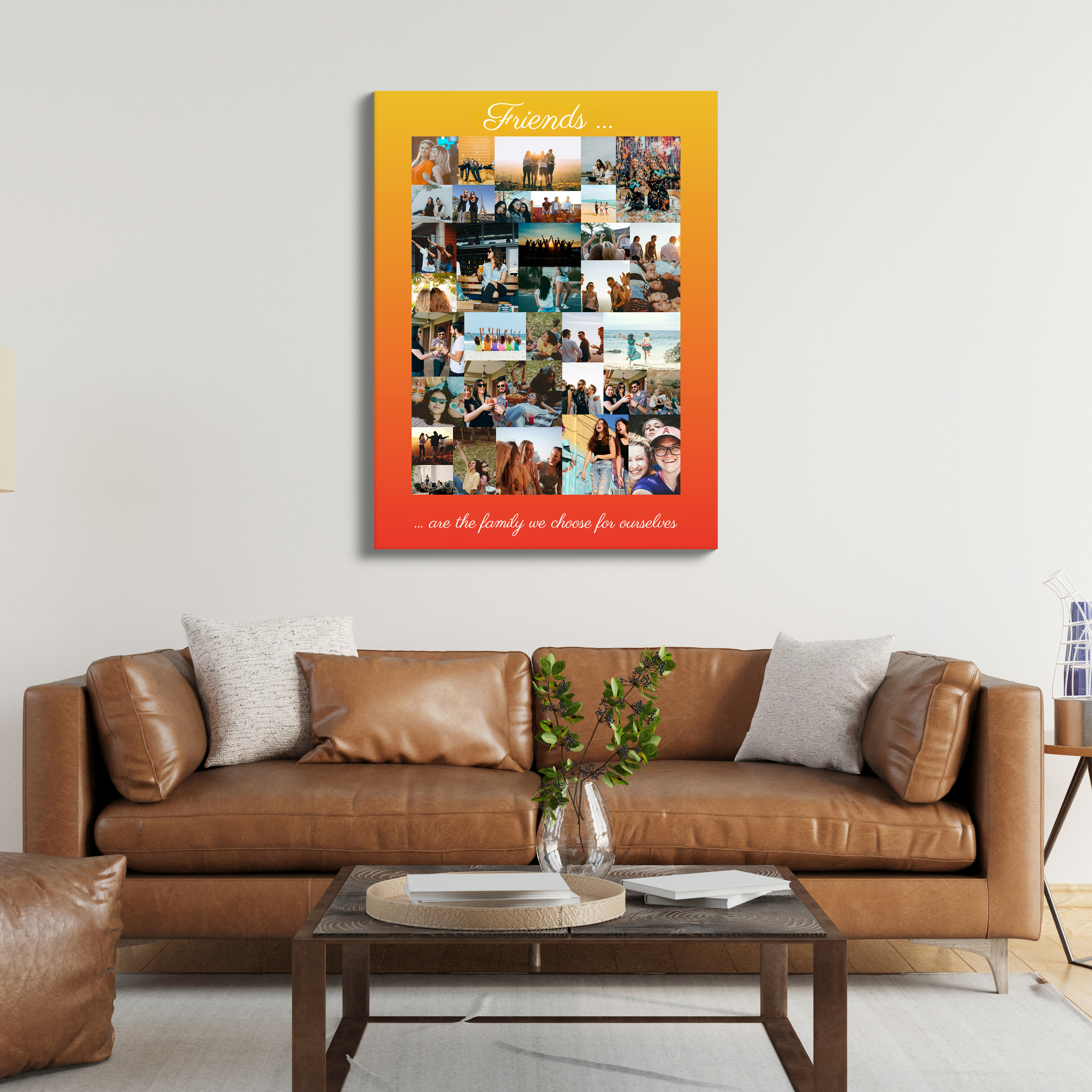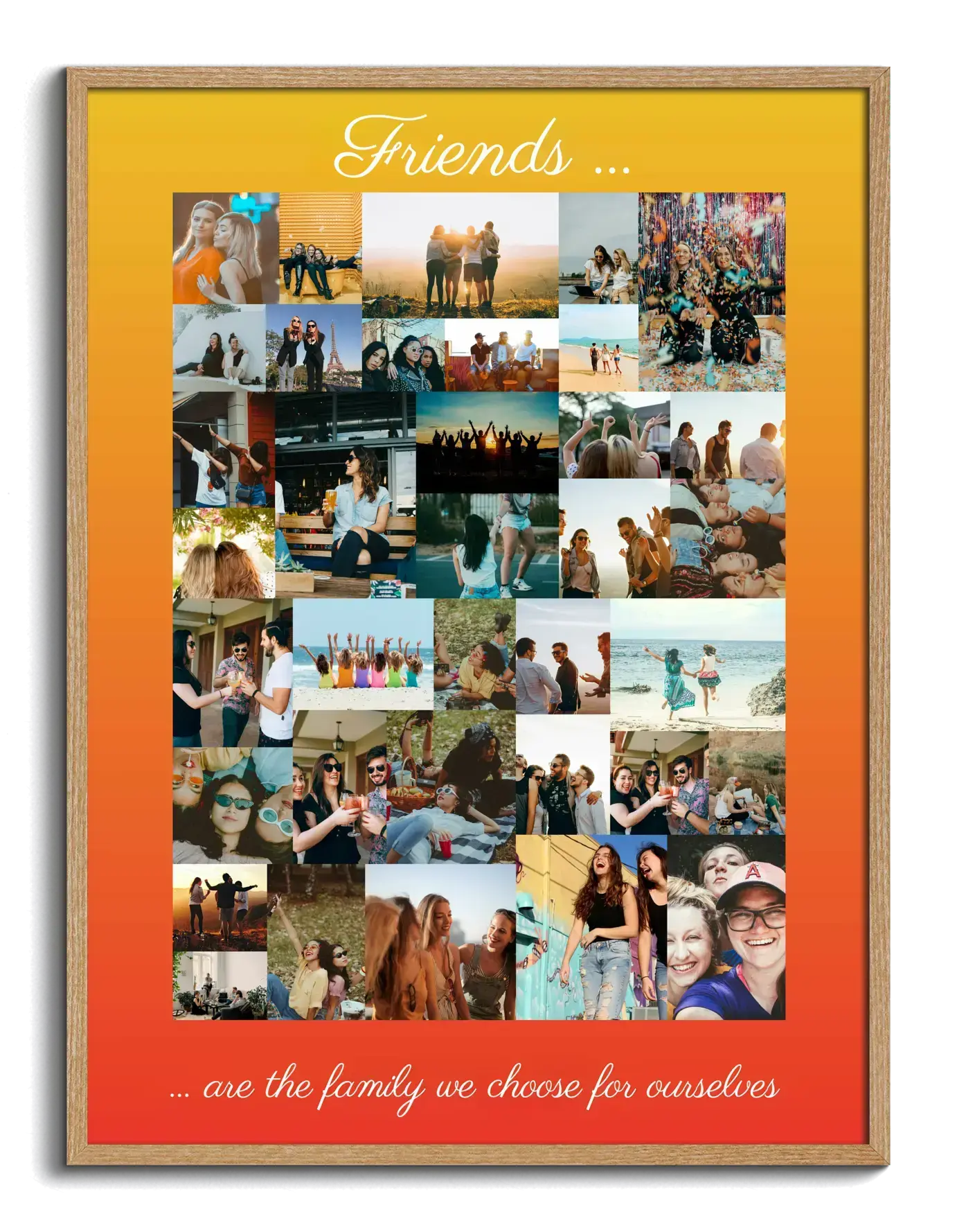 Create a memorable photo collage that captures your cherished moments. This customizable vertical photo collage features a dynamic, wild arrangement of pictures against a vibrant yellow-orange background, displaying various images of friends in different sizes. Accompanied by the heartfelt text "Friends are the family we choose," it's perfect for celebrating friendships. Ideal as a personalized gift for best friends or as a decorative piece in your home, every element, from photos to text, background color, font, and layout, can be tailored to your liking.