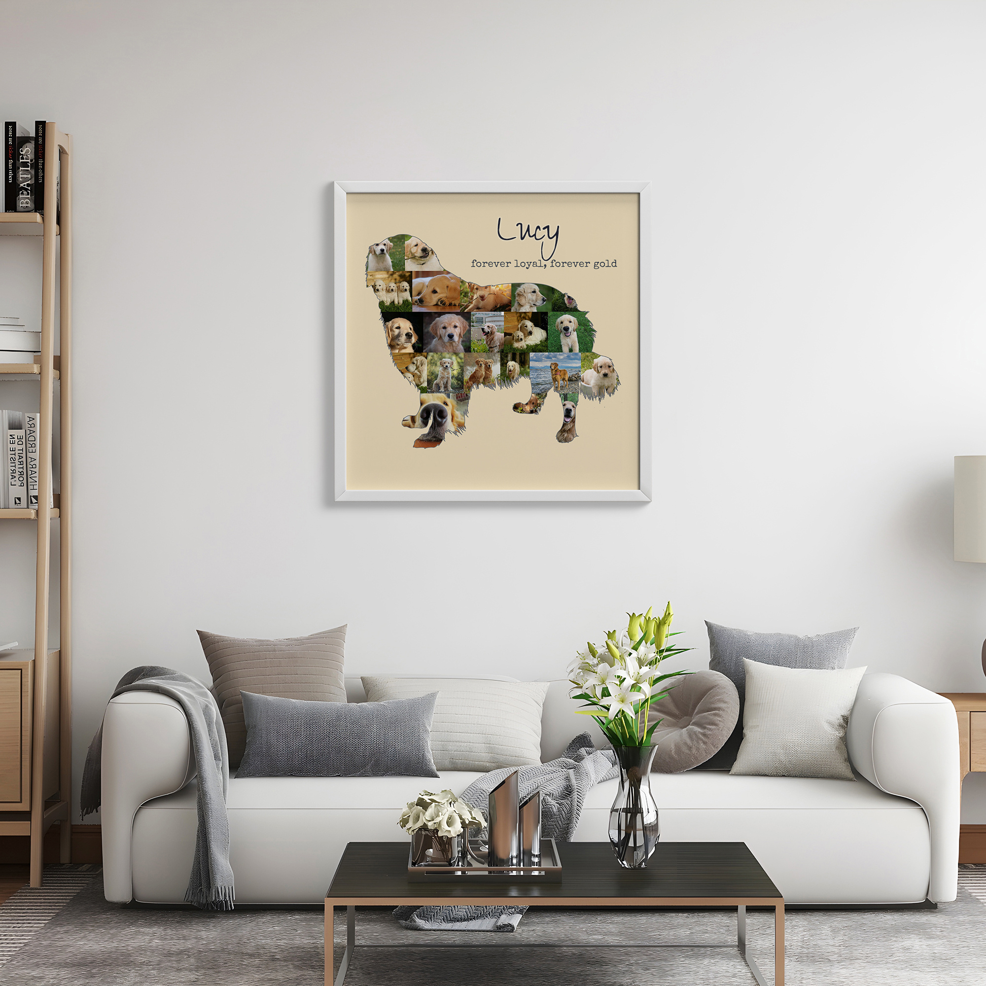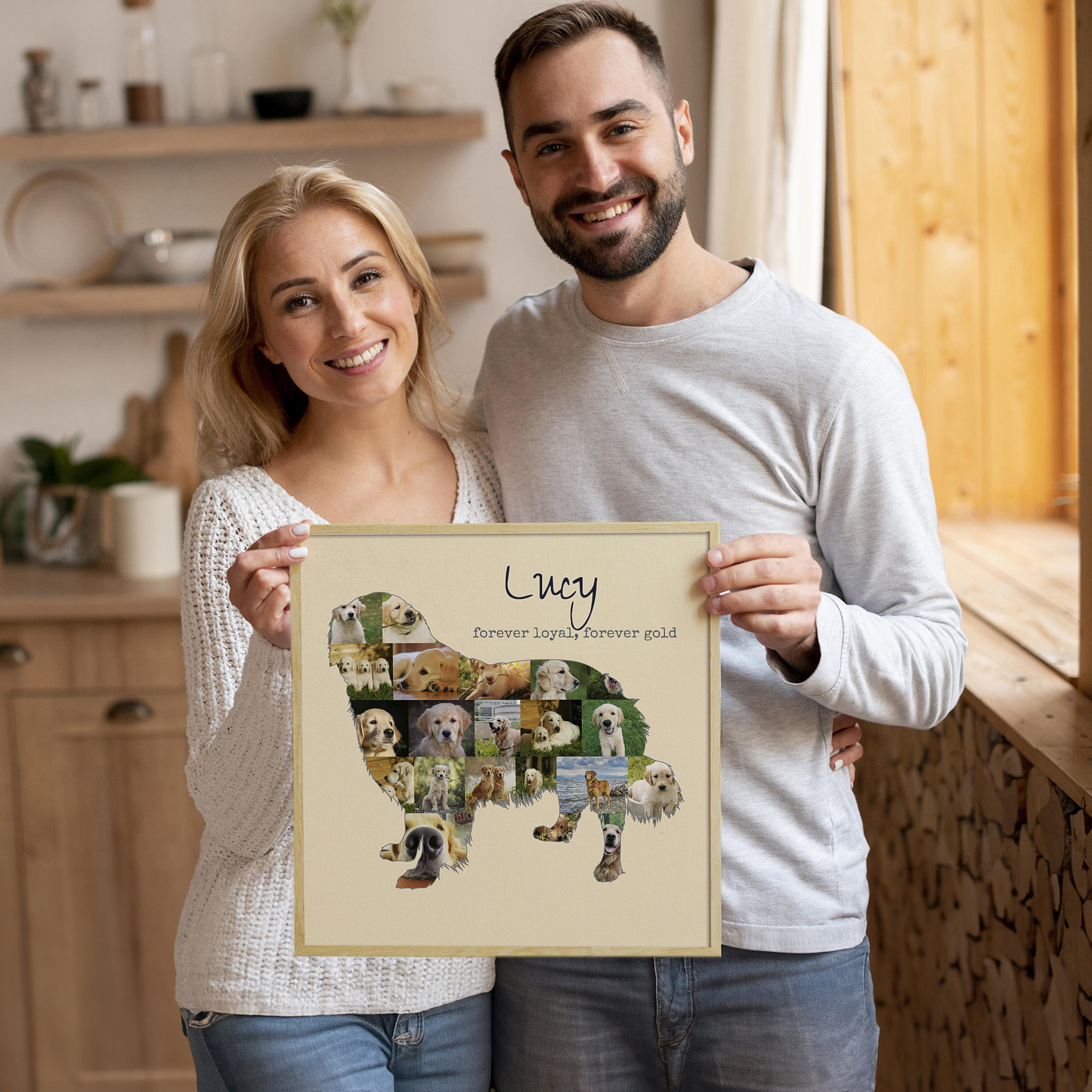Create a cherished keepsake with our personalized Golden Retriever photo collage. Celebrate your furry friend with a silhouette design, filled with 15-20 of your favorite photos. Personalize it further with a heartfelt text like "forever loyal, forever gold" or "sunshine on four paws." This collage makes a wonderful decorative piece for your home or a thoughtful gift for fellow dog lovers. Customize the photos, silhouette, colors, and text to make it truly unique.